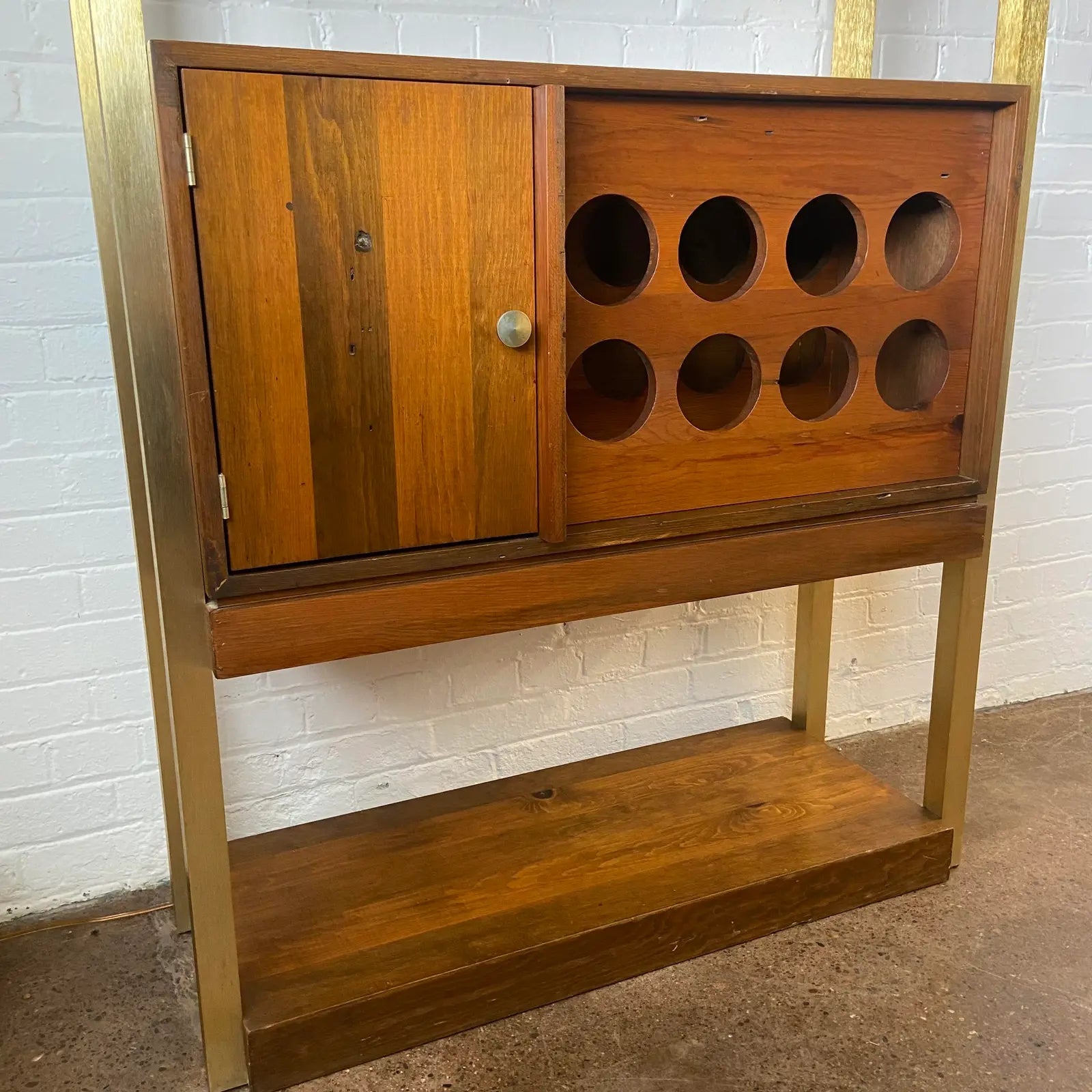 Mid-Century modern tall vertical bar cabinet / shelving unit with plug-in overhead light. Featured steel frame with brass finish, solid gum wood shelving, wine rack, and bar cabinet with door and enclosed storage component. Glass shelf come off, and above is a plug in (working) light fixture with brass finish and a small interior light inside wine rack . Great piece for vertical, shallow storage, to store and tuck away items and also to showcase.