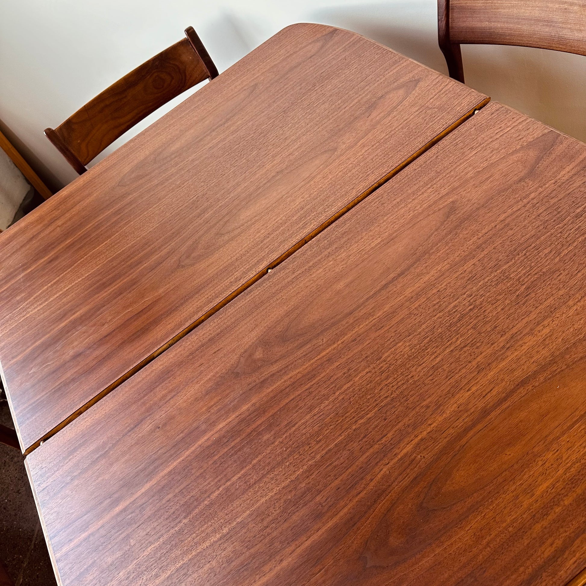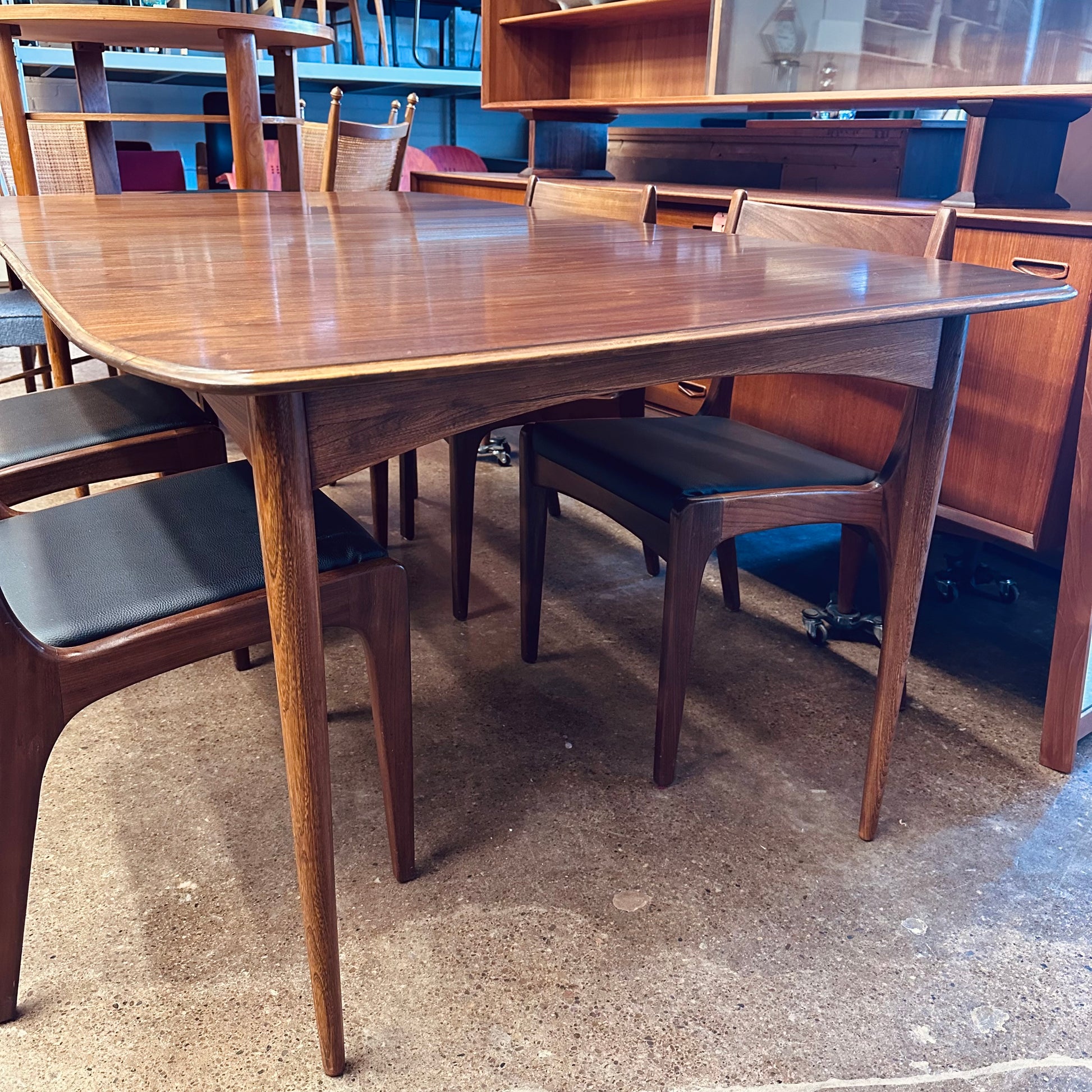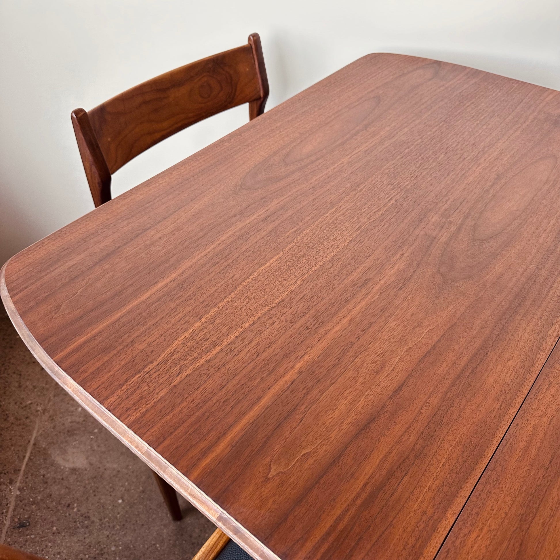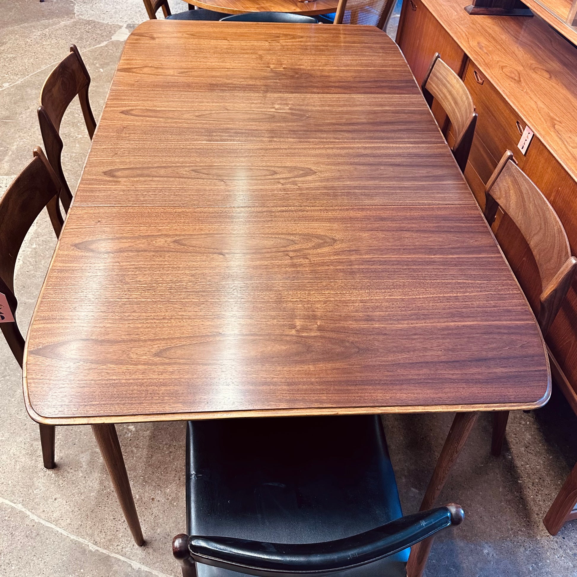 Canadian walnut dining table with two 12” leaves rectangular in shape with rounded corners. Features solid tapered legs, beveled edge detail, seating for 6-8, and refinished throughout. Made of walnut however will coordinate with mid-tone teak dining chairs as pictured. Legs are bolted and can easily be removed for shipping.