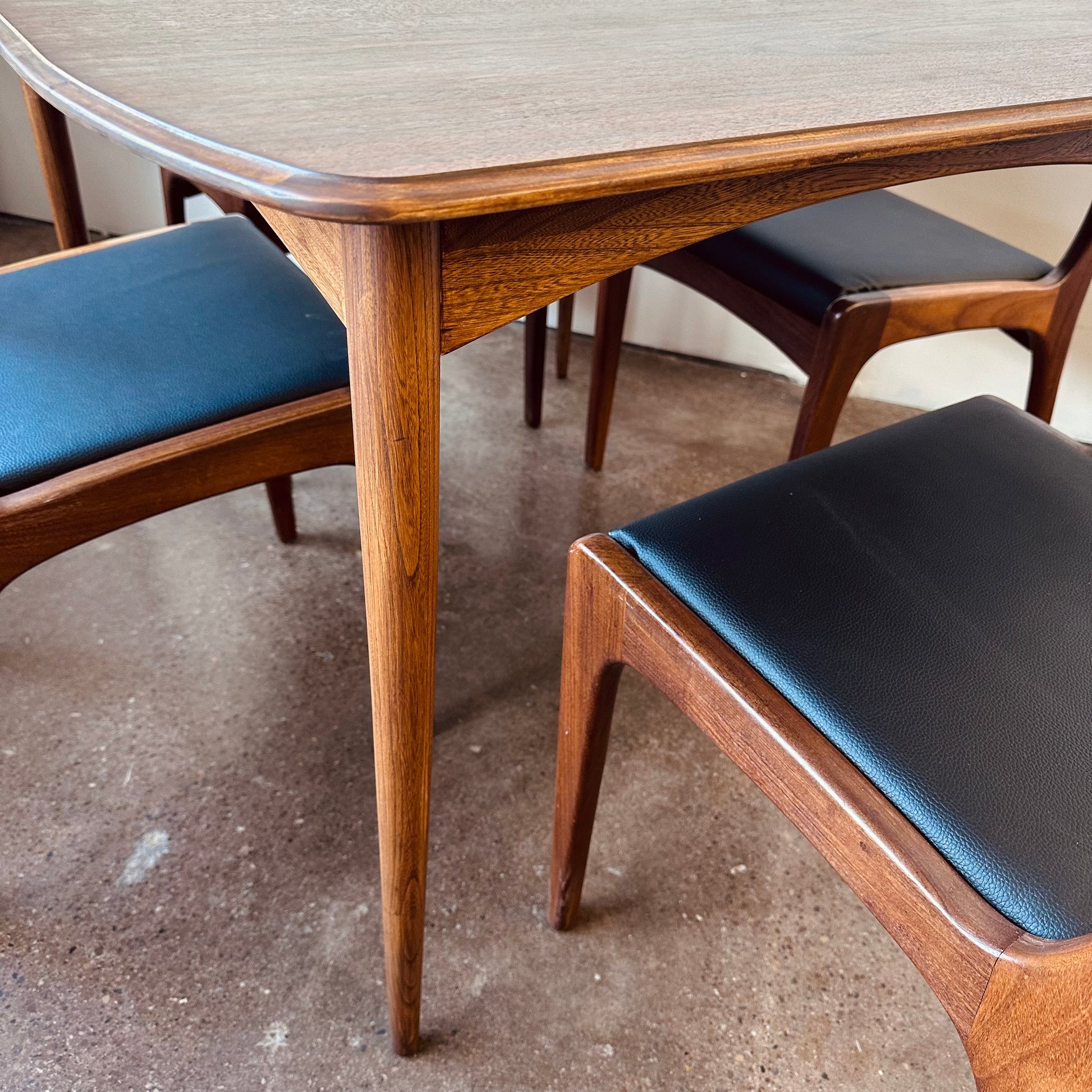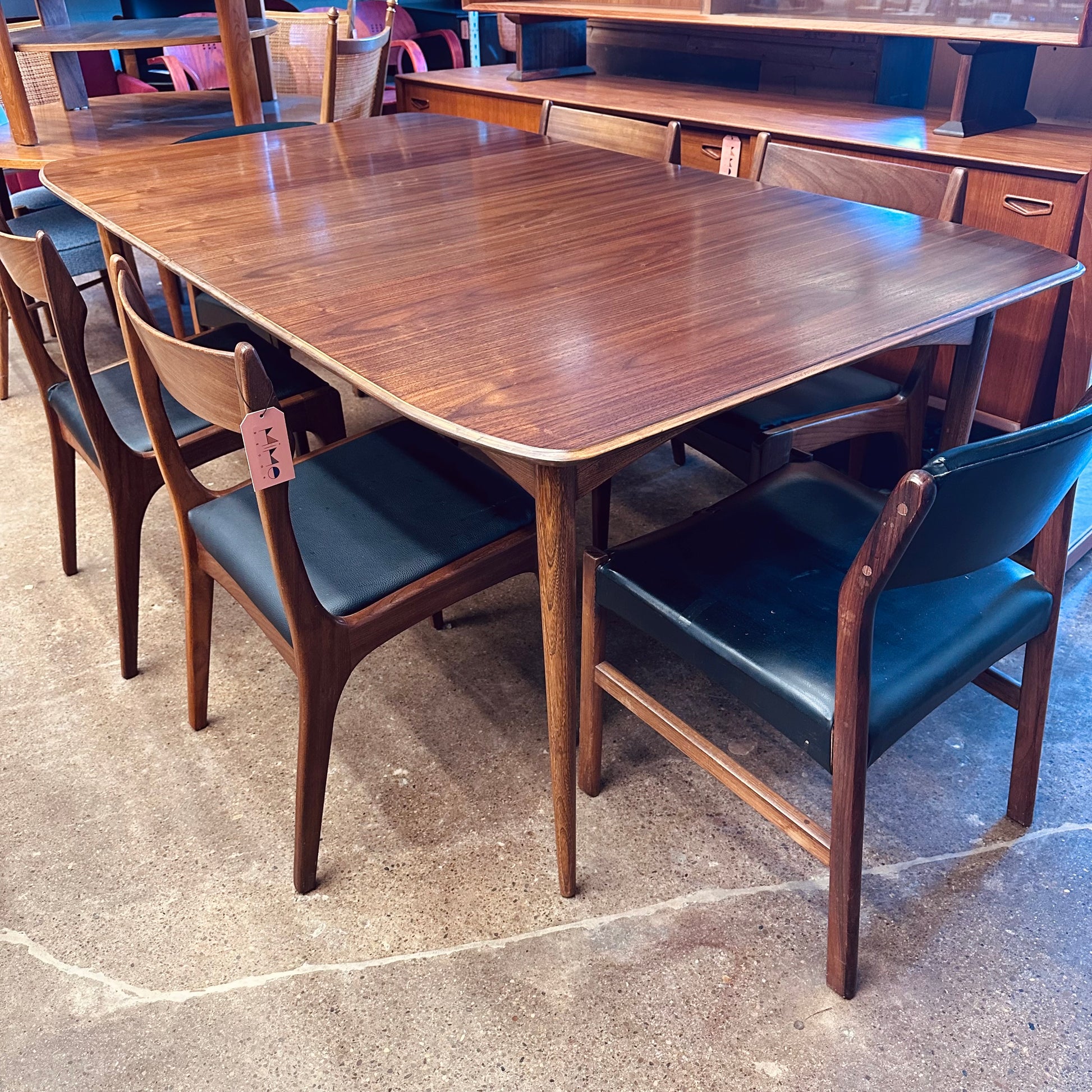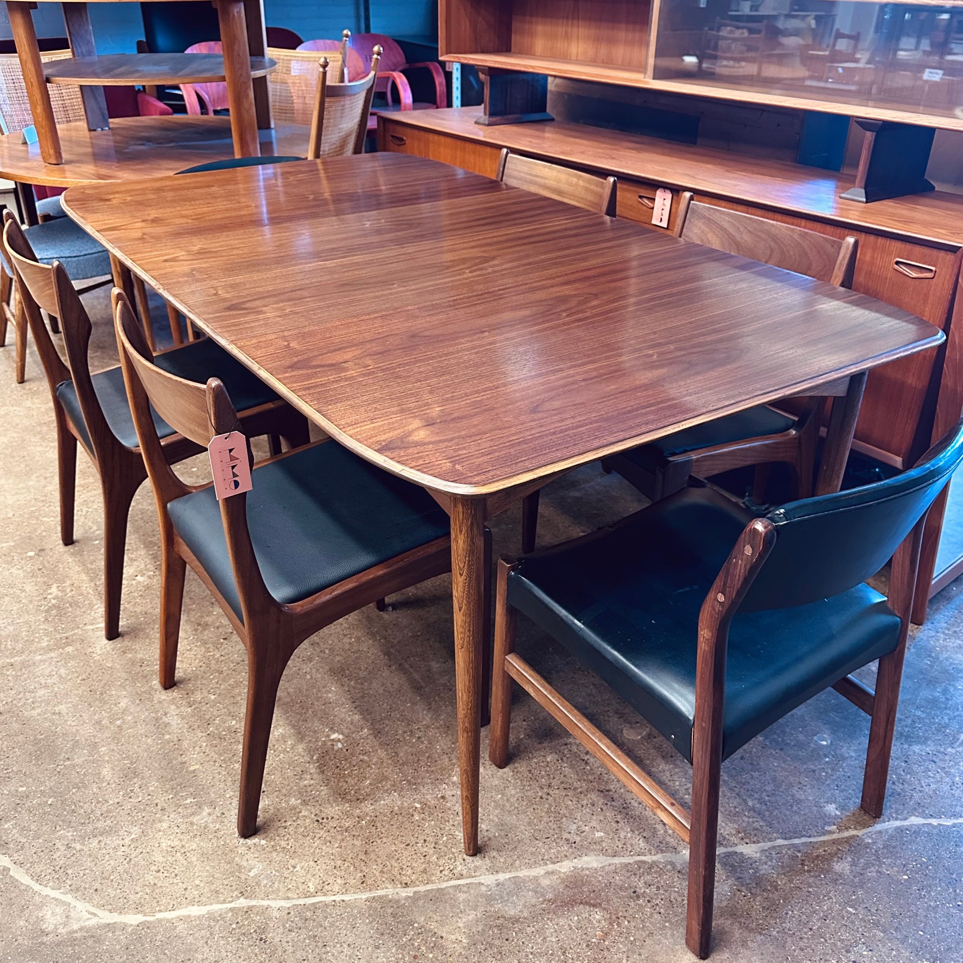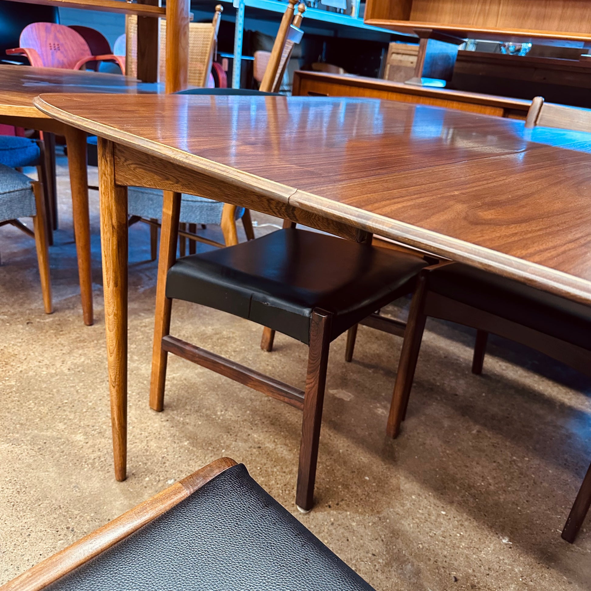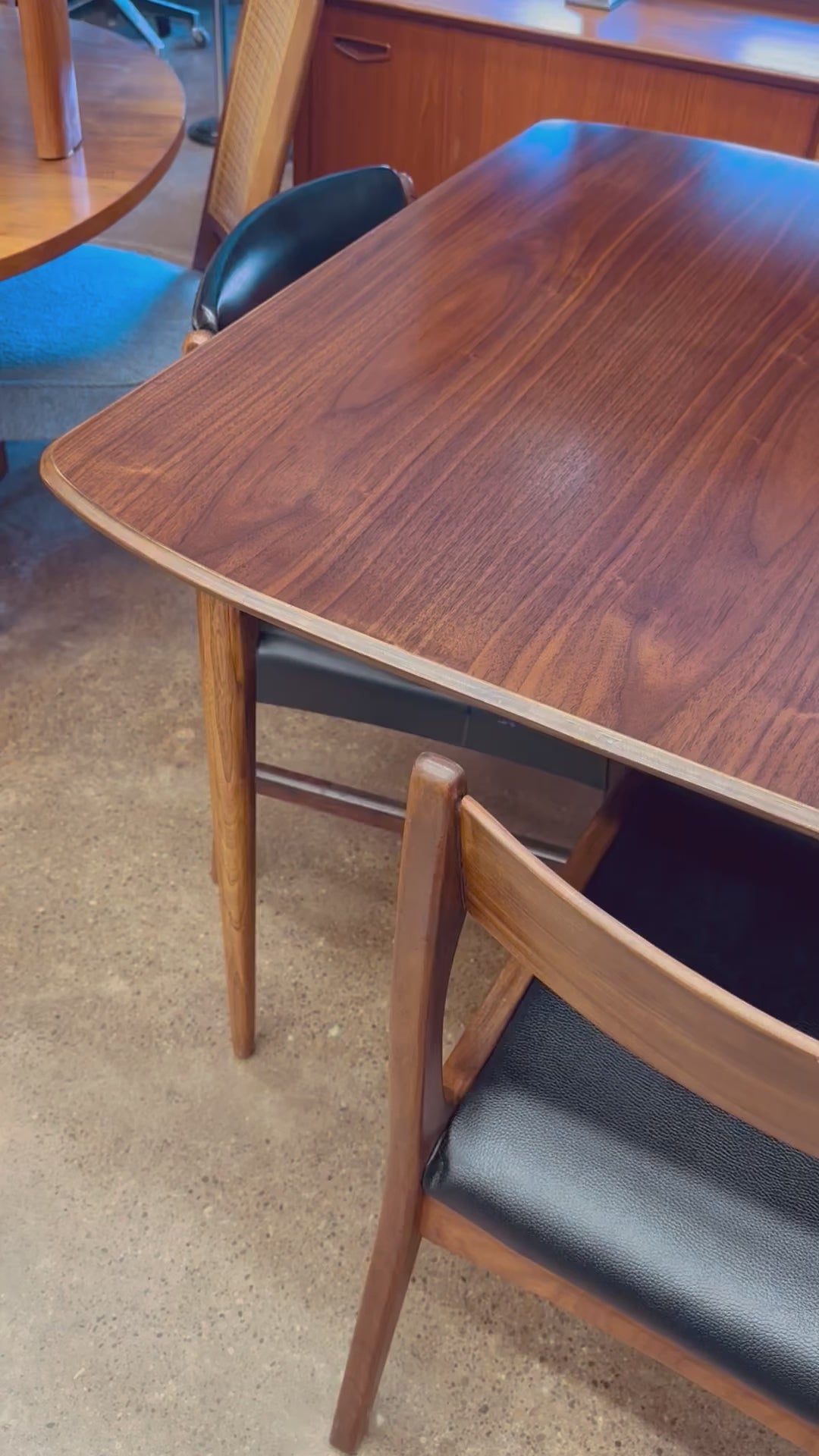 Canadian walnut dining table with two 12” leaves rectangular in shape with rounded corners. Features solid tapered legs, beveled edge detail, seating for 6-8, and refinished throughout. Made of walnut however will coordinate with mid-tone teak dining chairs as pictured. Legs are bolted and can easily be removed for shipping.