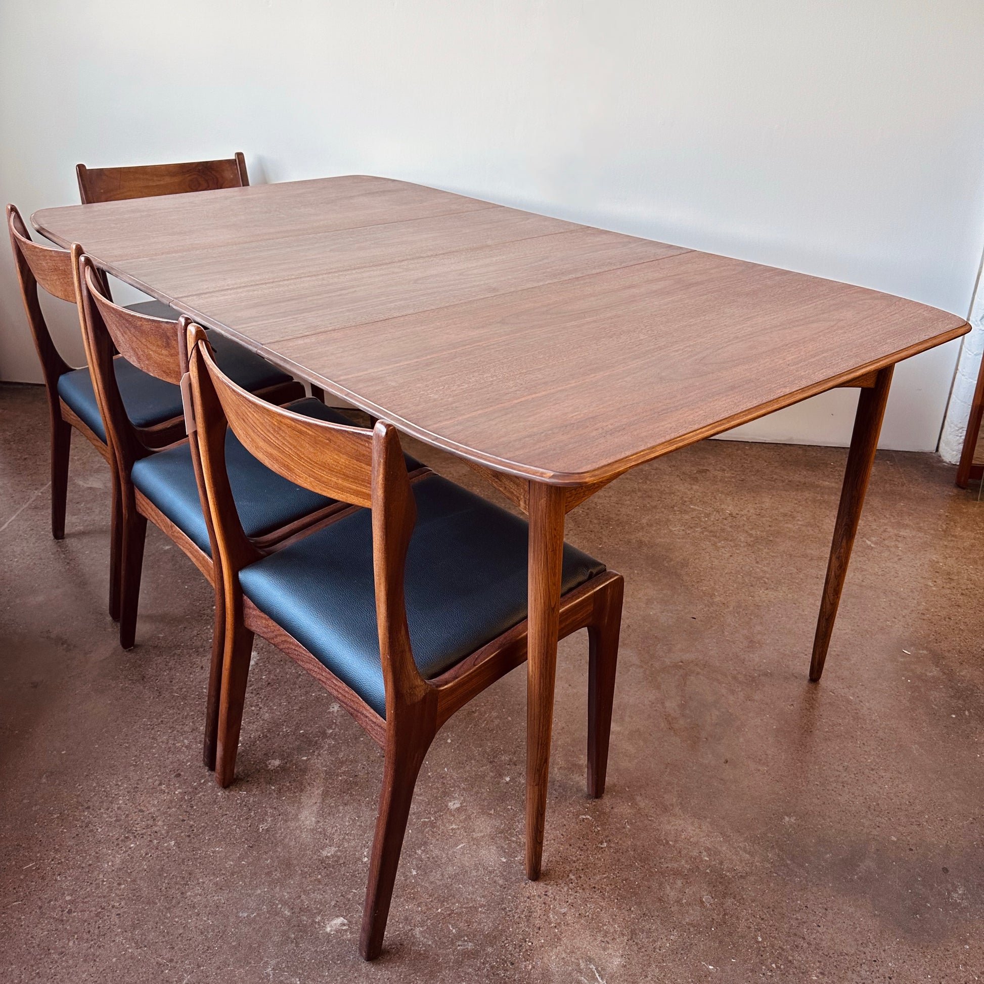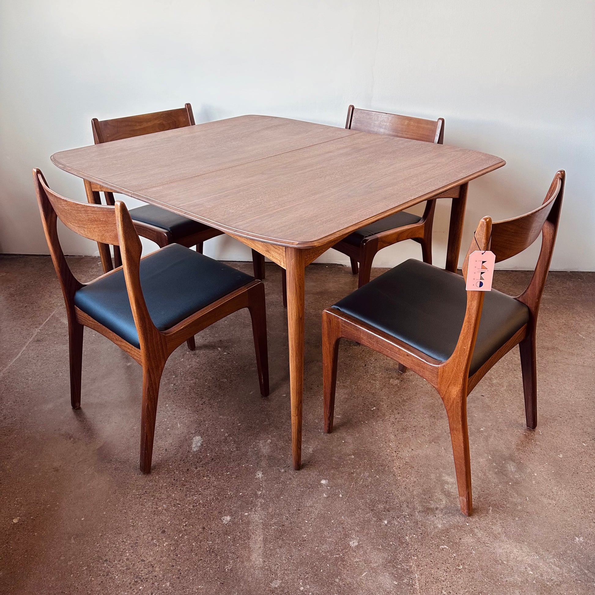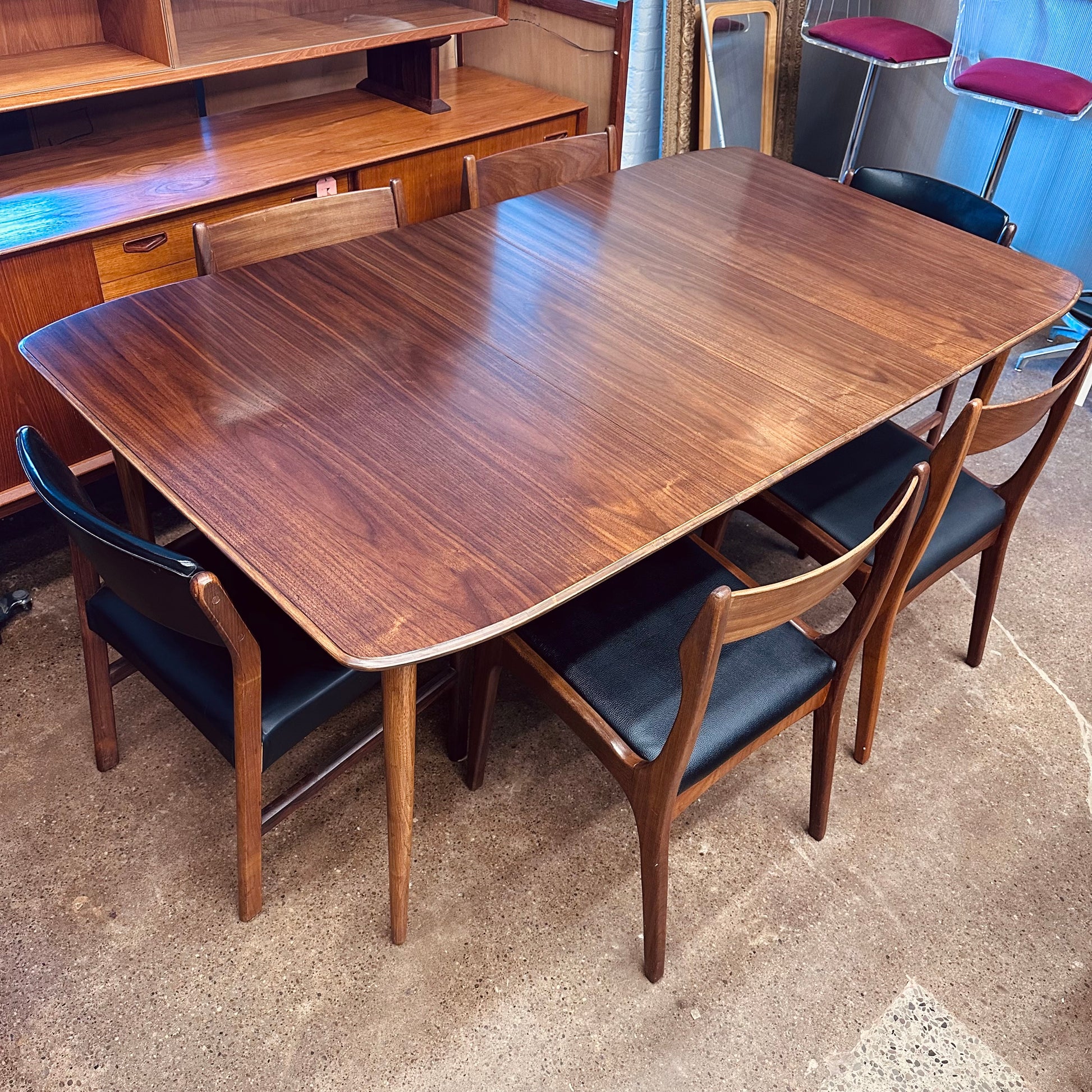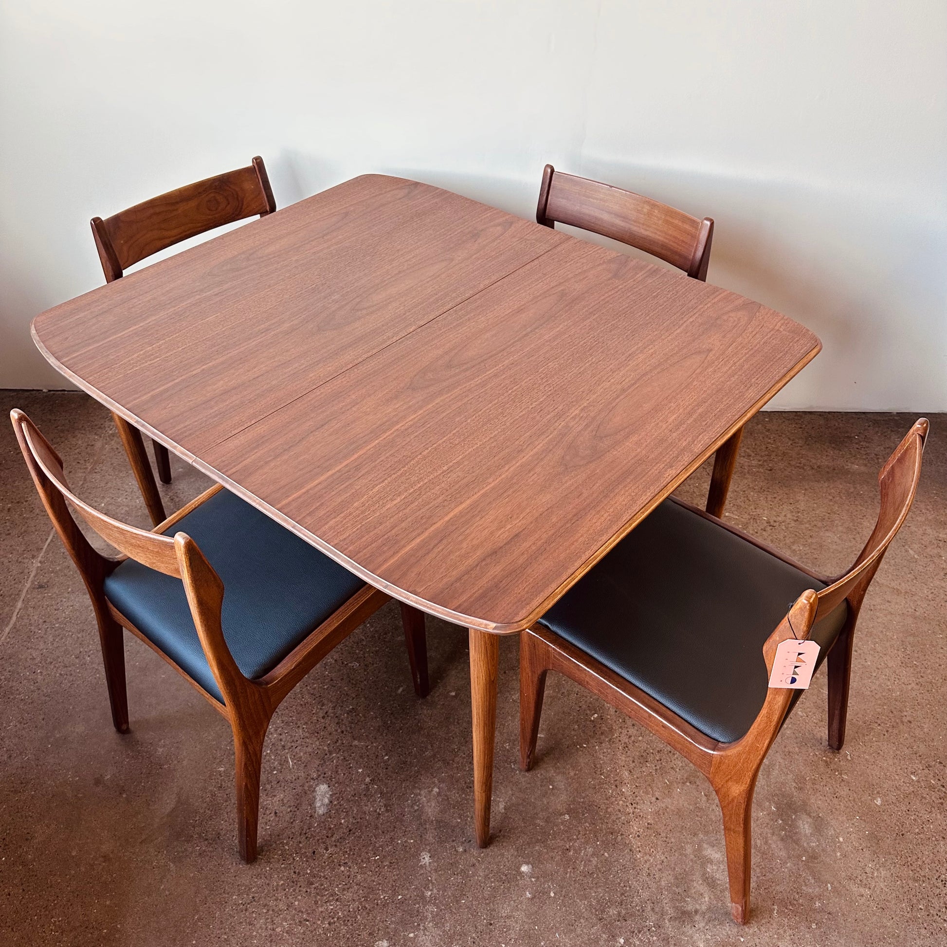 Canadian walnut dining table with two 12” leaves rectangular in shape with rounded corners. Features solid tapered legs, beveled edge detail, seating for 6-8, and refinished throughout. Made of walnut however will coordinate with mid-tone teak dining chairs as pictured. Legs are bolted and can easily be removed for shipping.