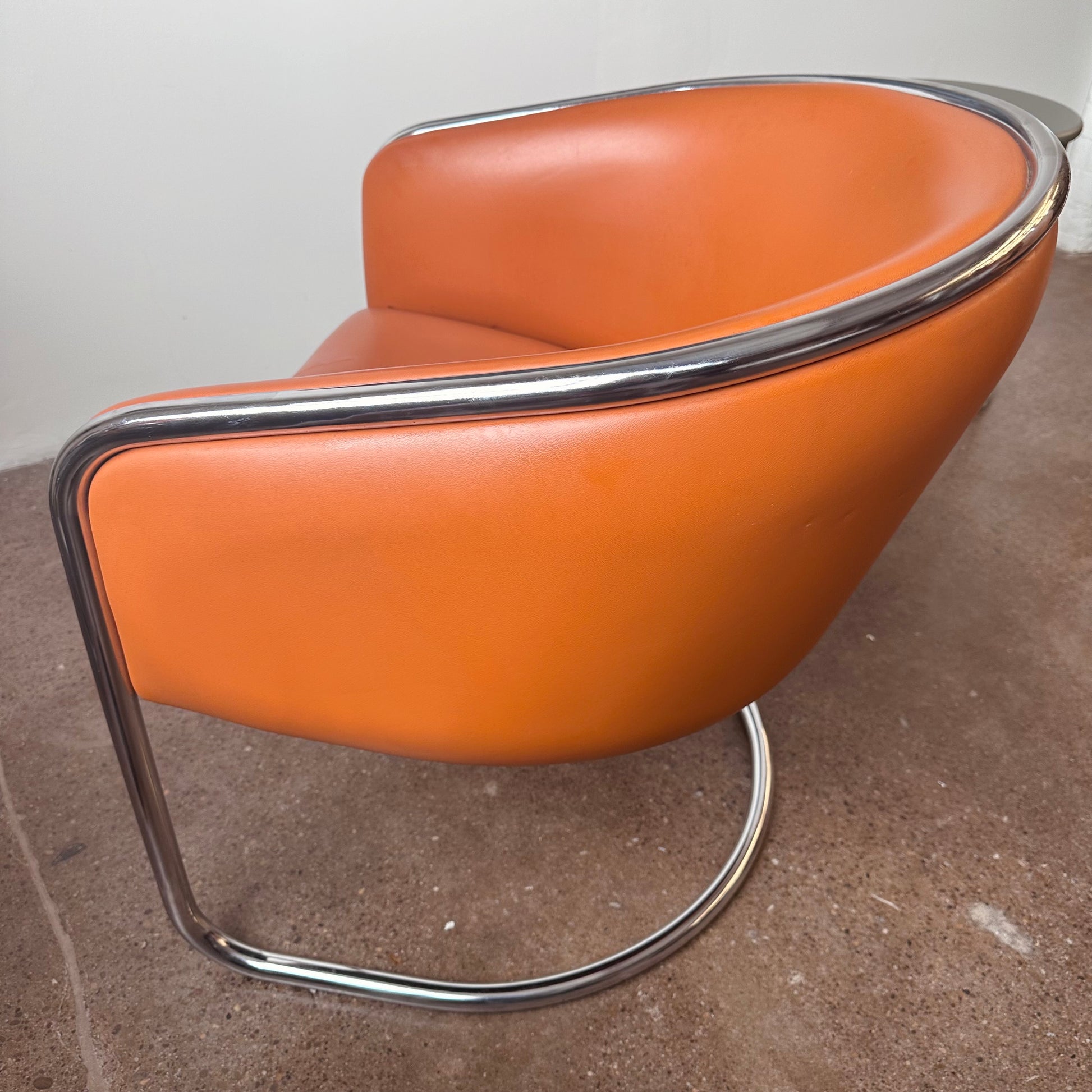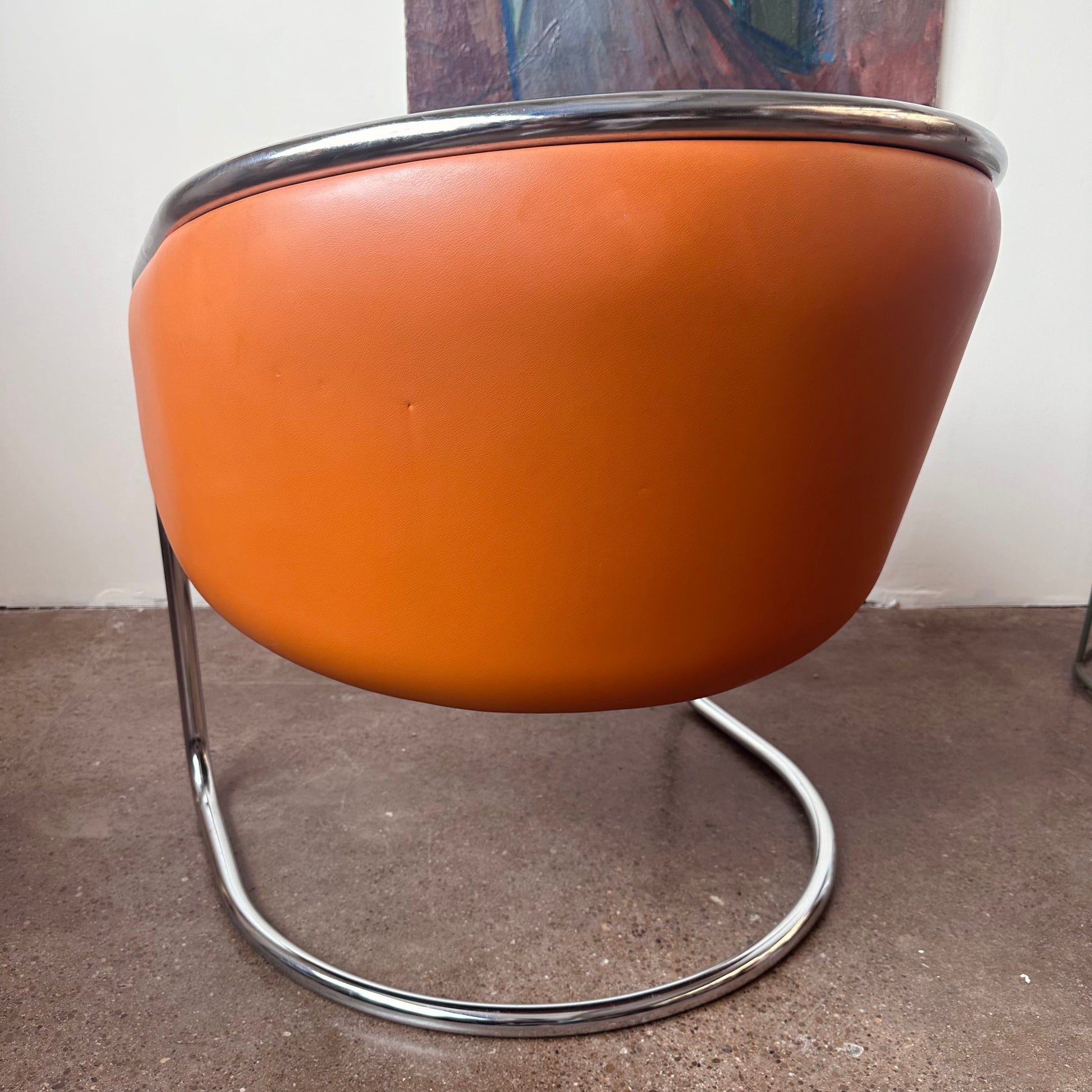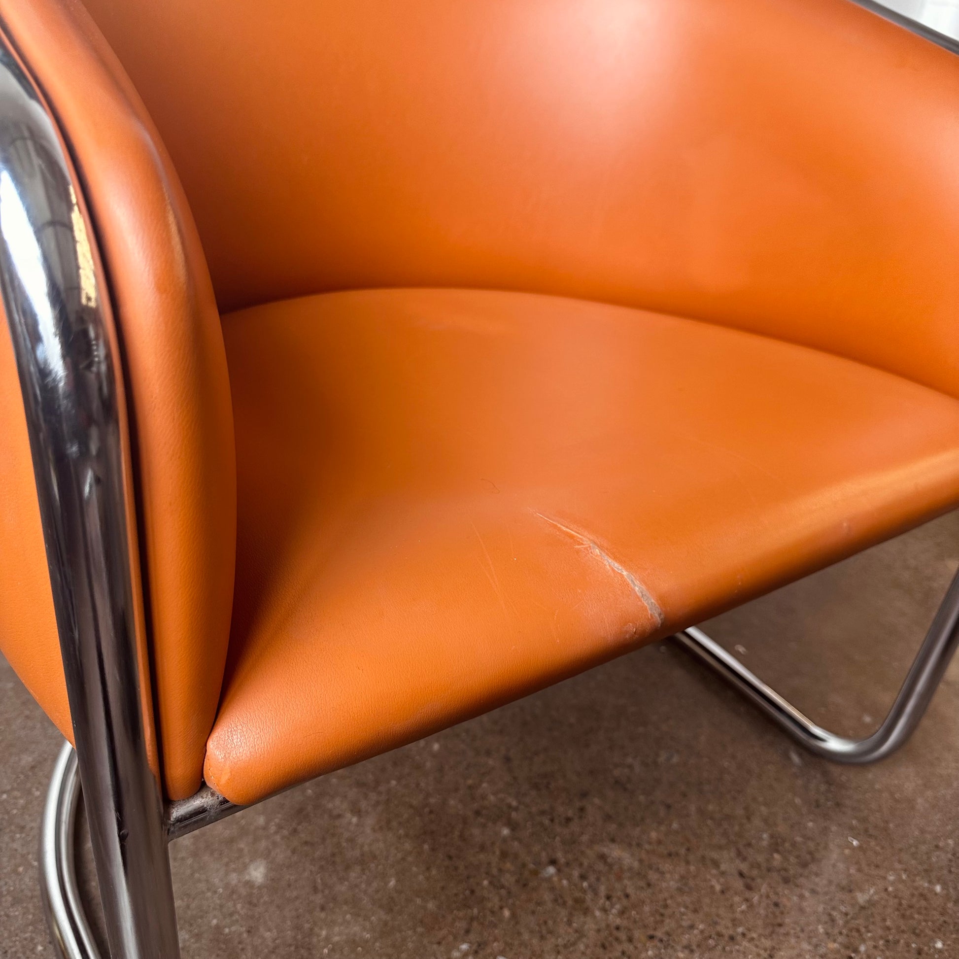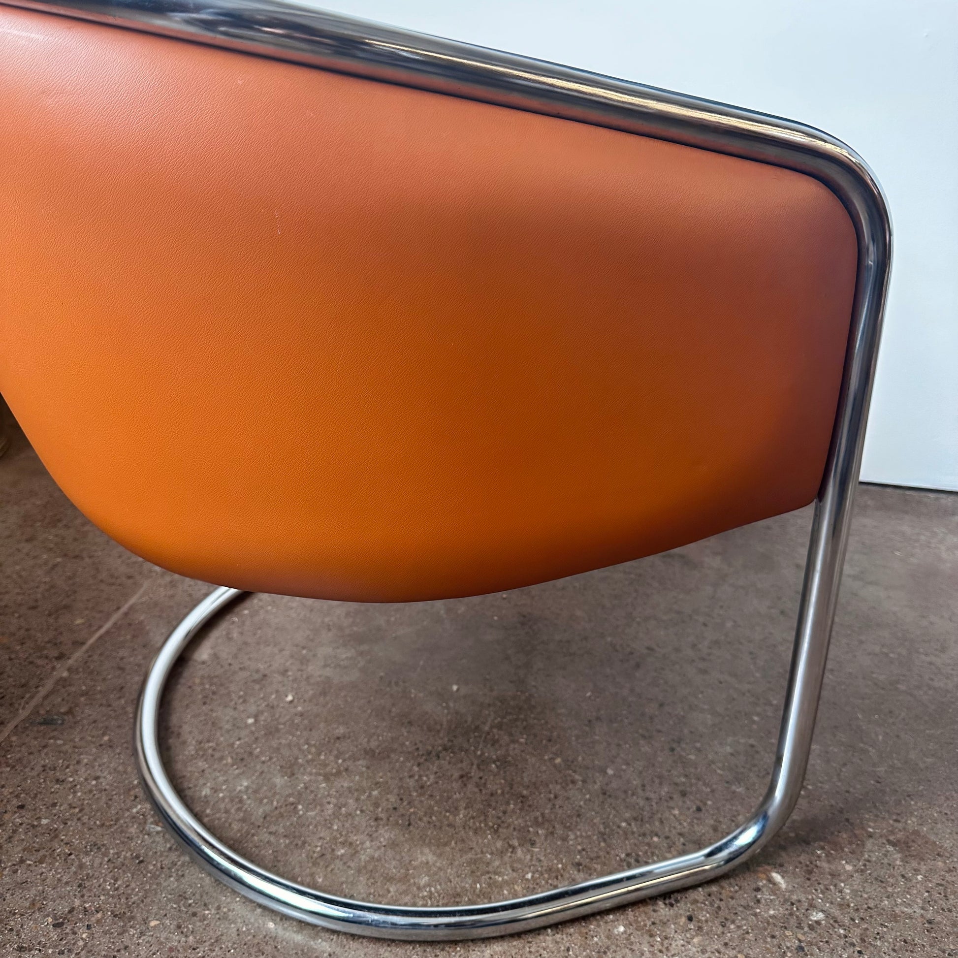 From a design by Joan Burgasser and Anton Lorenz, this Thonet club tub armchair sits deeply with a contoured barrel-back seat. Retains original fabric in a vibrant quintessential orange tangerine leather within a tubular chrome cantilevered frame. Hand delivery available to New York City or anywhere from Buffalo NY