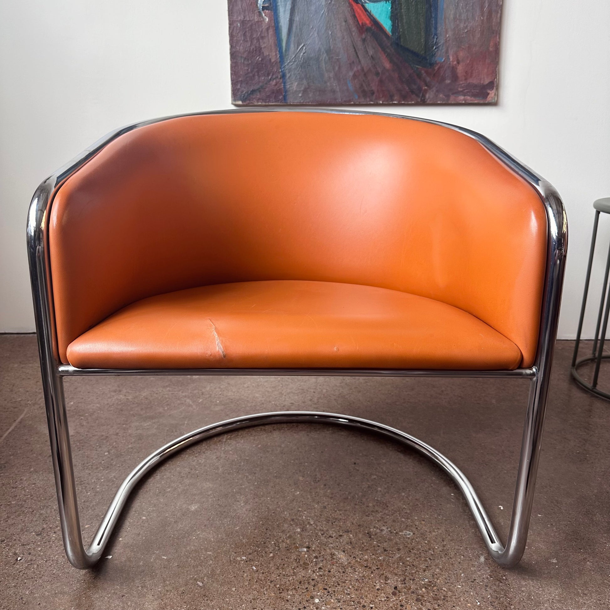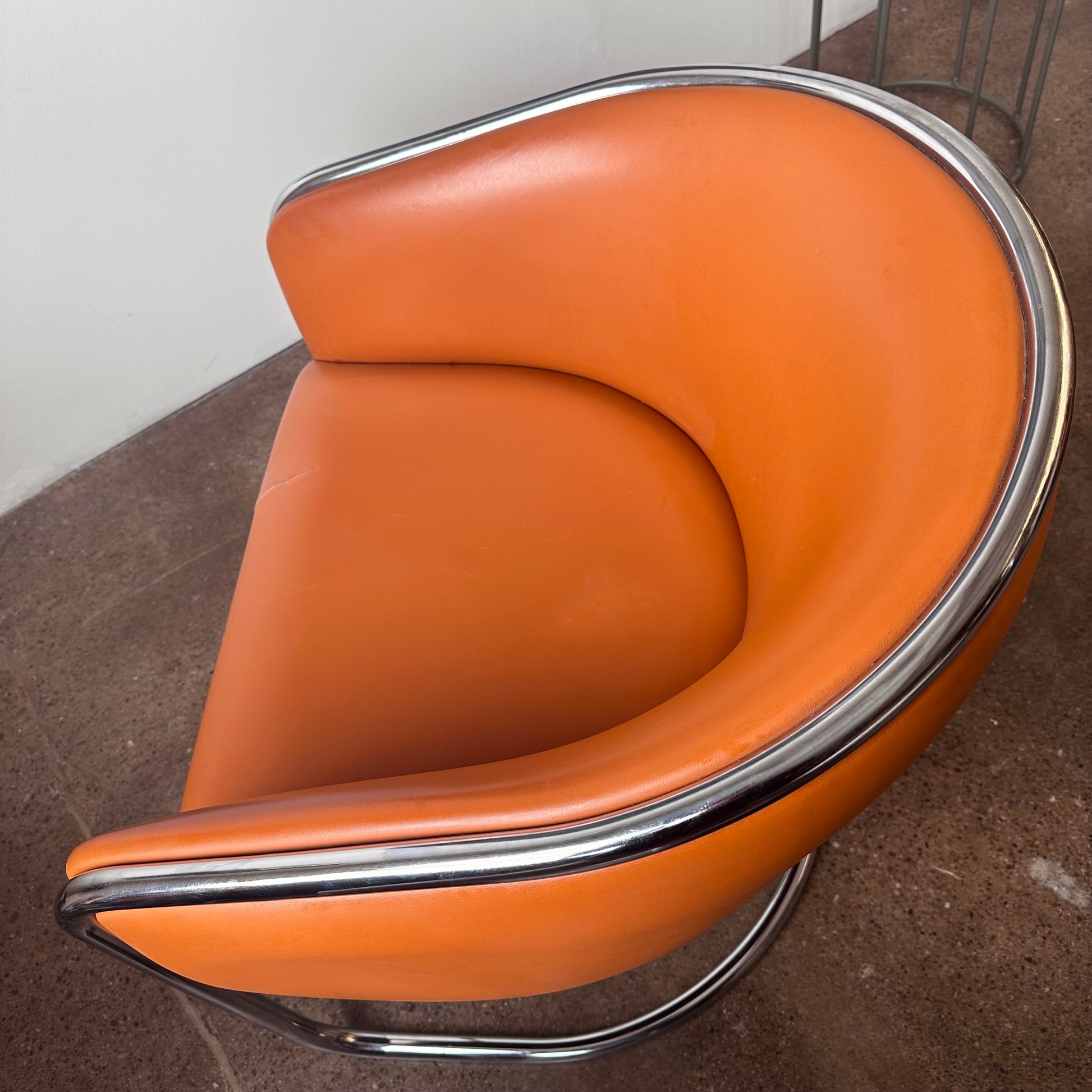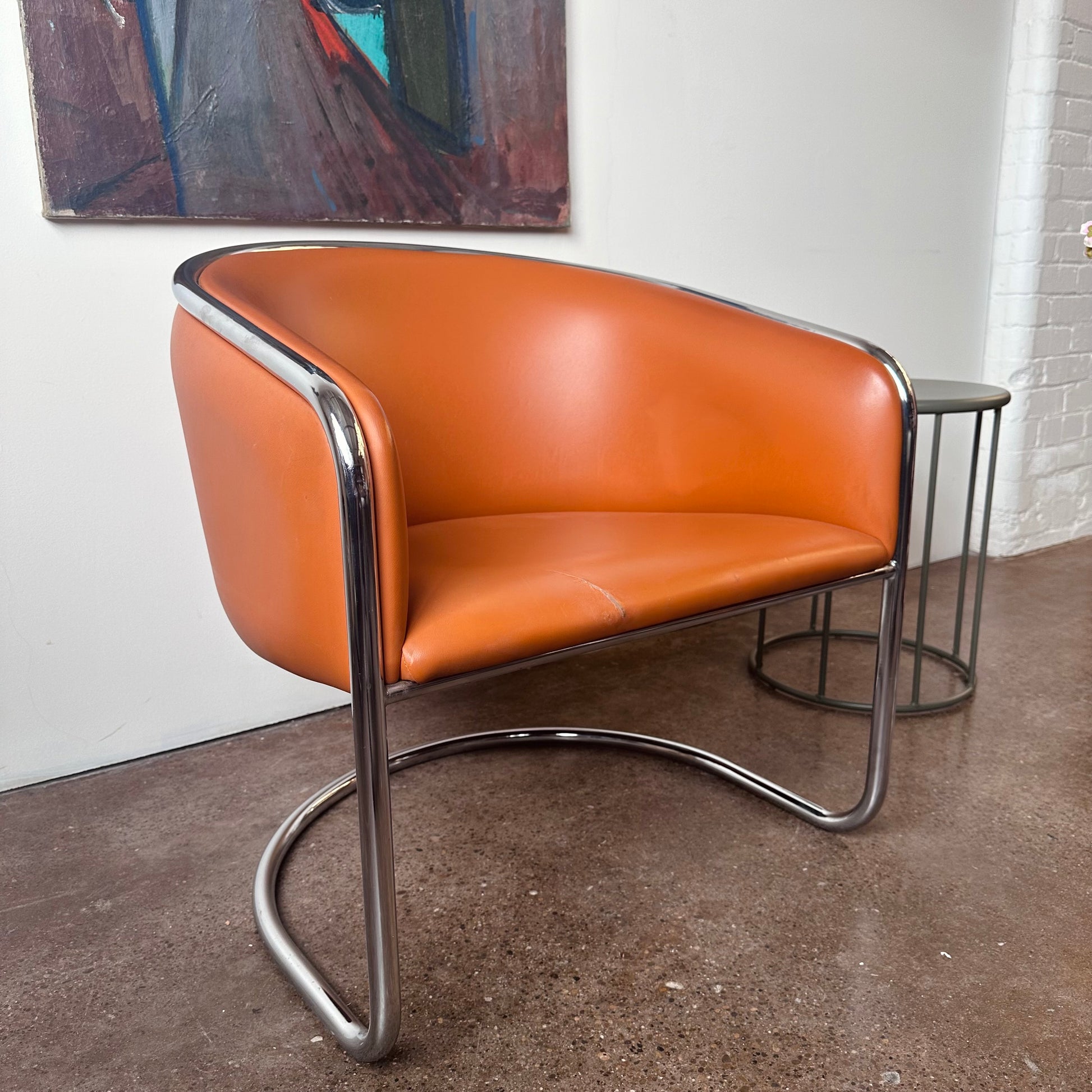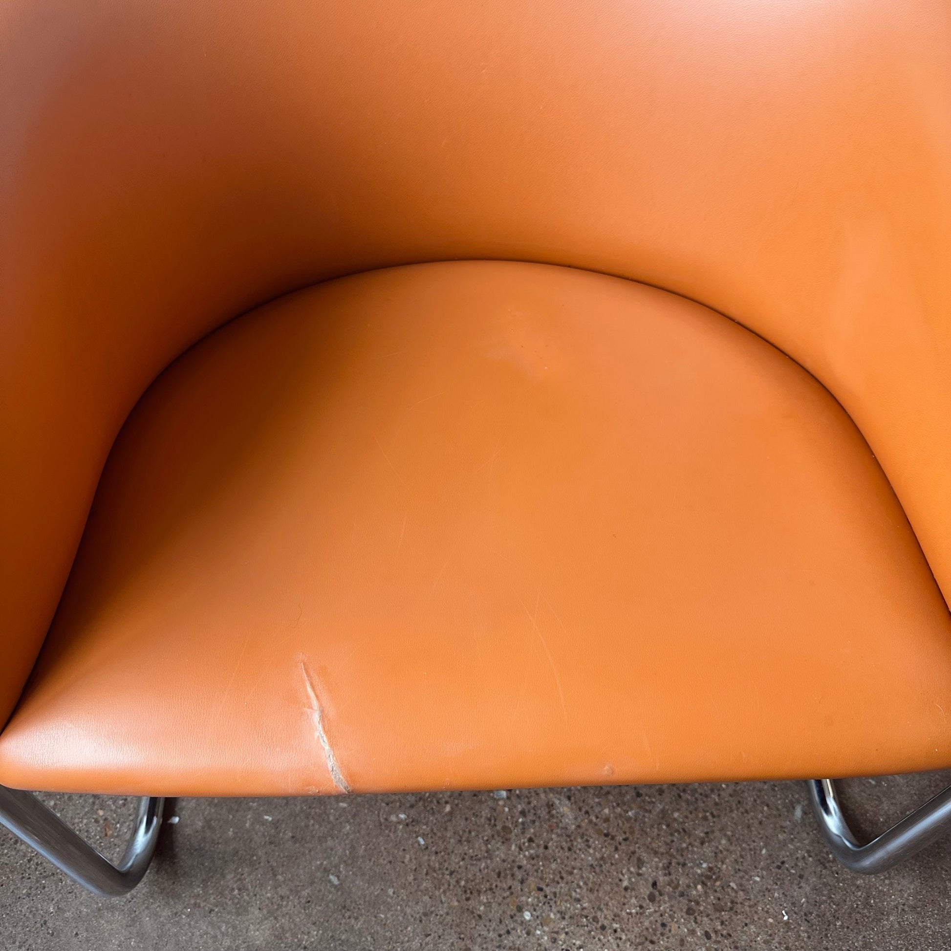 From a design by Joan Burgasser and Anton Lorenz, this Thonet club tub armchair sits deeply with a contoured barrel-back seat. Retains original fabric in a vibrant quintessential orange tangerine leather within a tubular chrome cantilevered frame. Hand delivery available to New York City or anywhere from Buffalo NY