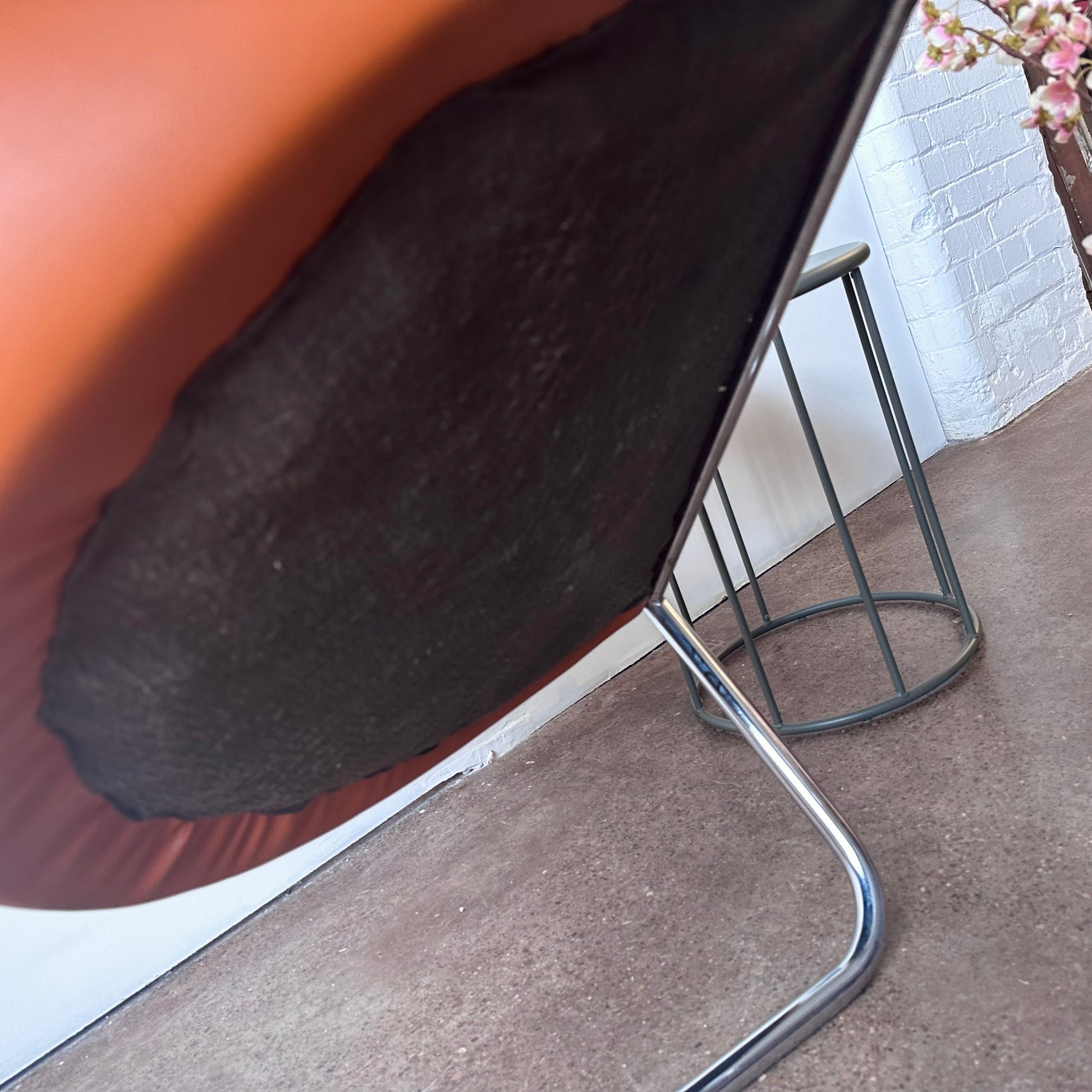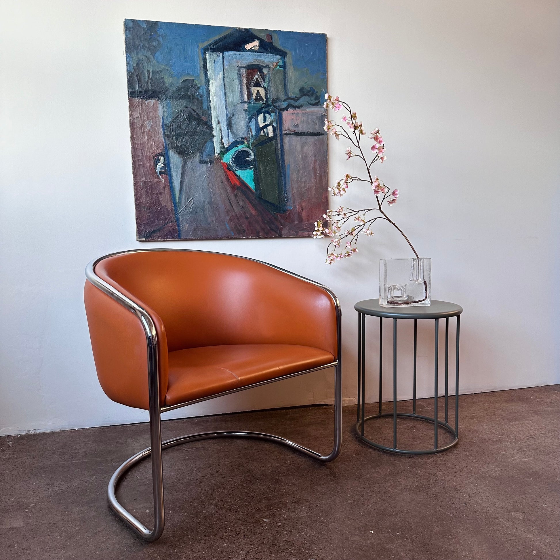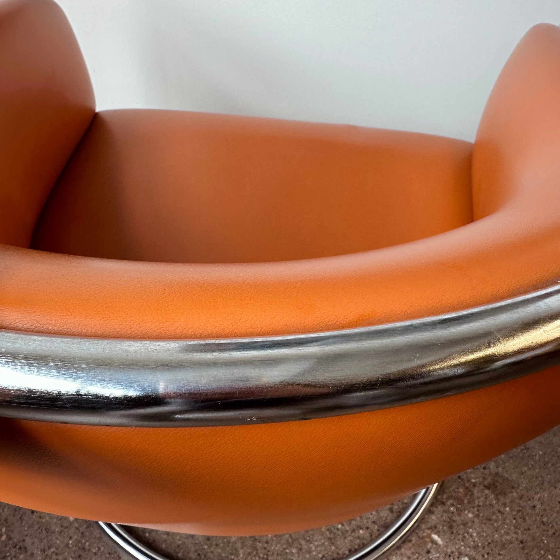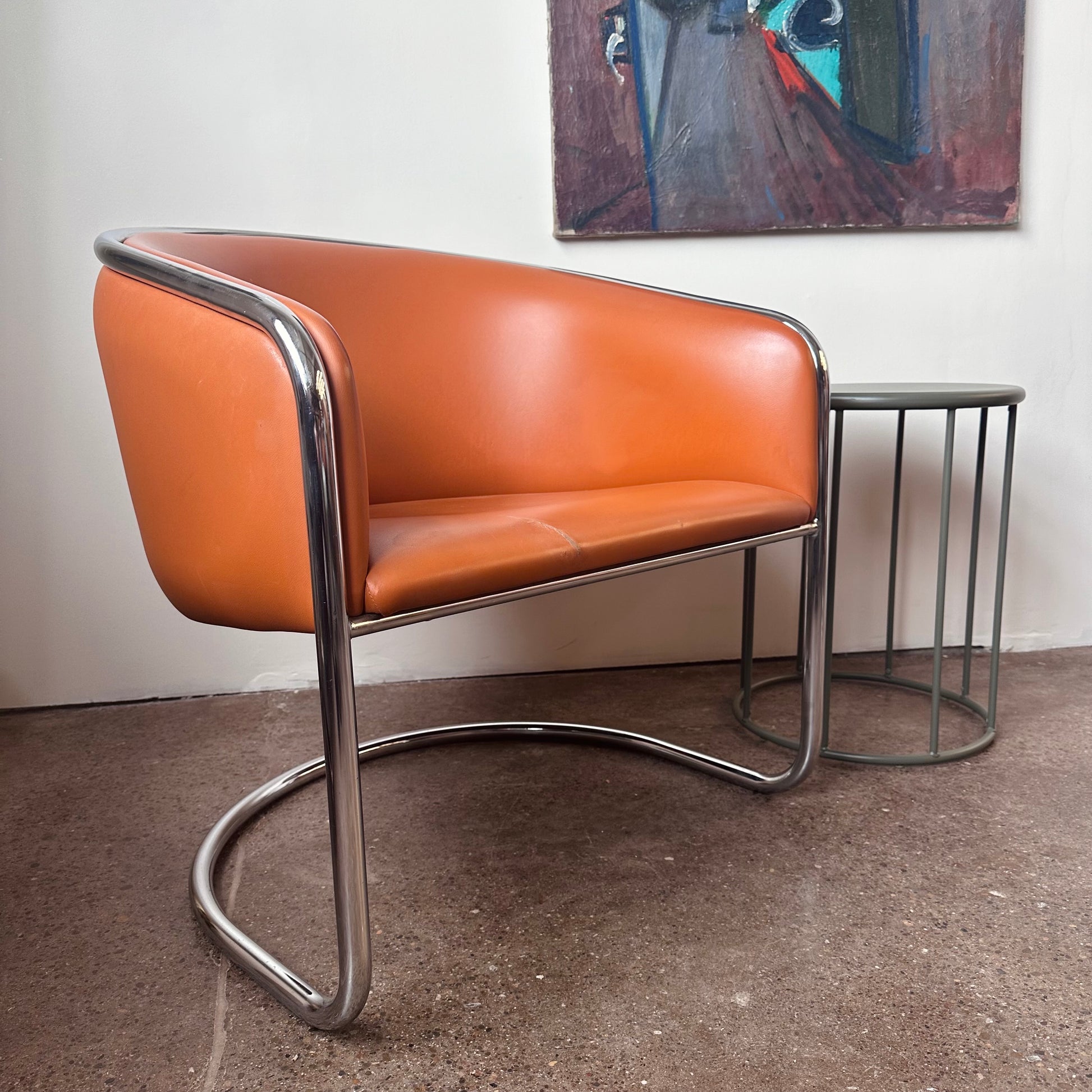 From a design by Joan Burgasser and Anton Lorenz, this Thonet club tub armchair sits deeply with a contoured barrel-back seat. Retains original fabric in a vibrant quintessential orange tangerine leather within a tubular chrome cantilevered frame. Hand delivery available to New York City or anywhere from Buffalo NY