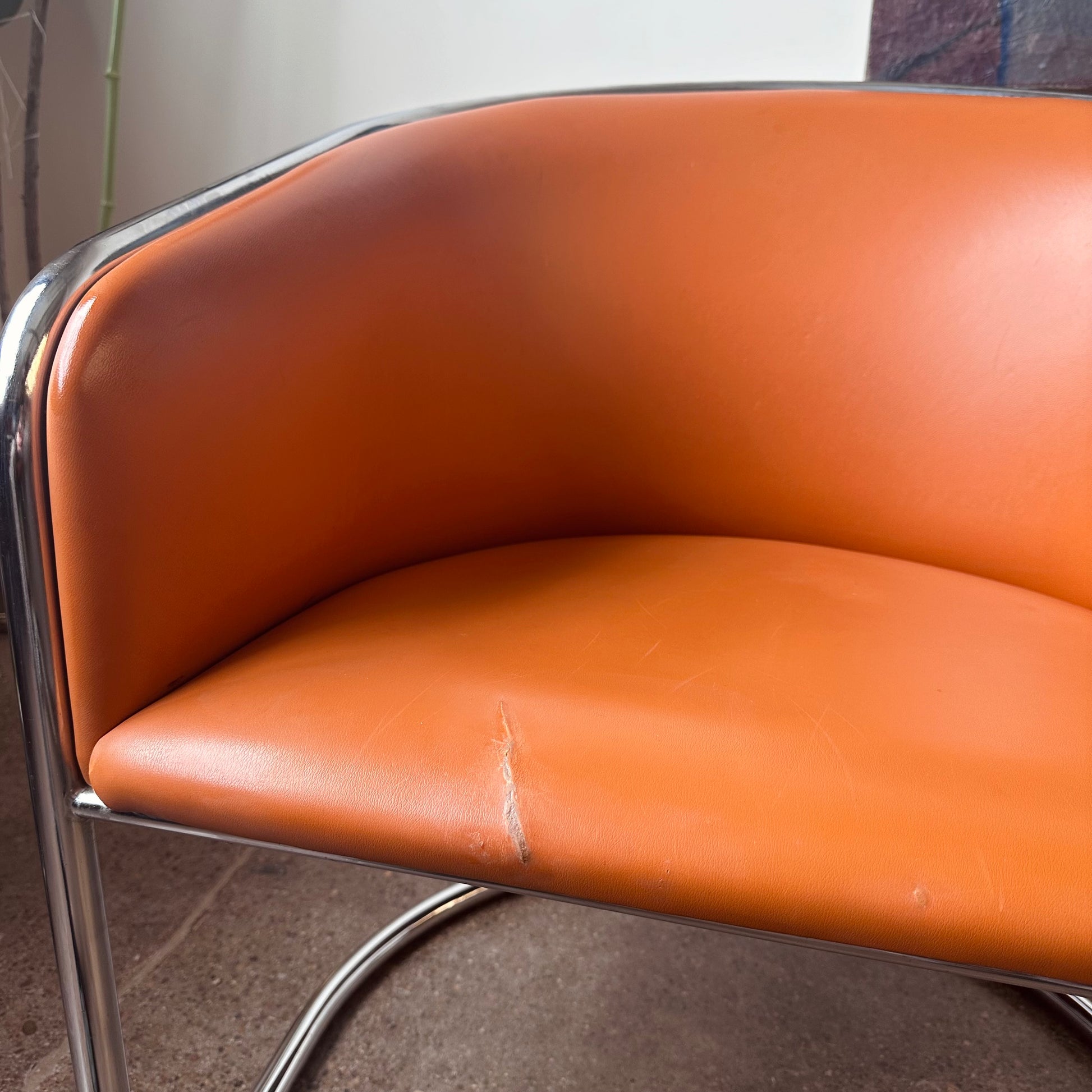 Good vintage condition with age appropriate wear. 4” tear in leather upholstery which has been fused together to prevent further tearing, however could eventually stand to be reupholstered. See photos. Chrome is very good condition with no major tarnishing or pitting.