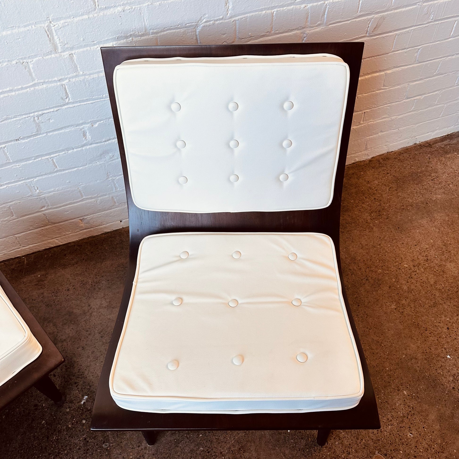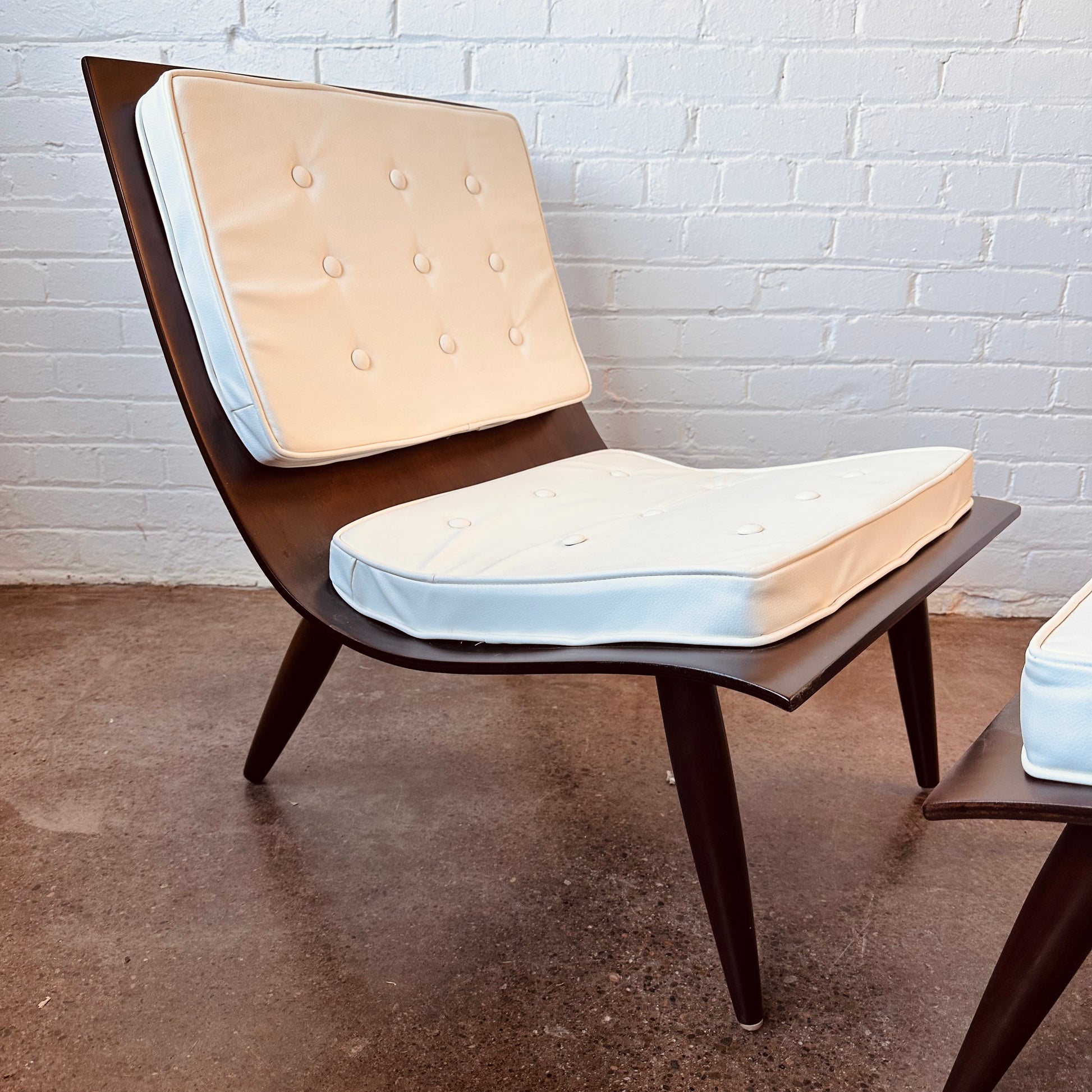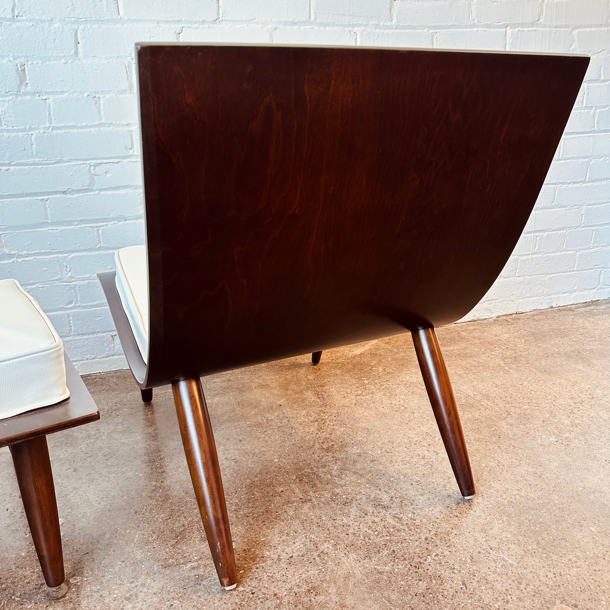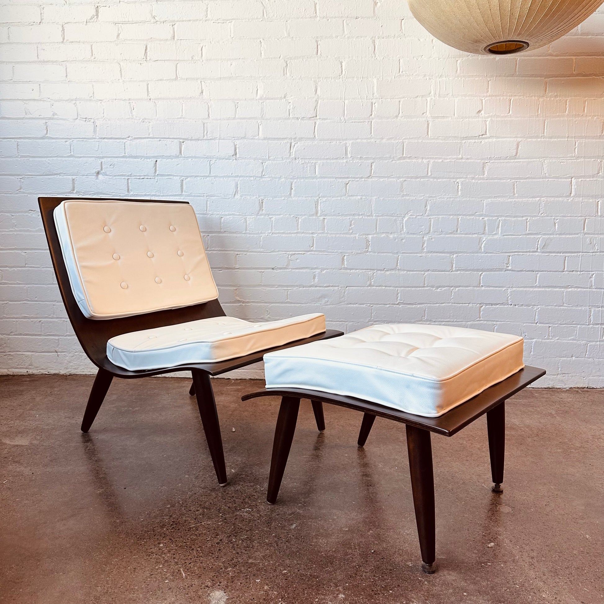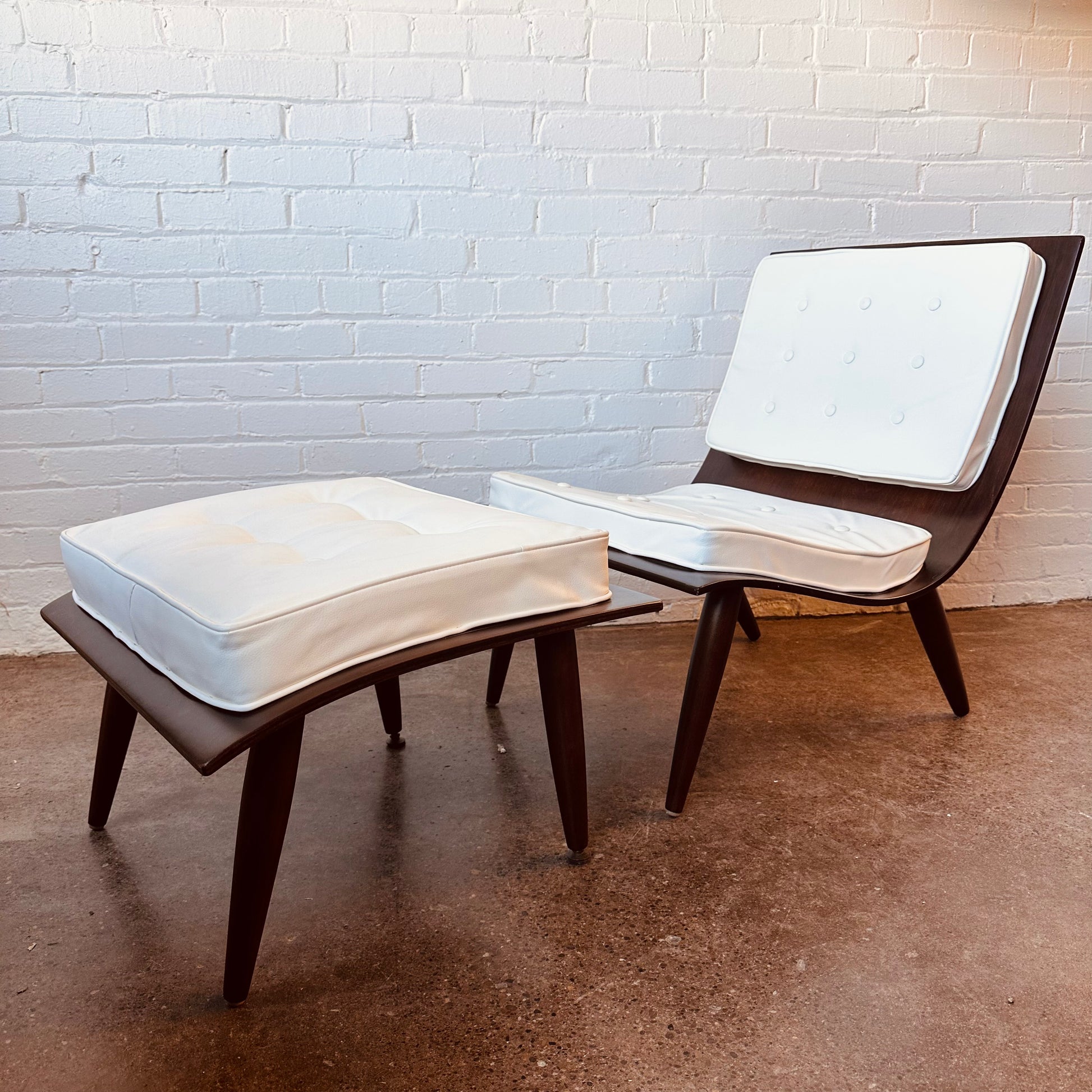 Vintage Carter Brother’s scoop chair and ottoman. Tufted with white naugahyde and fully restored wood.