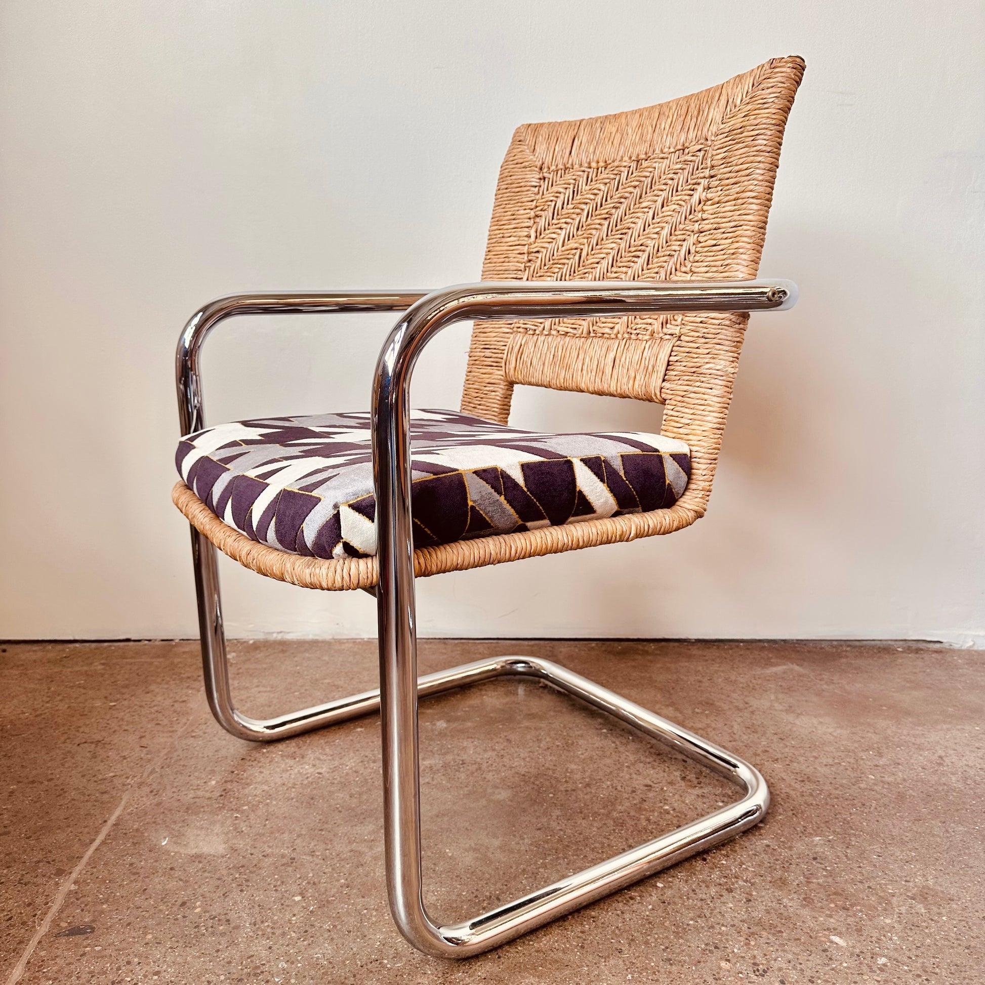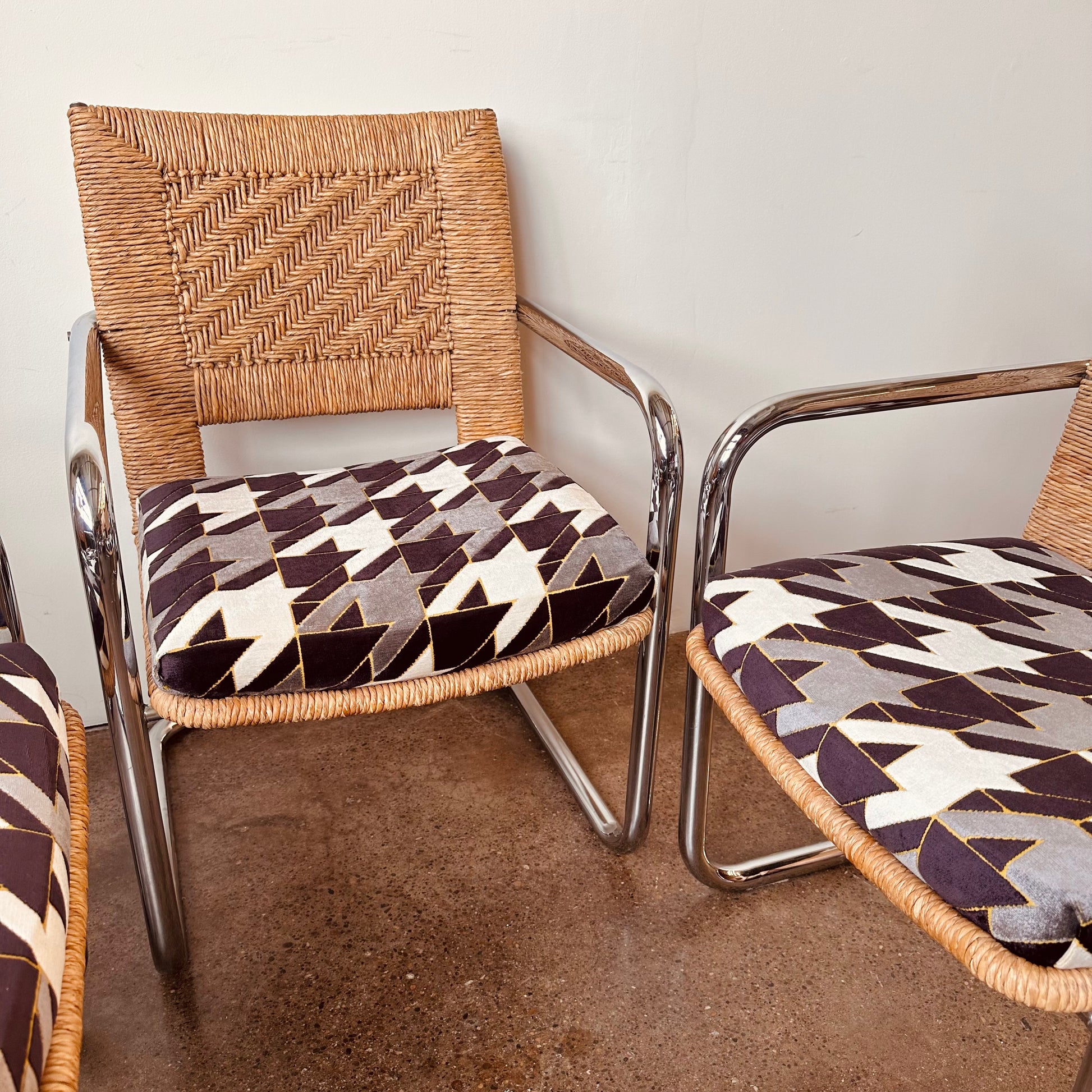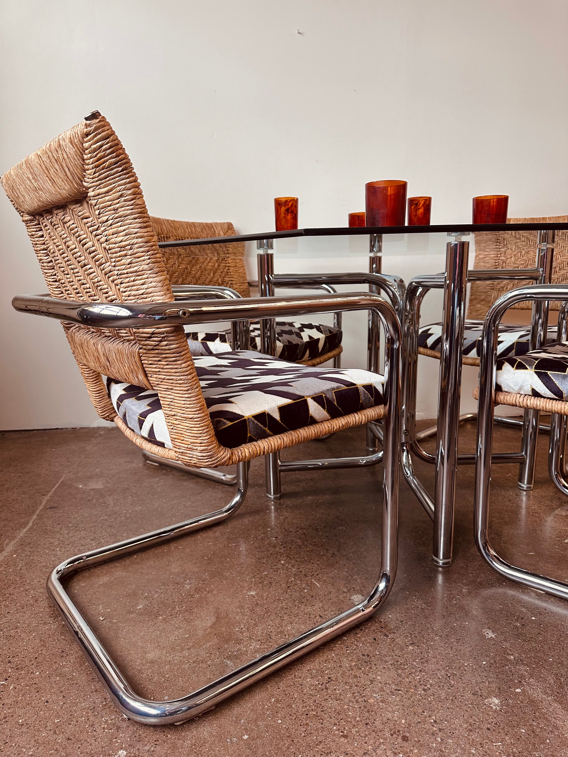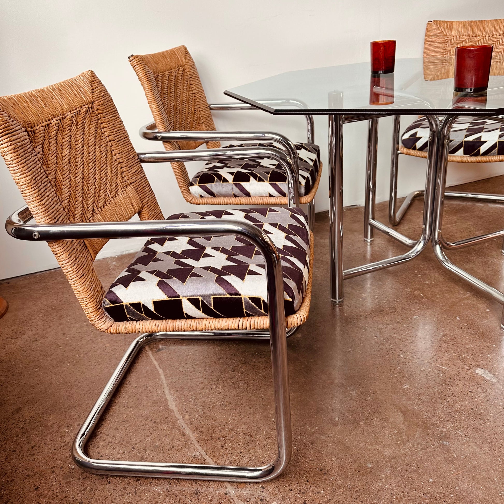 Excellent vintage condition with age appropriate wear. No chips in glass, light surface scratches from use. Rattan chairs is excellent shape, no unraveling or tearing in rattan, no pitting or major rust in chrome, structurally solid and sound with new cut-velvet upholstery grade fabric.
