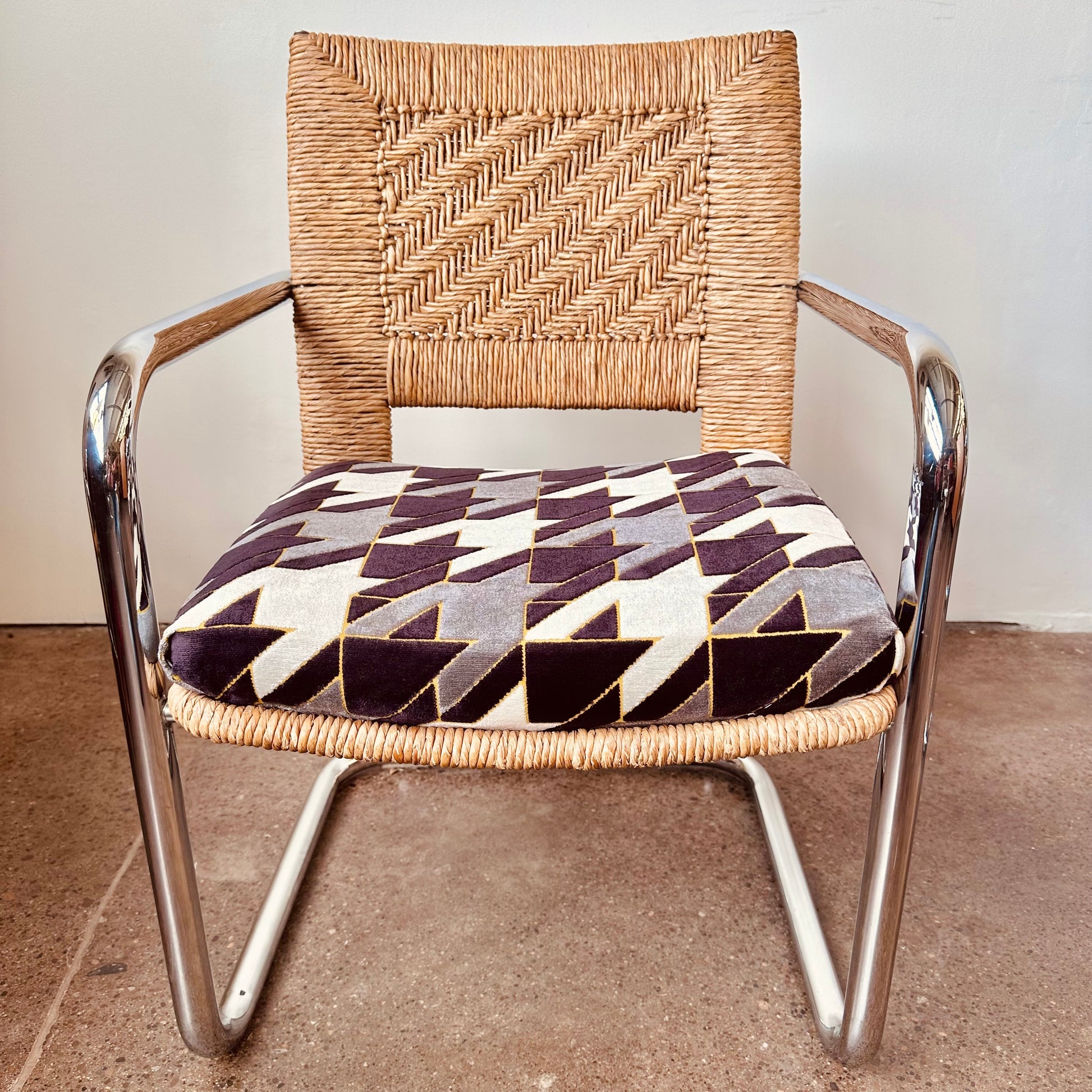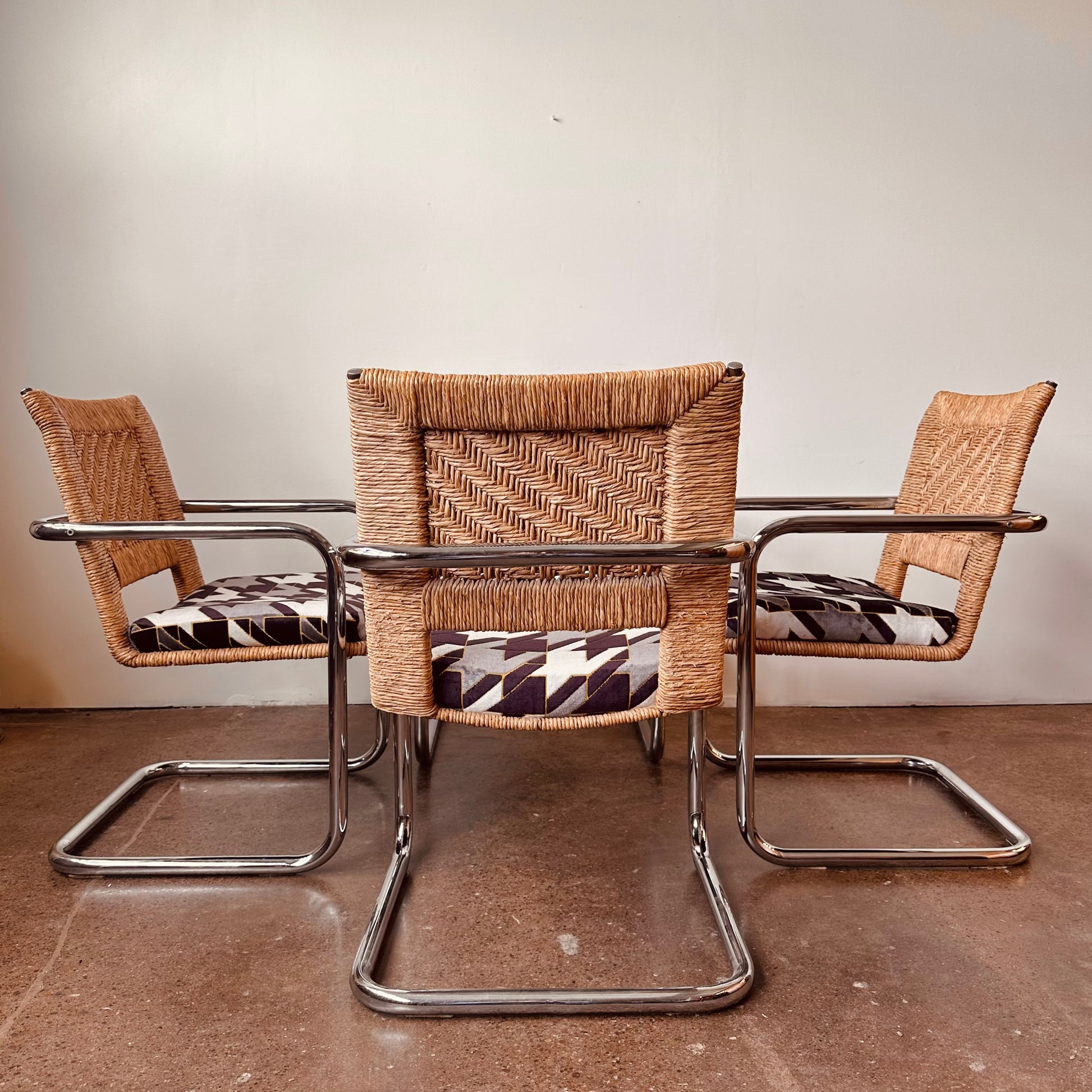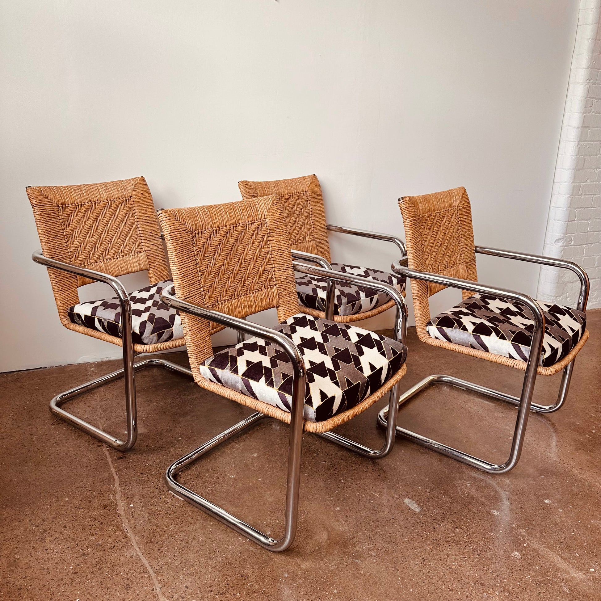 Excellent vintage condition with age appropriate wear. No chips in glass, light surface scratches from use. Rattan chairs is excellent shape, no unraveling or tearing in rattan, no pitting or major rust in chrome, structurally solid and sound with new cut-velvet upholstery grade fabric.