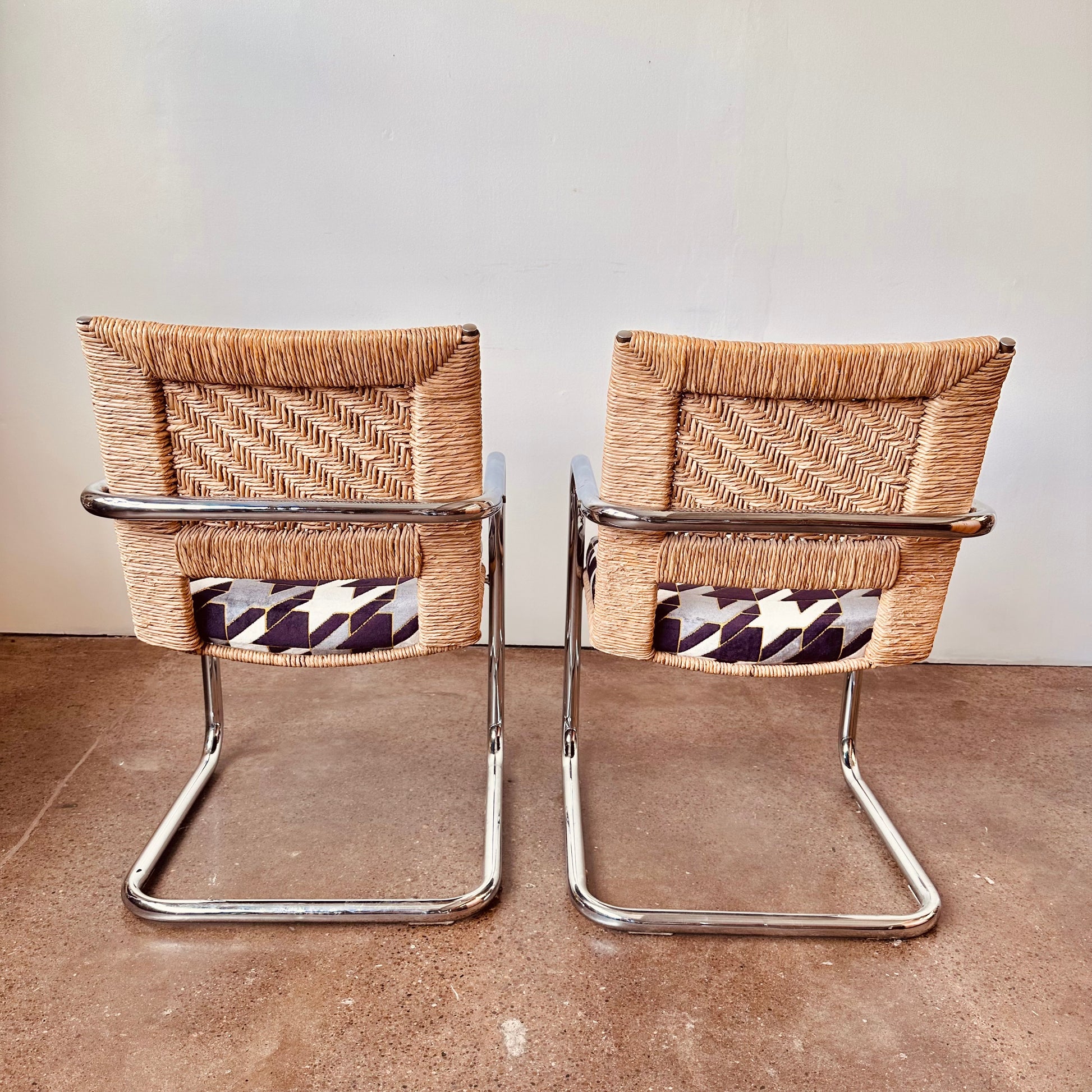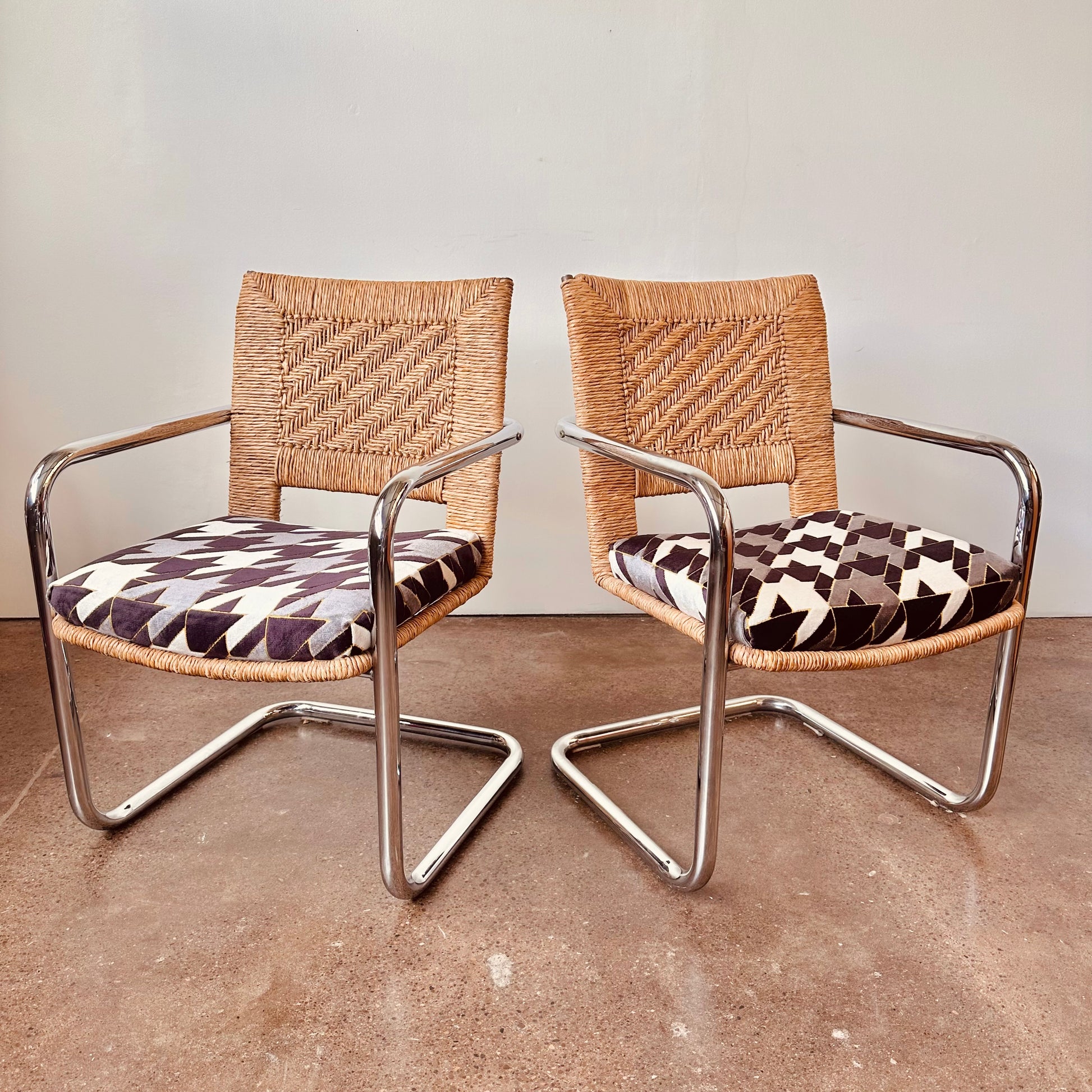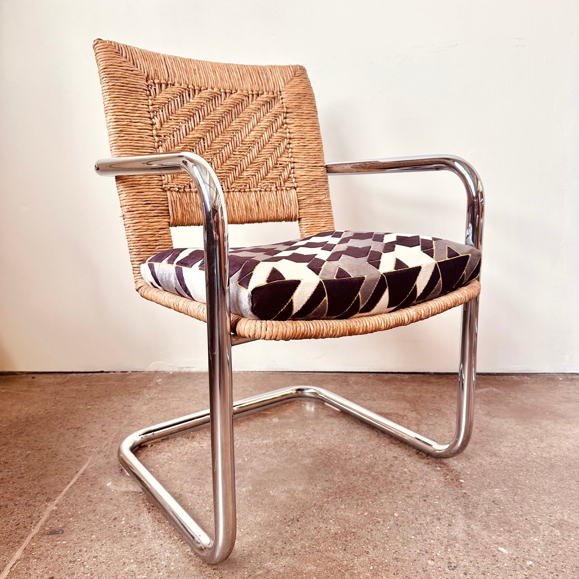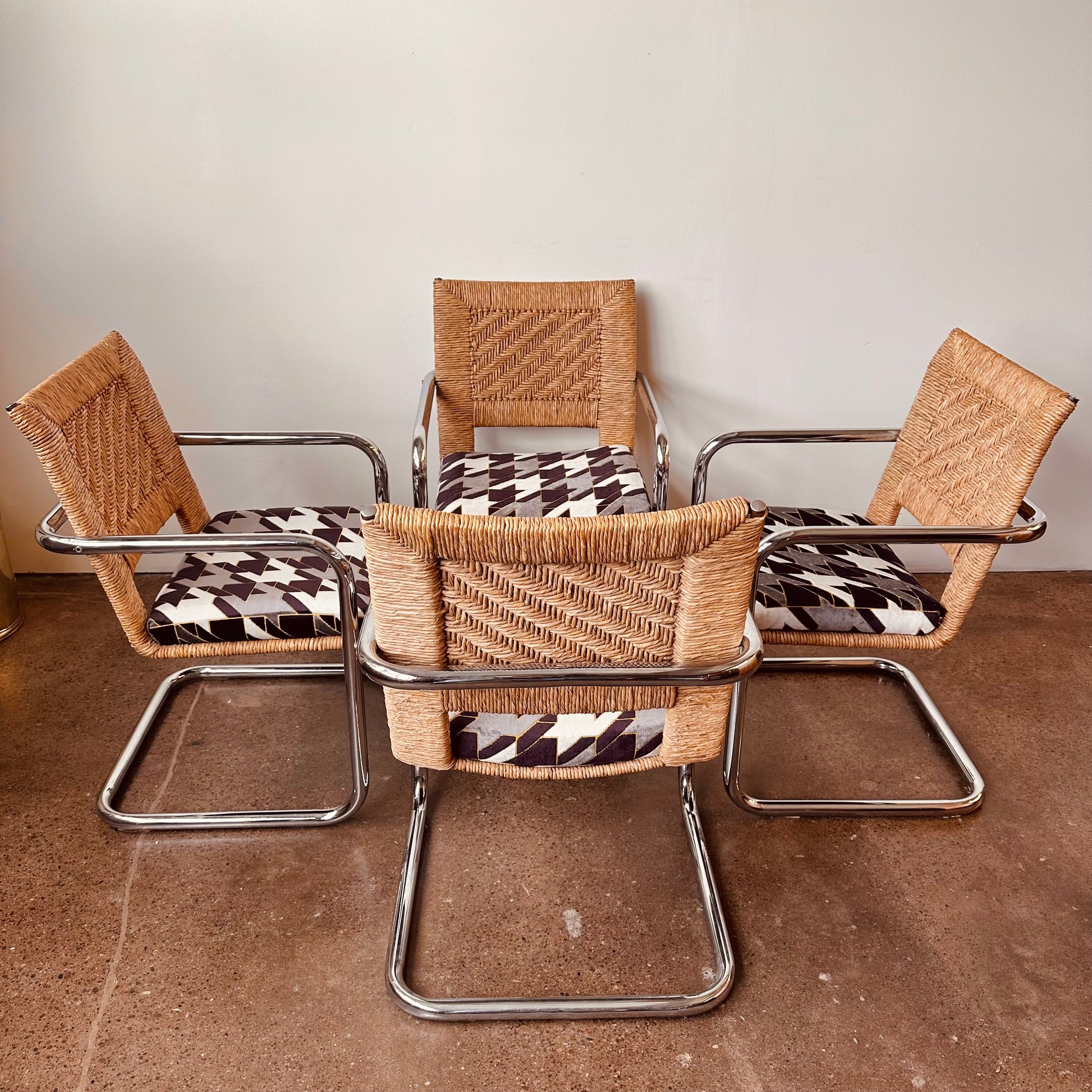 Excellent vintage condition with age appropriate wear. No chips in glass, light surface scratches from use. Rattan chairs is excellent shape, no unraveling or tearing in rattan, no pitting or major rust in chrome, structurally solid and sound with new cut-velvet upholstery grade fabric.