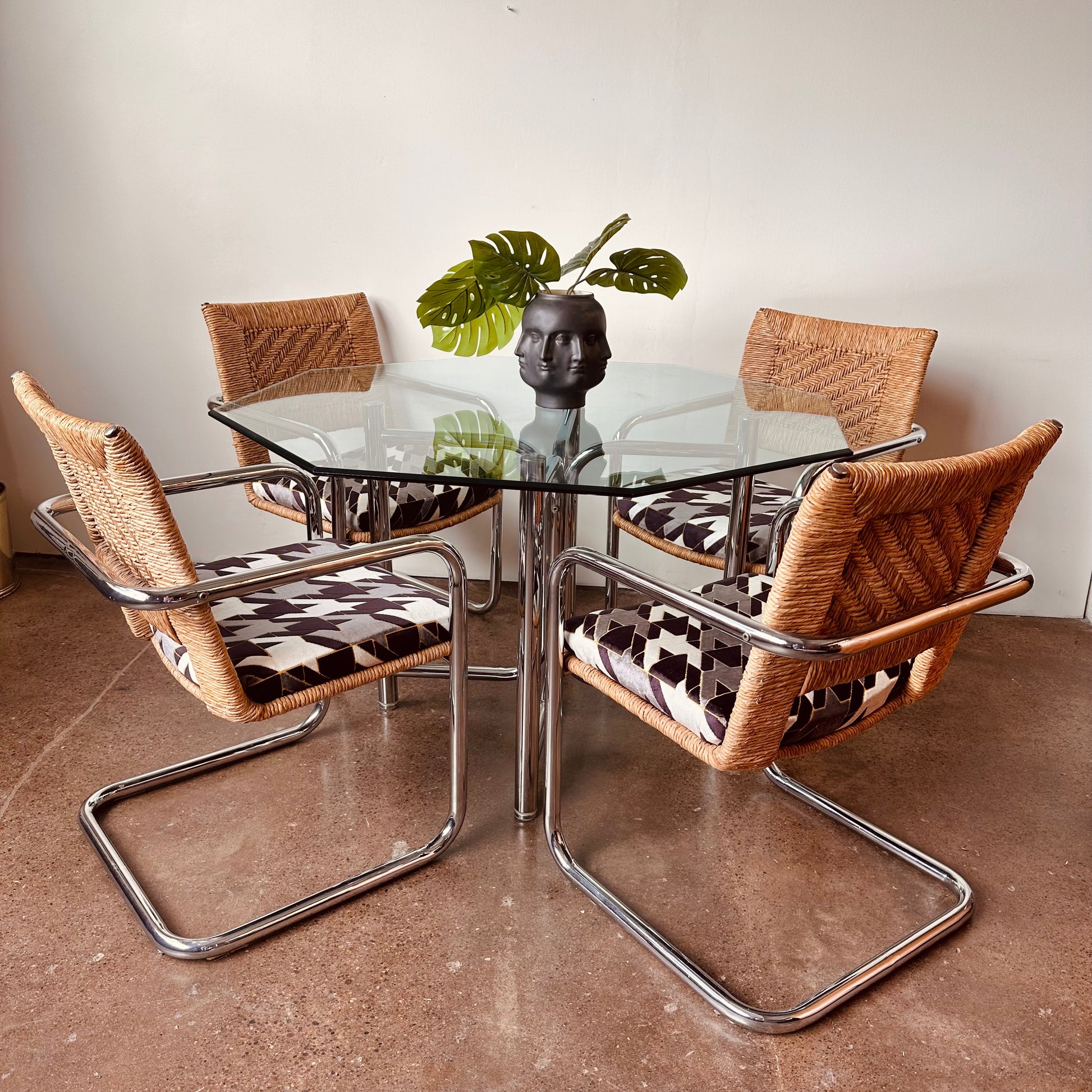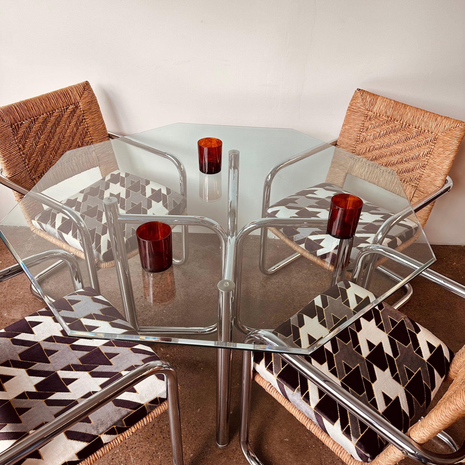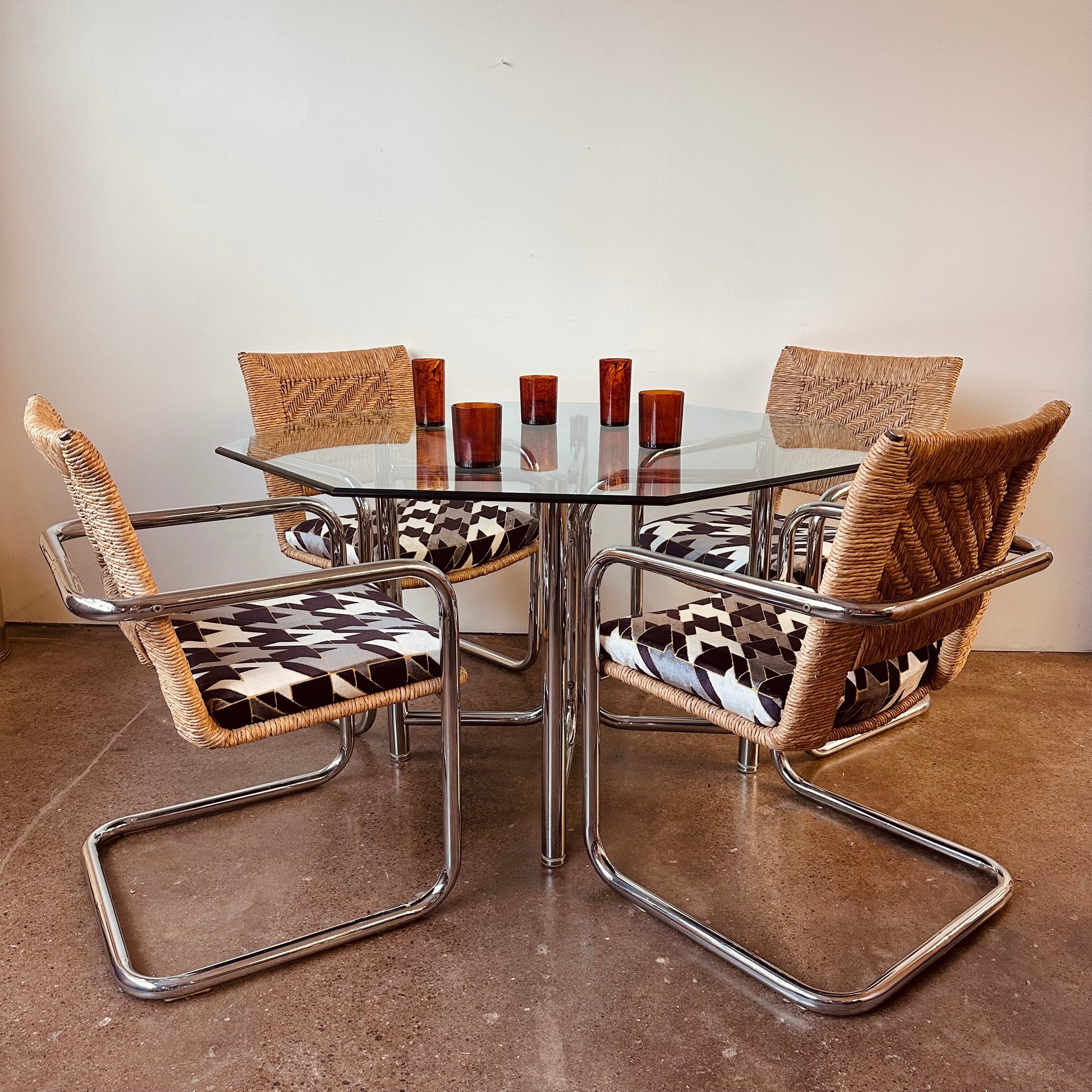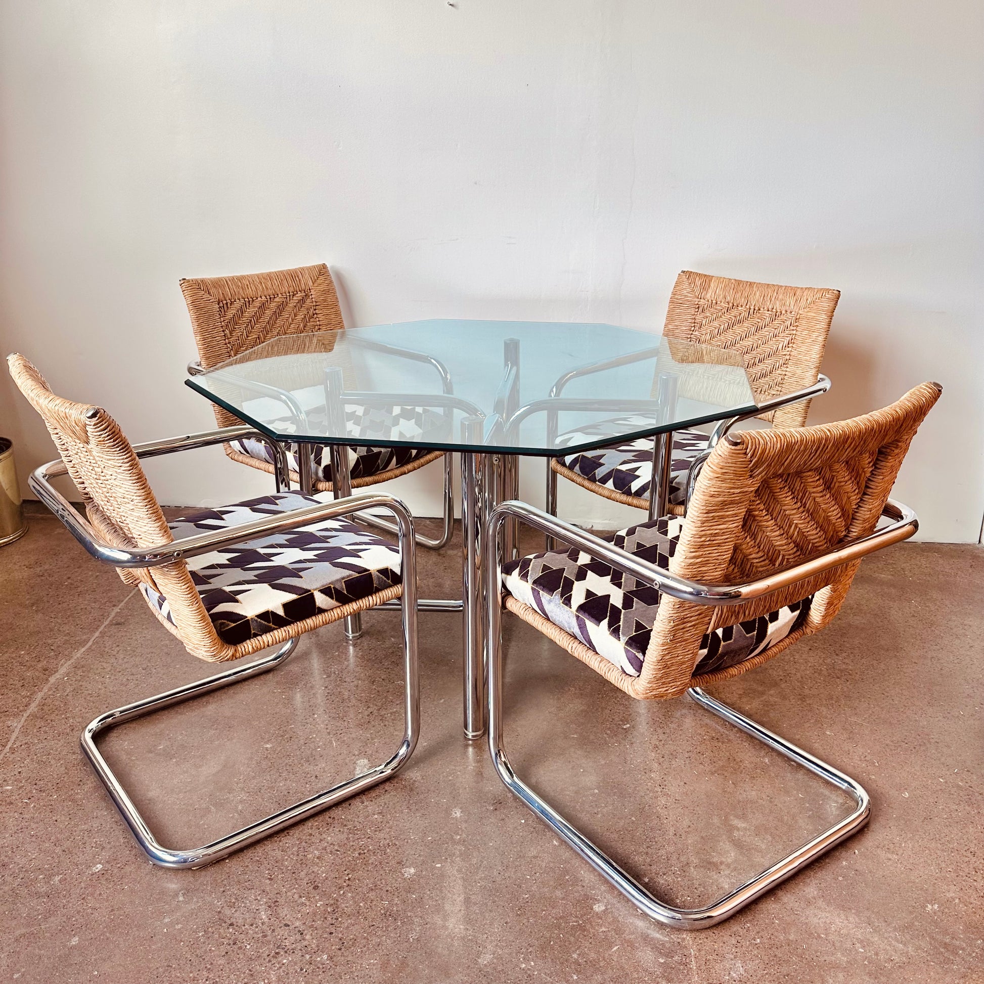 Vintage mid-century modern dinette set produced by Chromecraft circa 1970s. Features four tubular chrome framed cantilevered arm chairs with wicker or woven rattan and cut-velvet upholstery on seats. The glass top is 3/8” tempered beveled glass in an octagonal shape with a four piece chrome pedestal frame support.