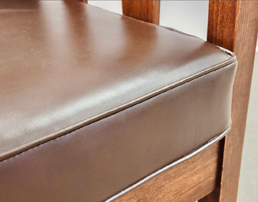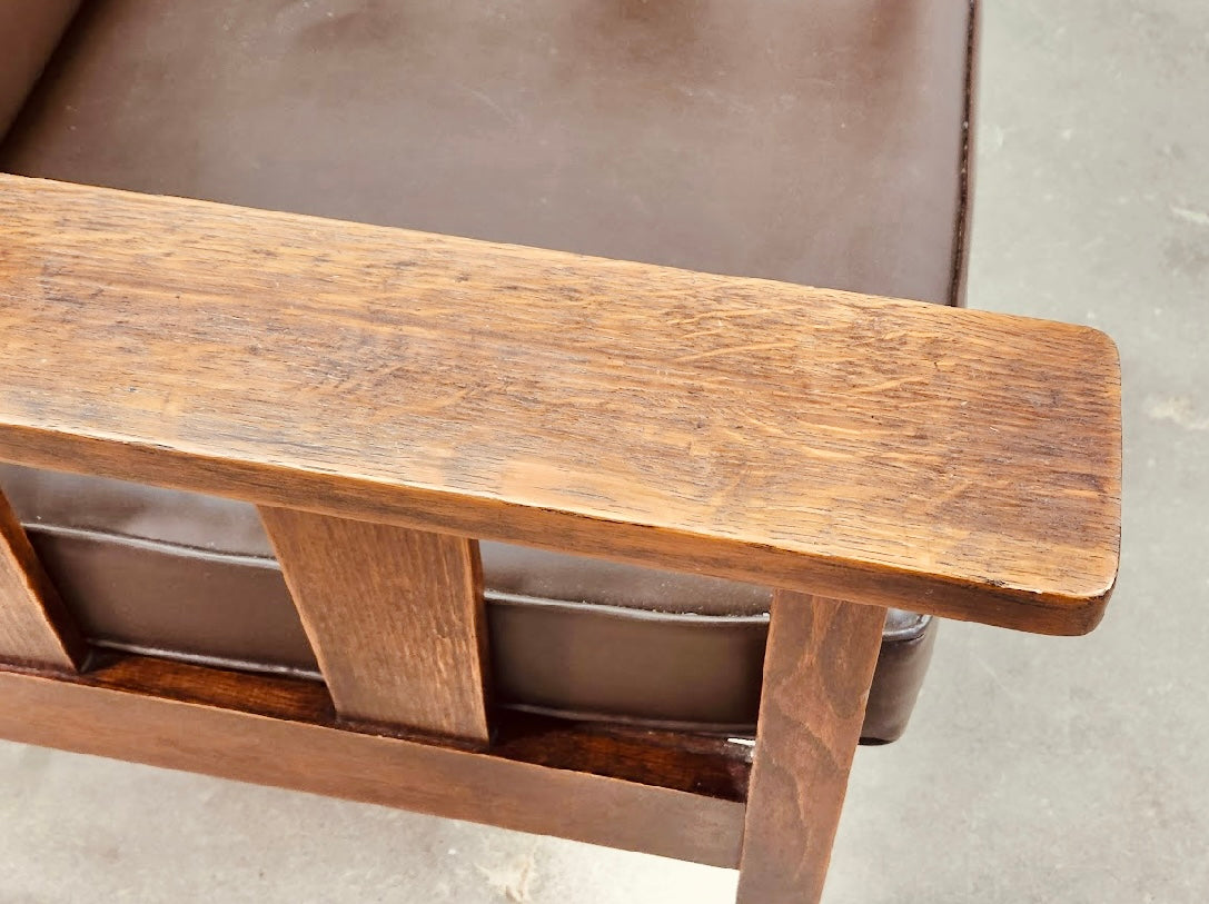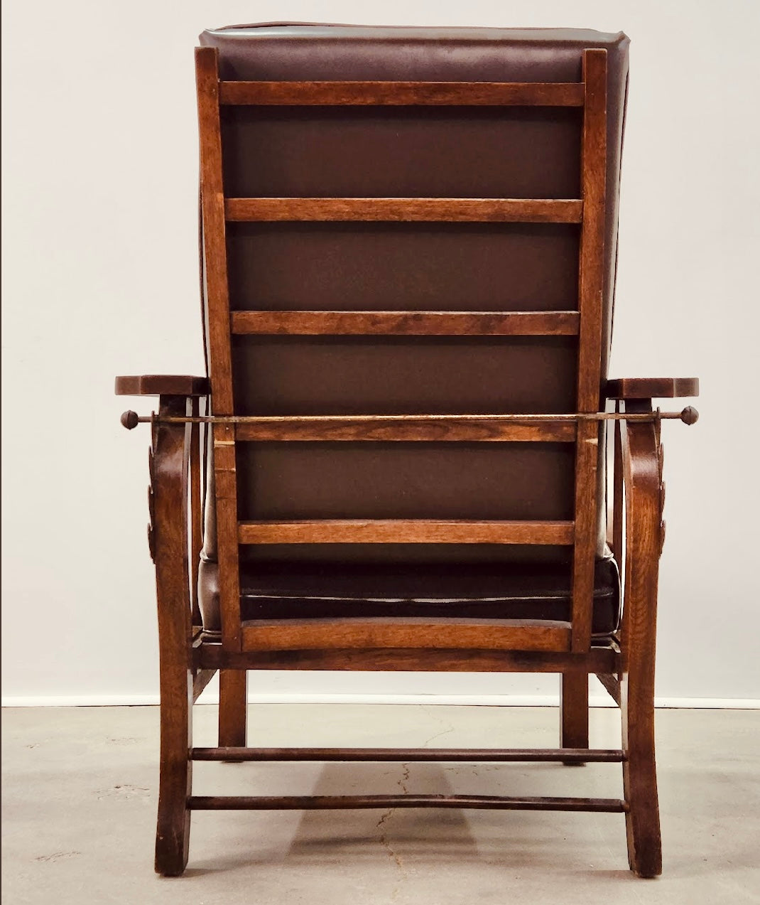 Late 19th century Arts and Crafts Mission style solid oak frame reclining chair with two removable brown leather seat pads. Brass adjustable rod mechanism in back.