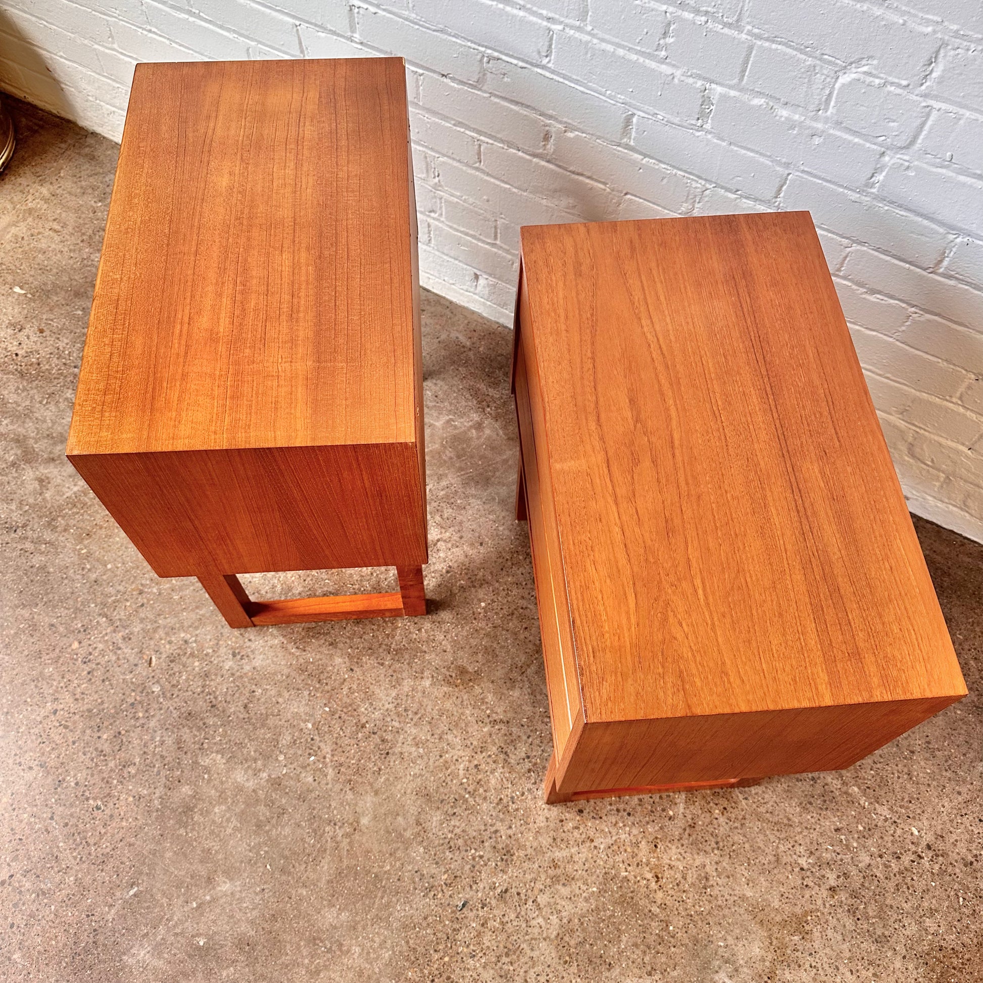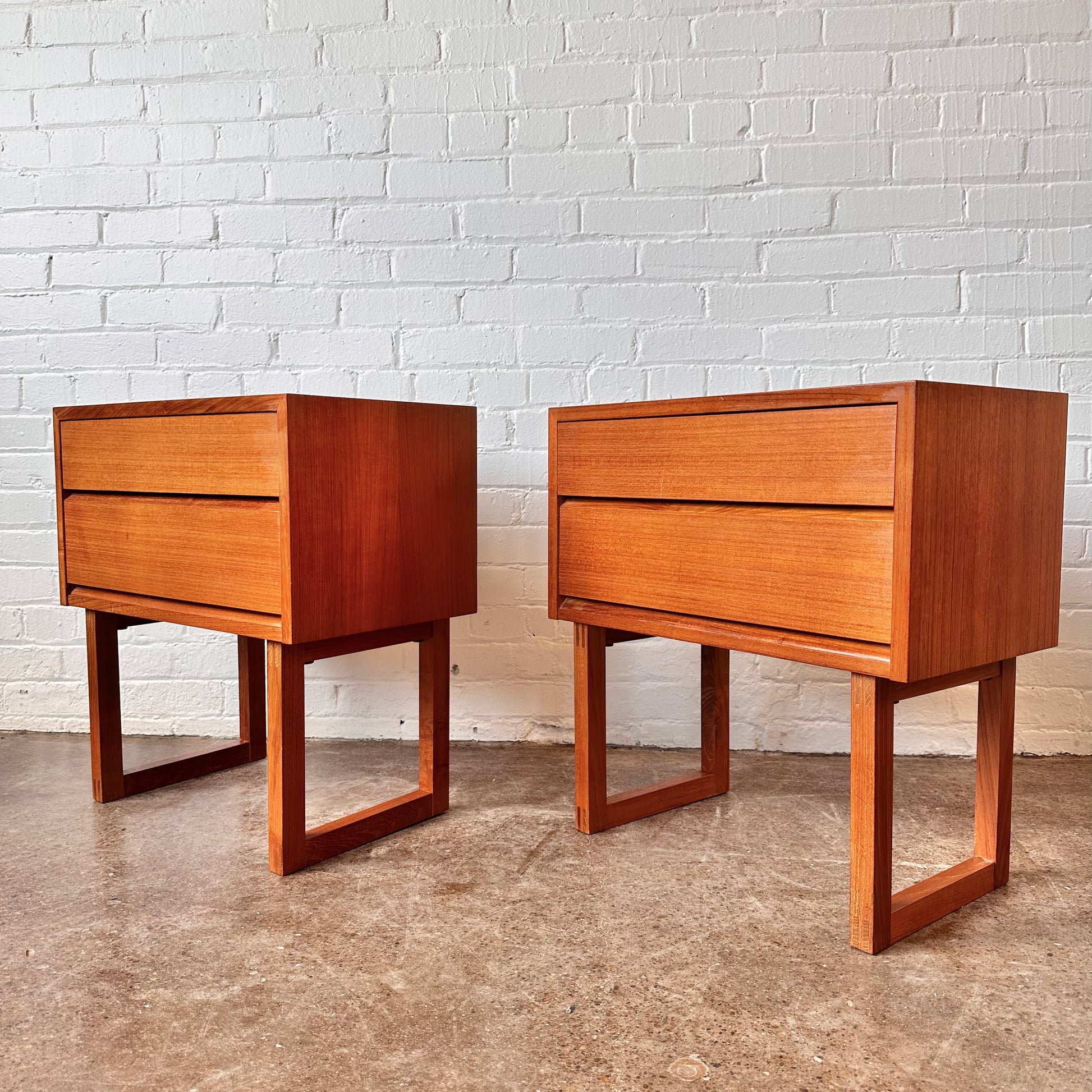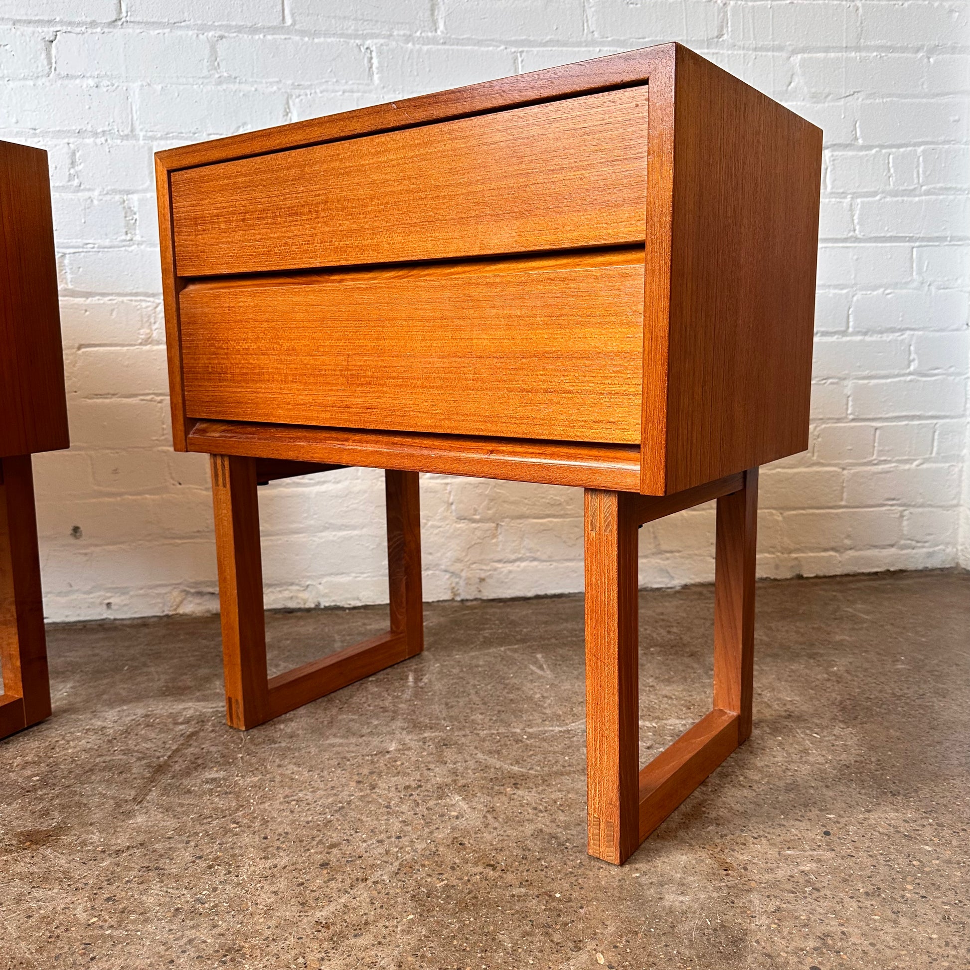 Danish modern teak nightstand / bedside tables with two drawers each and solid teak wood sled bases.