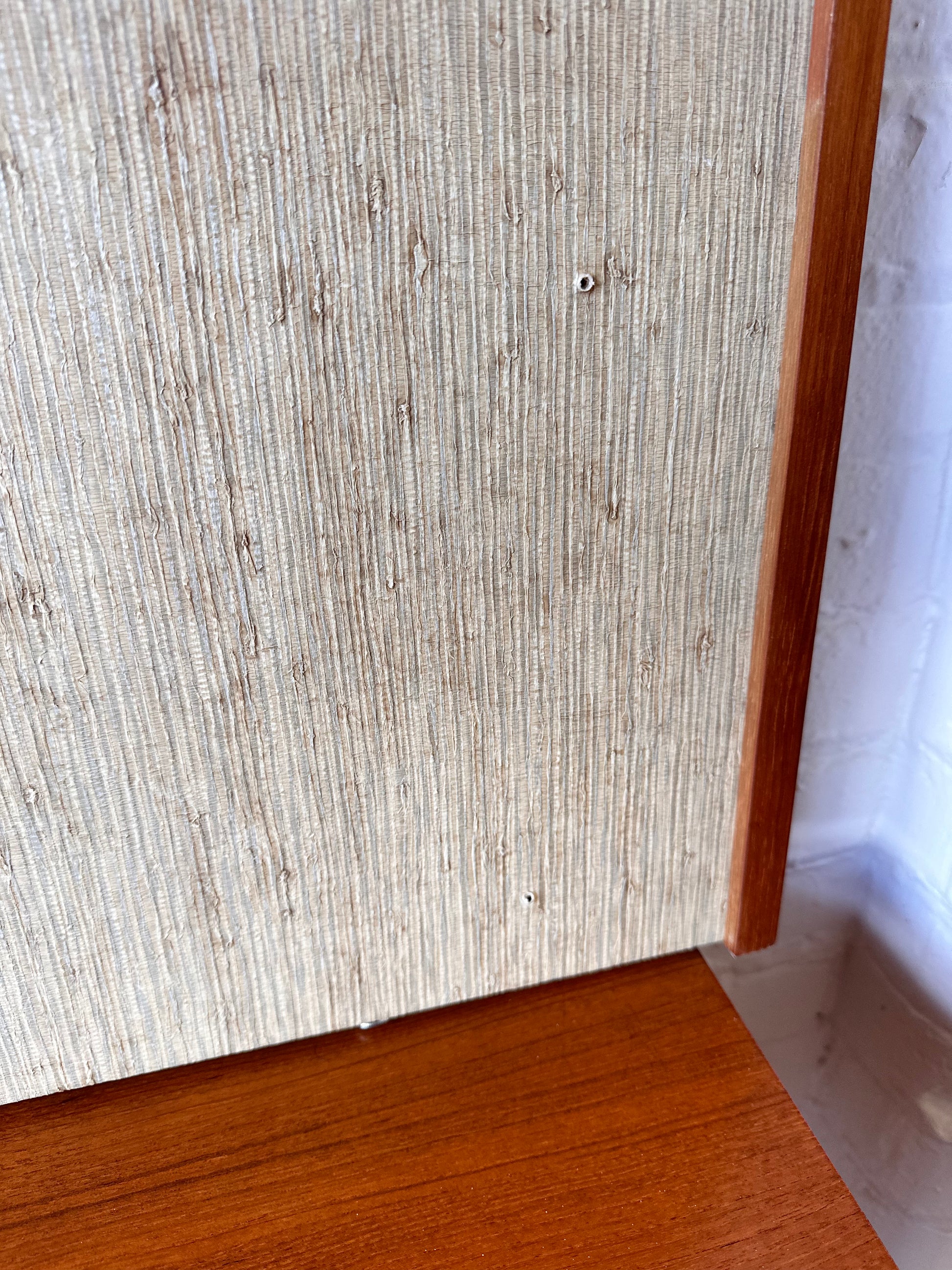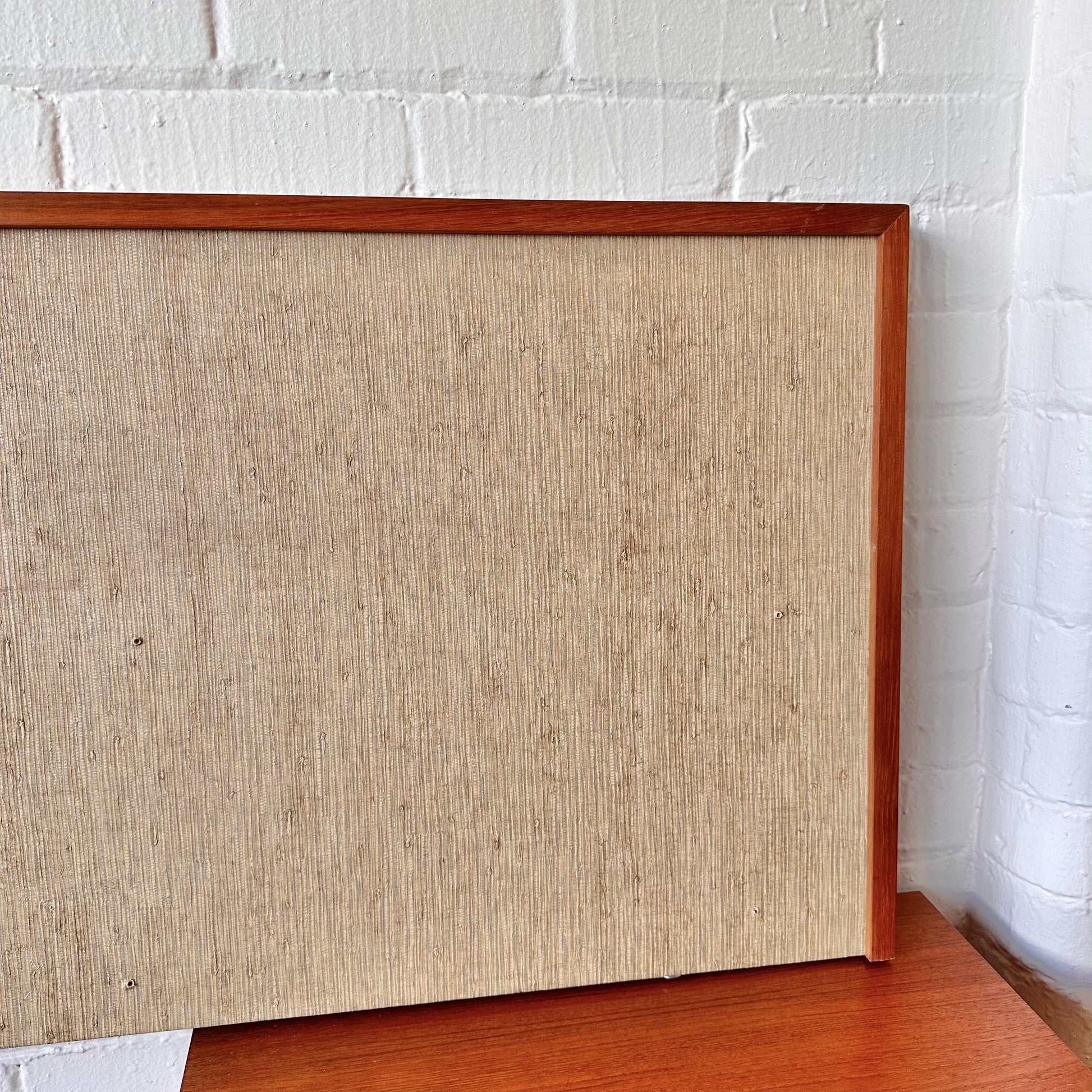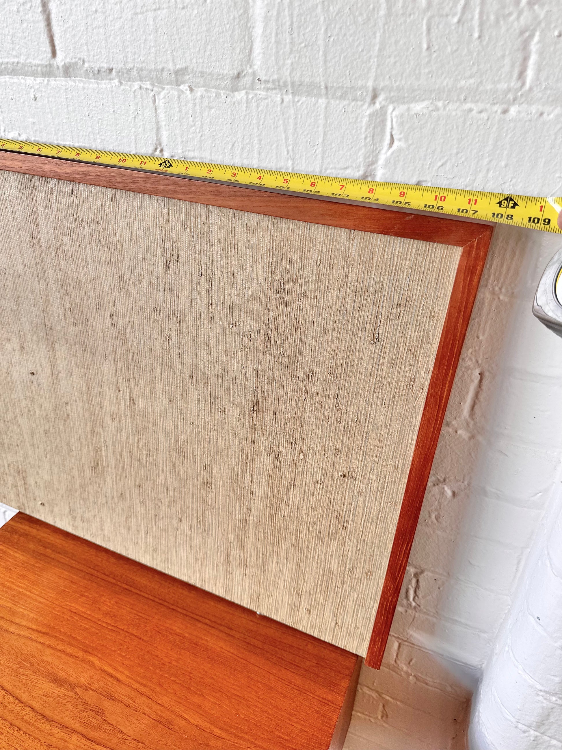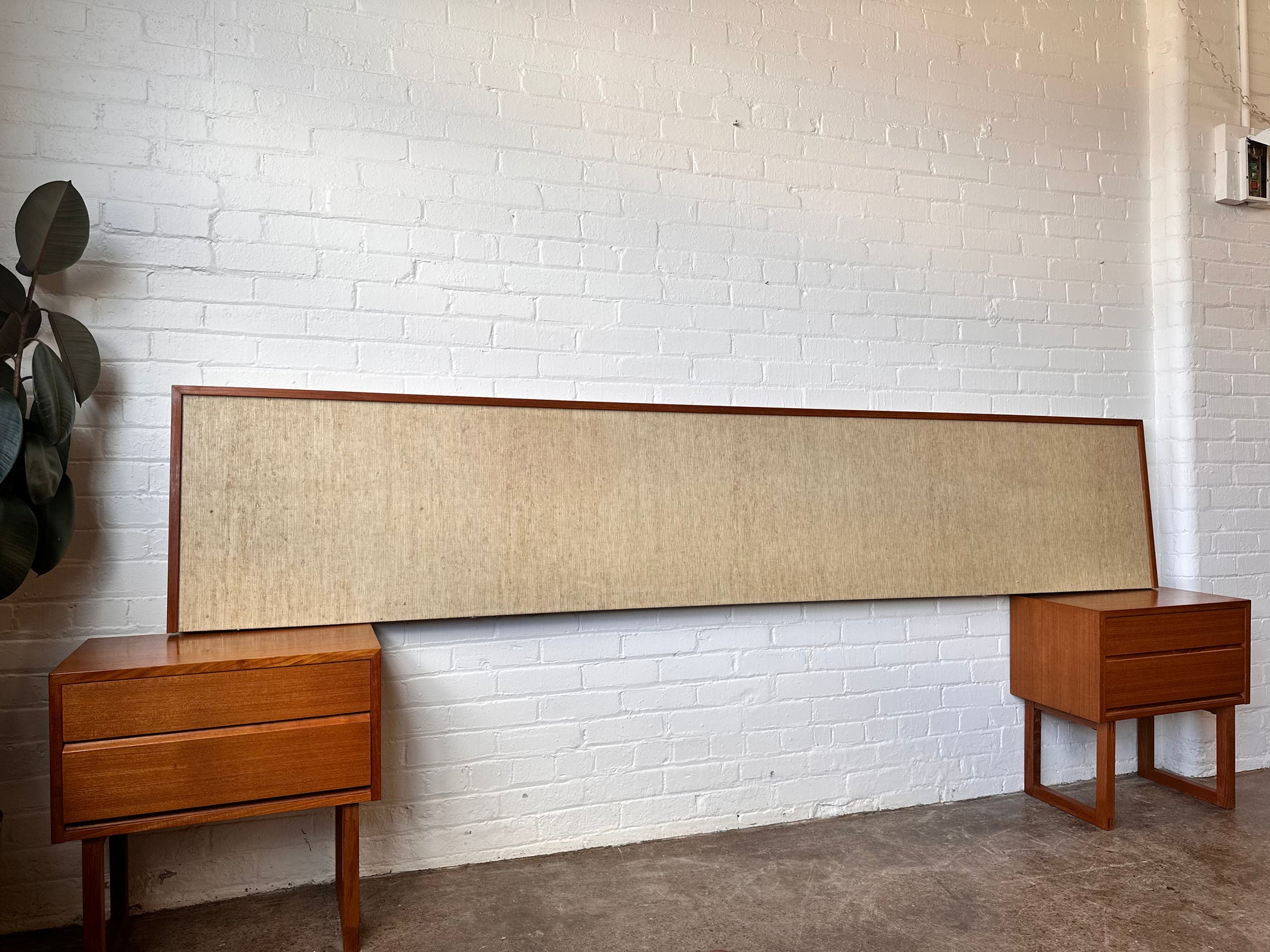 Grasscloth and teak frames headboard was previously used mounted to the back of the nightstands, however it can also be mounted to the wall and /or further out on the nightstands to make room for a king size bed.