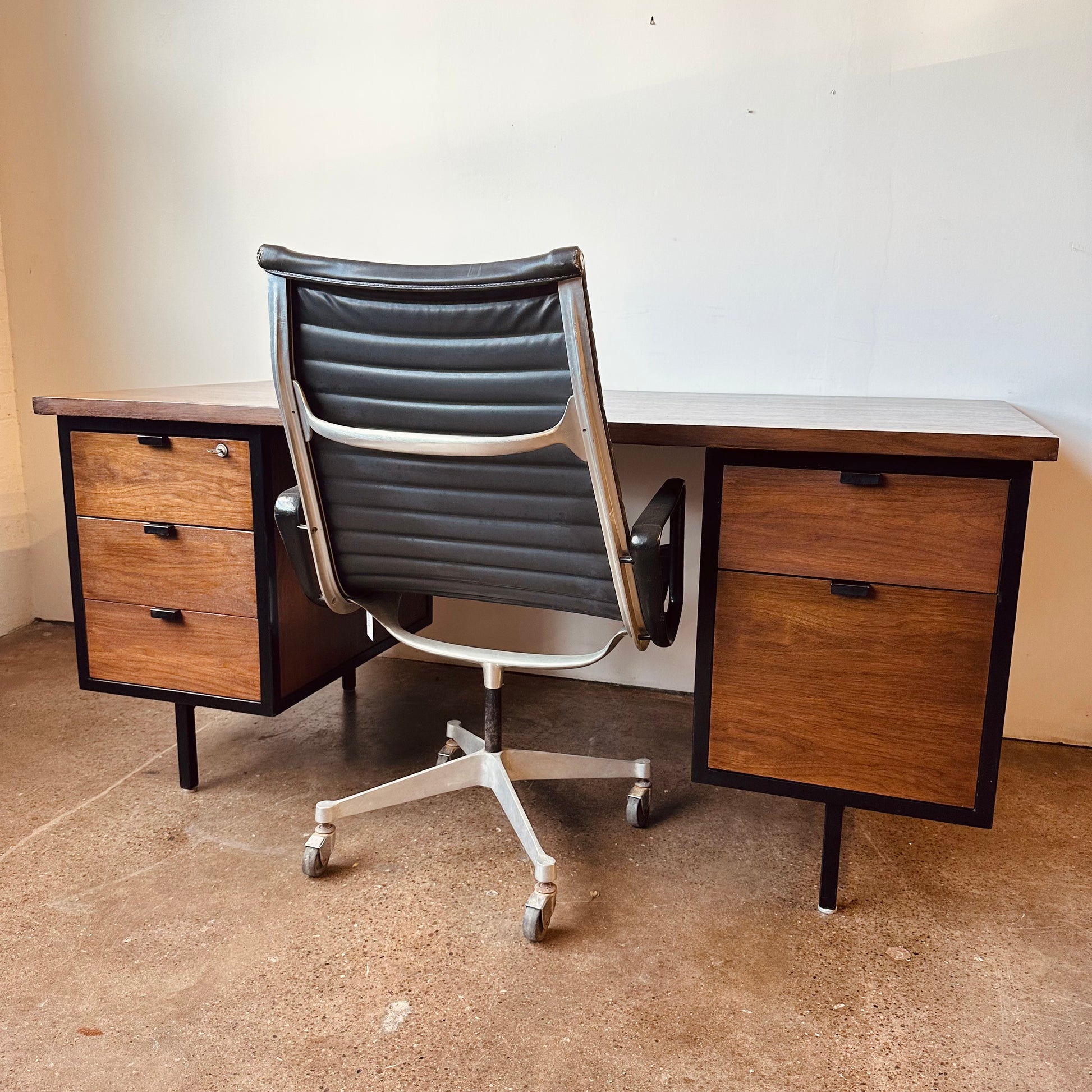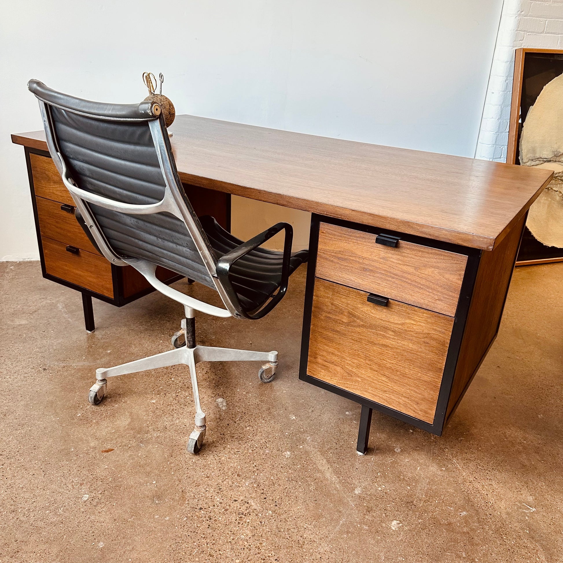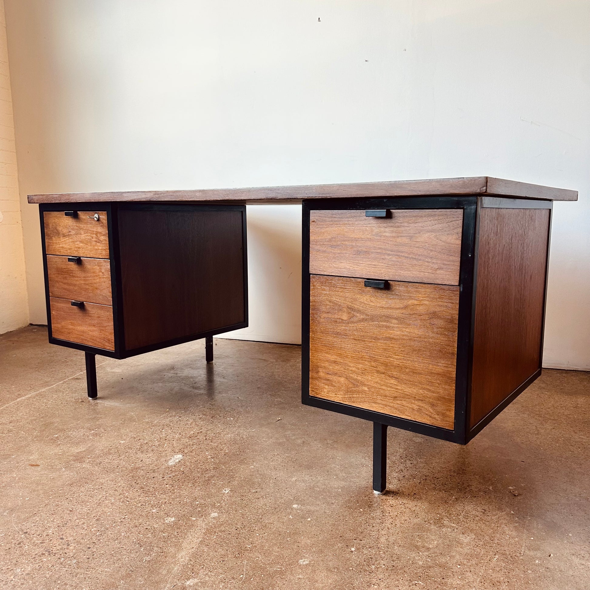 Super rare early private label Robert John manufactured for Knoll executive desk in walnut with black iron framing. This is a large desk with storage and has a finished back to float in a room with client chairs facing it. Bank of deep-set pull out drawers on either side and locking top left drawer or switch it to the right hand side for locking in the whole right hand side. Inside drawer organizers and dividers are also present. Refinished top surface.