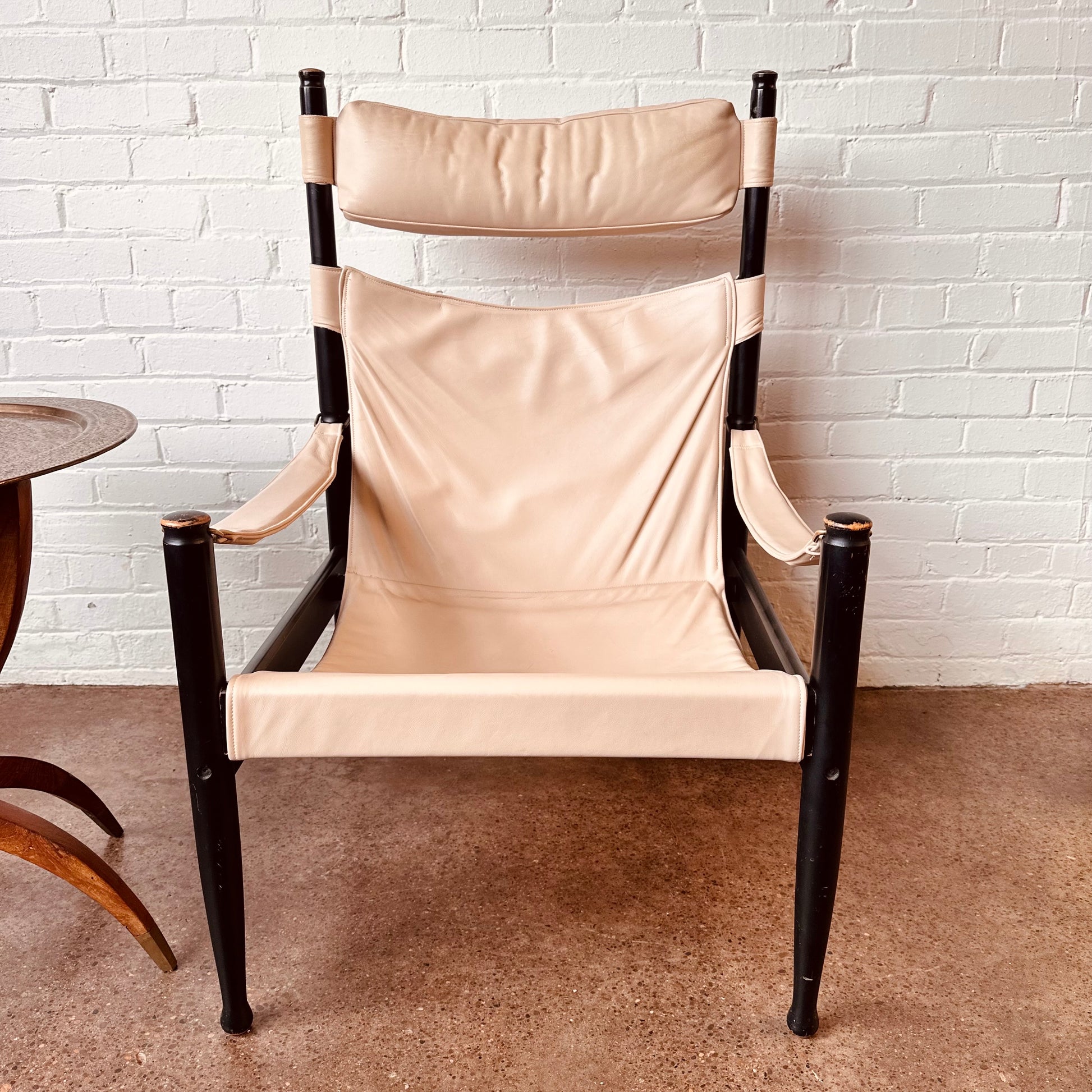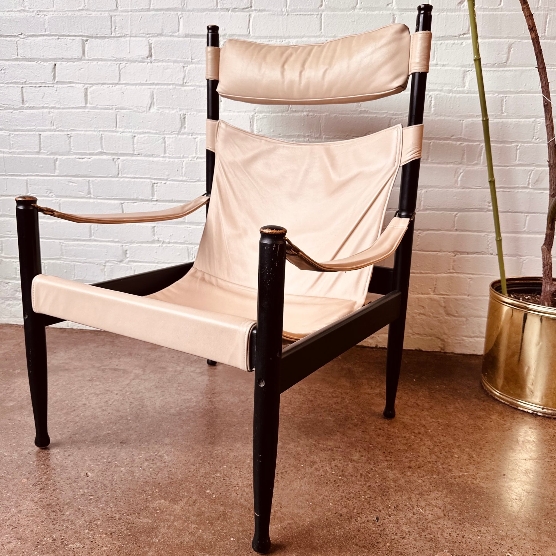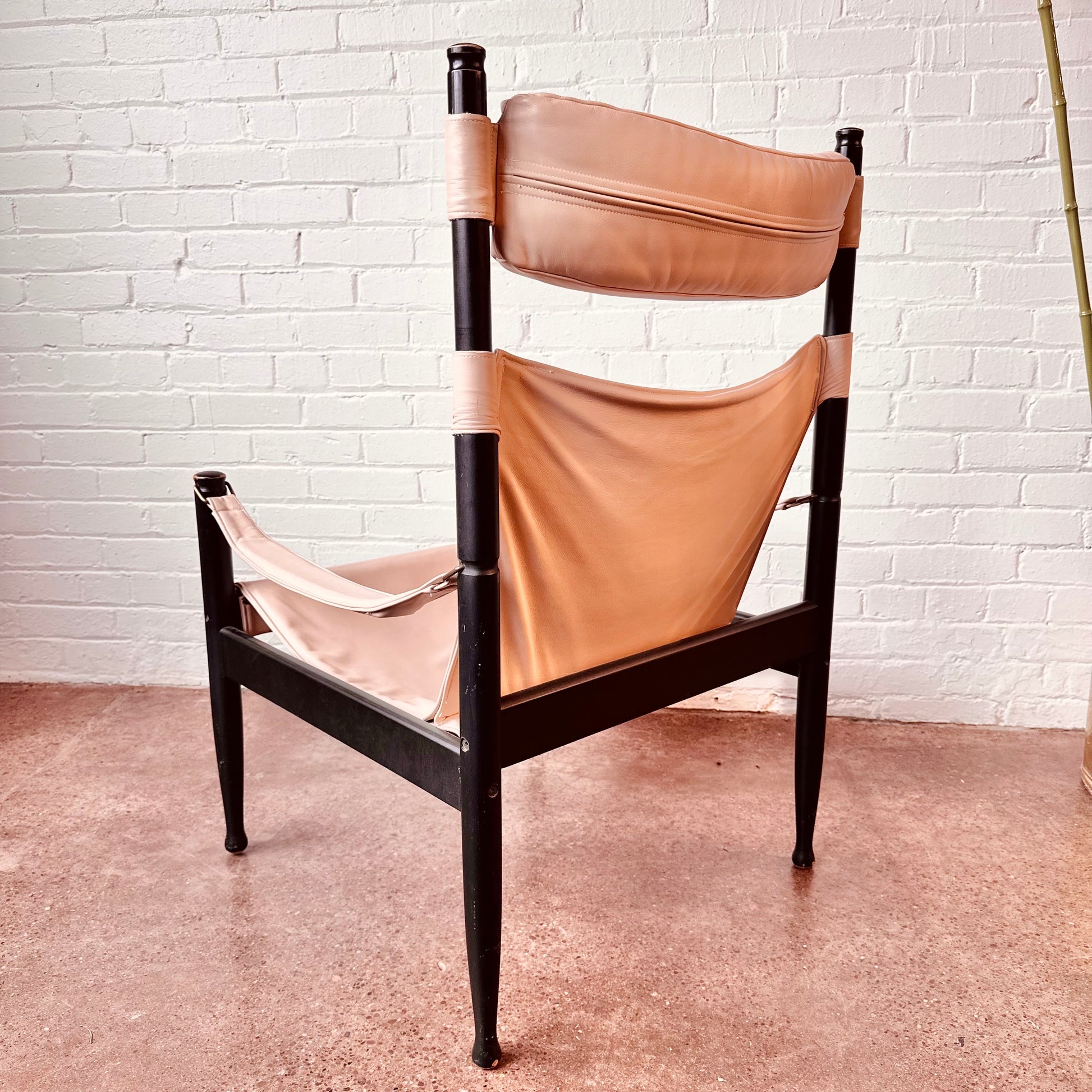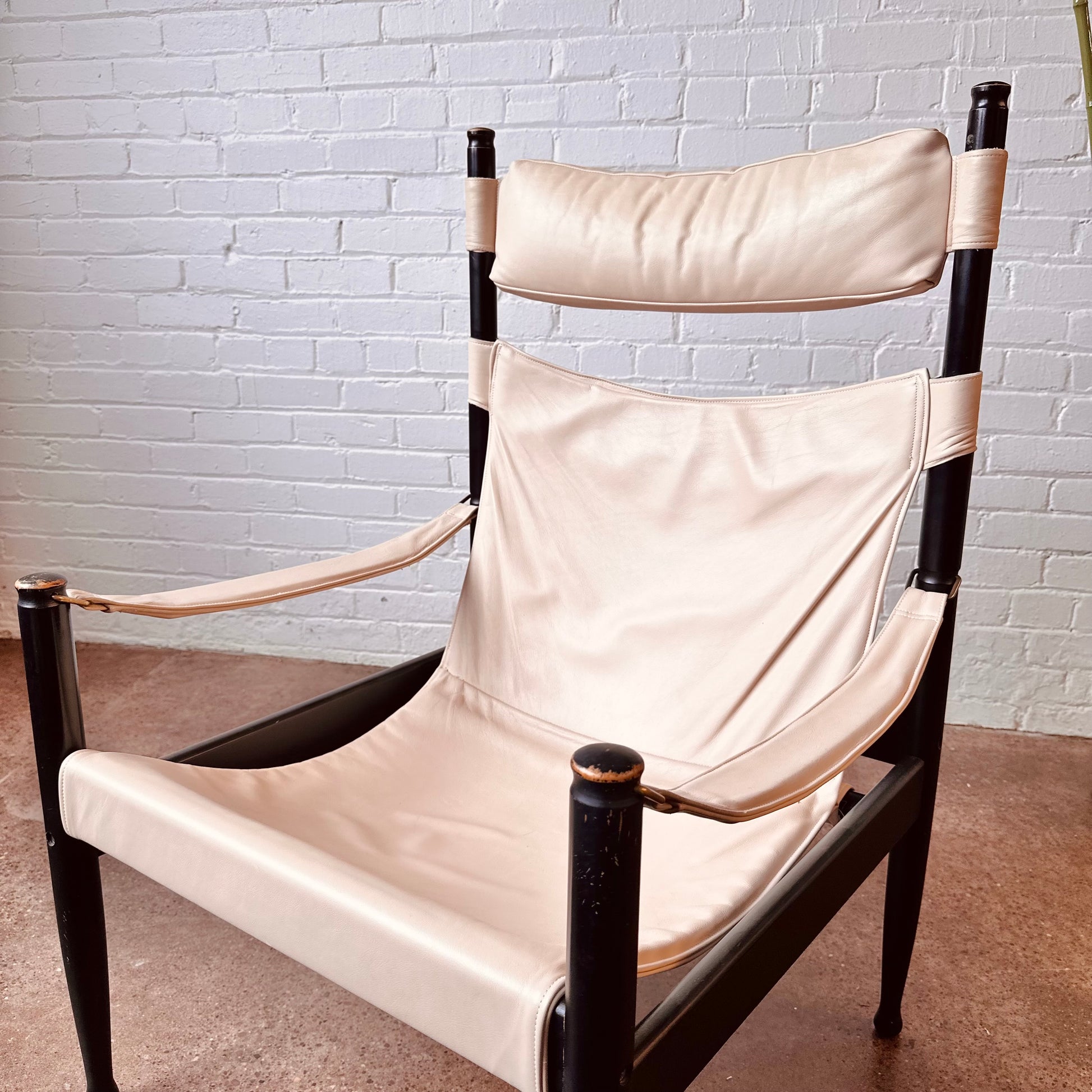 Eric Worts for Niels Eilersen (Denmark) safari high back lounge chair. Ebonized wood and light tan leather sling upholstery and brass hardware.