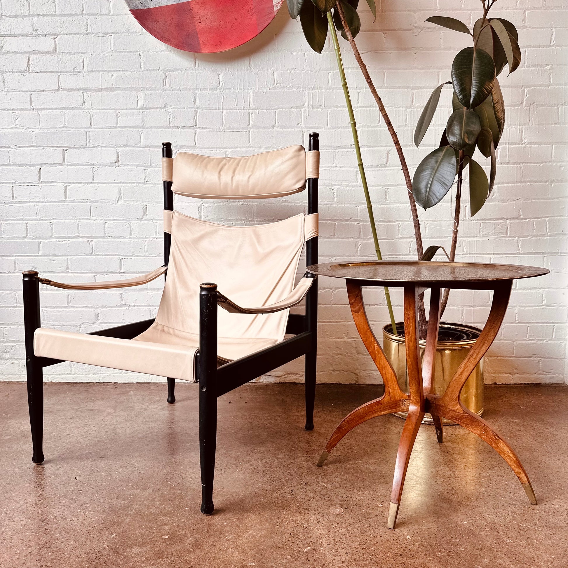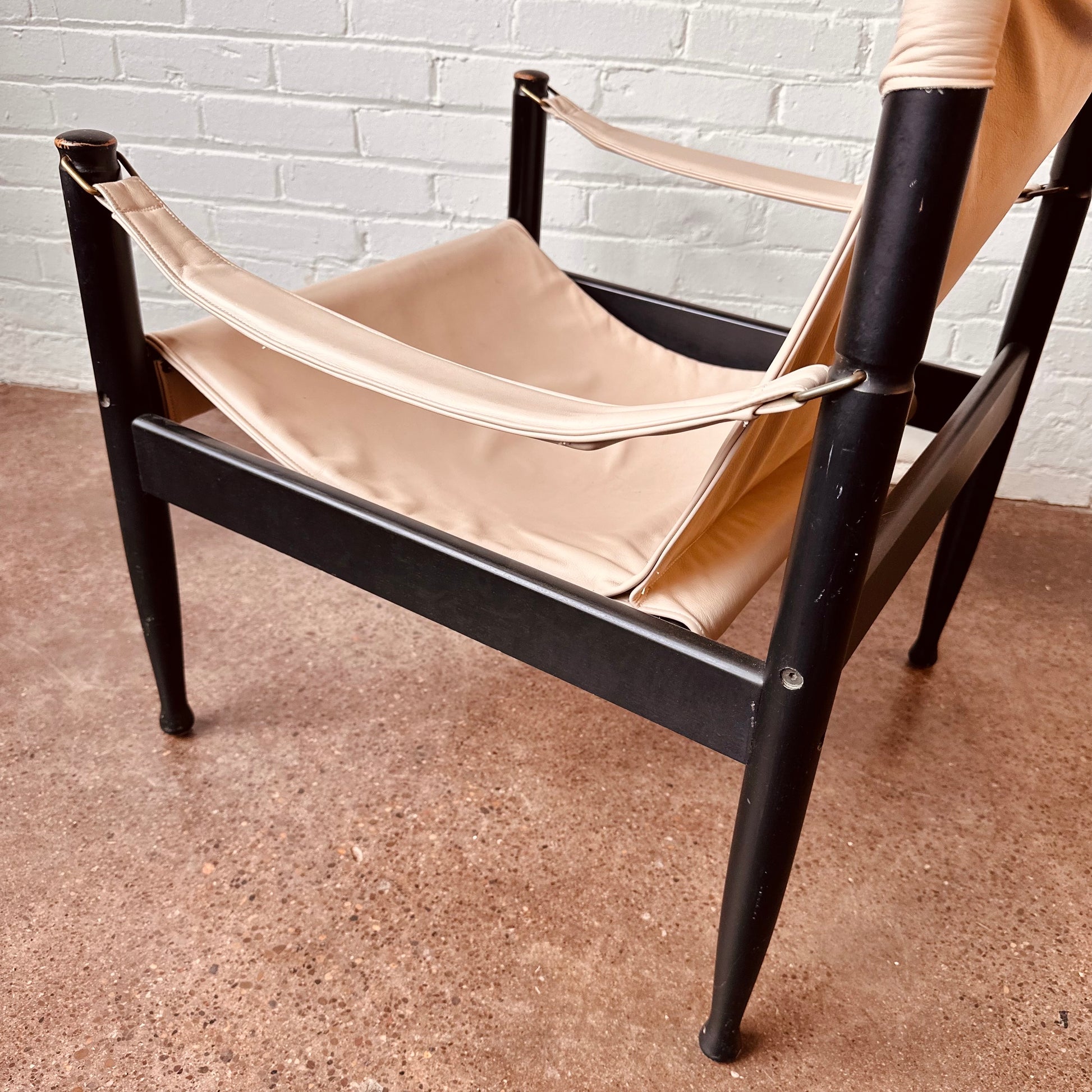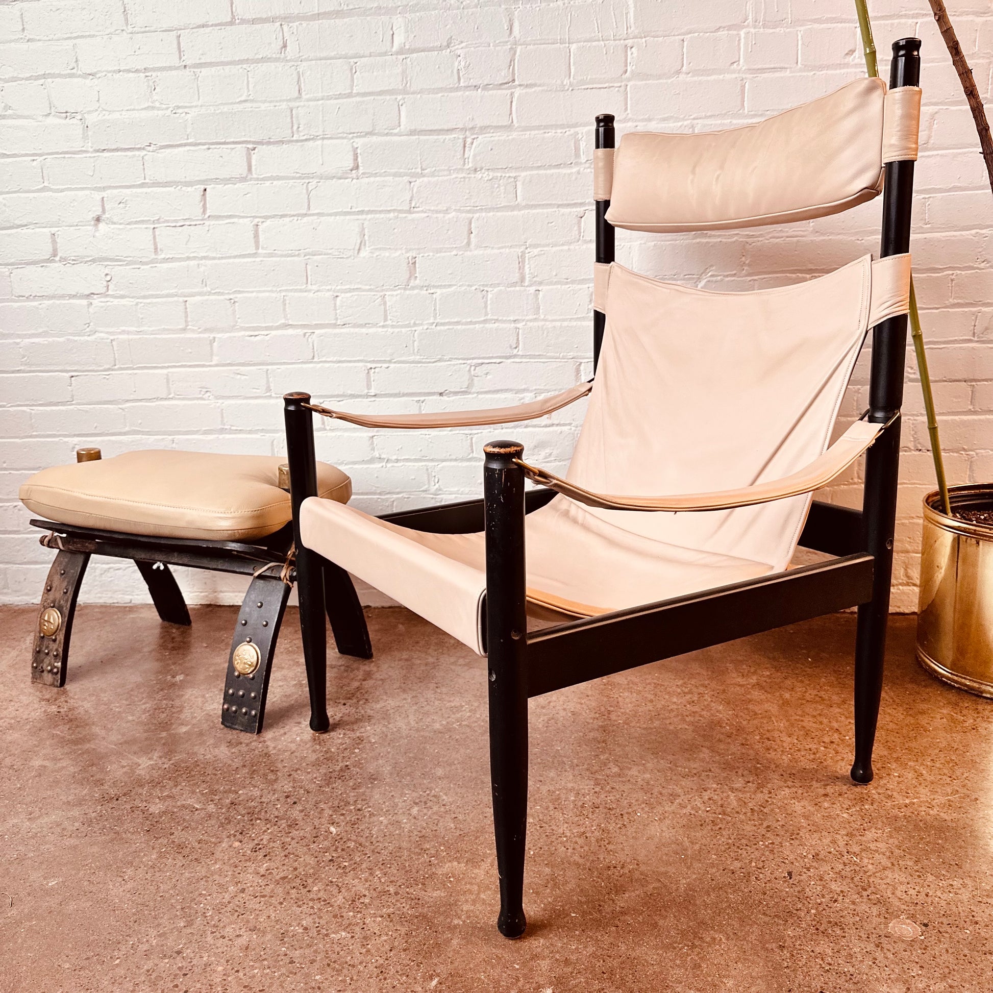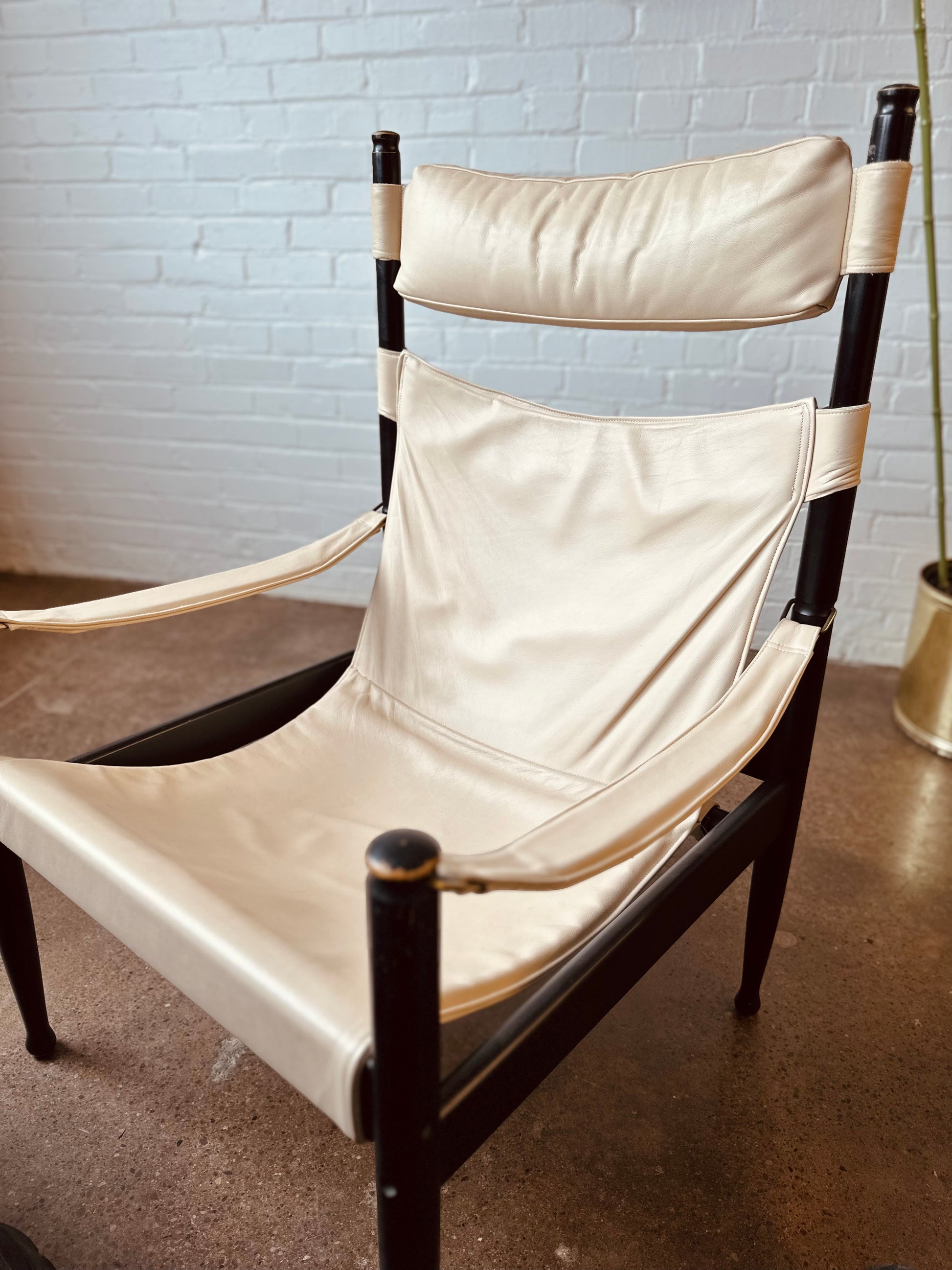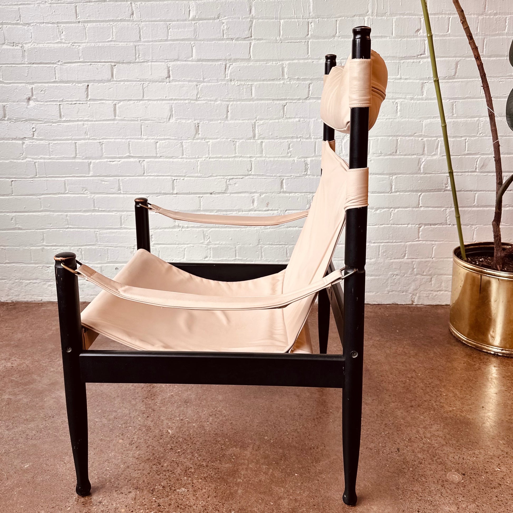 Eric Worts for Niels Eilersen (Denmark) safari high back lounge chair. Ebonized wood and light tan leather sling upholstery and brass hardware.