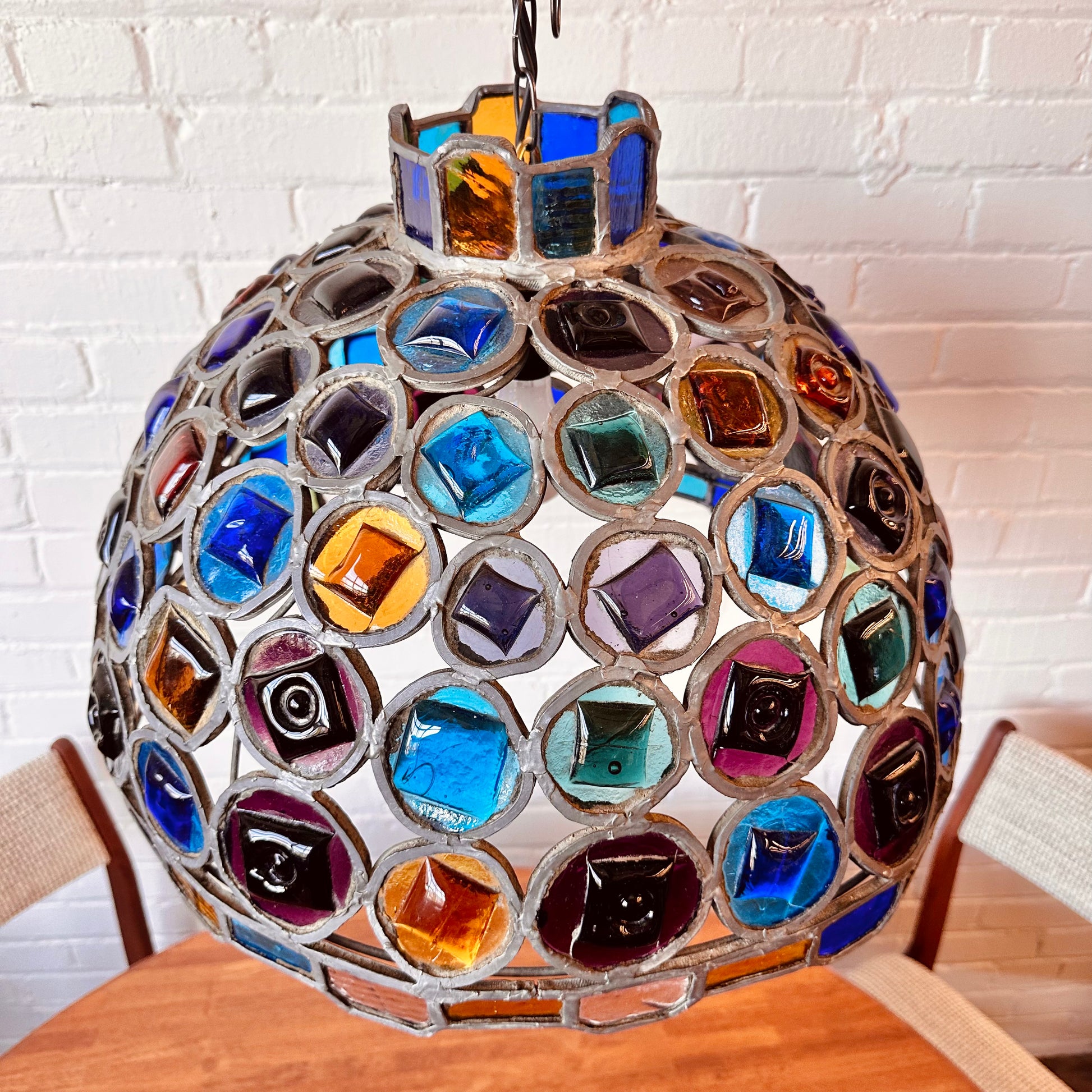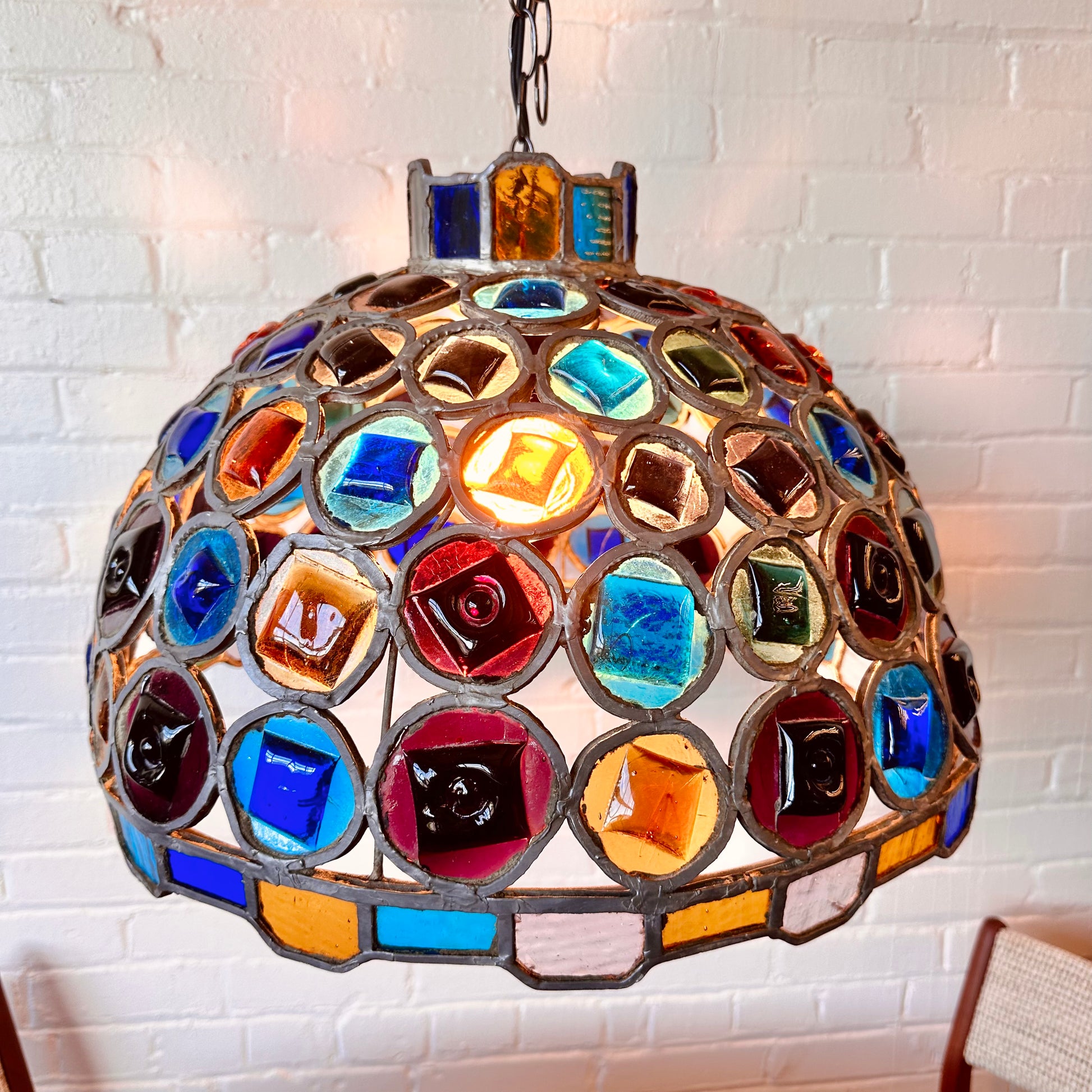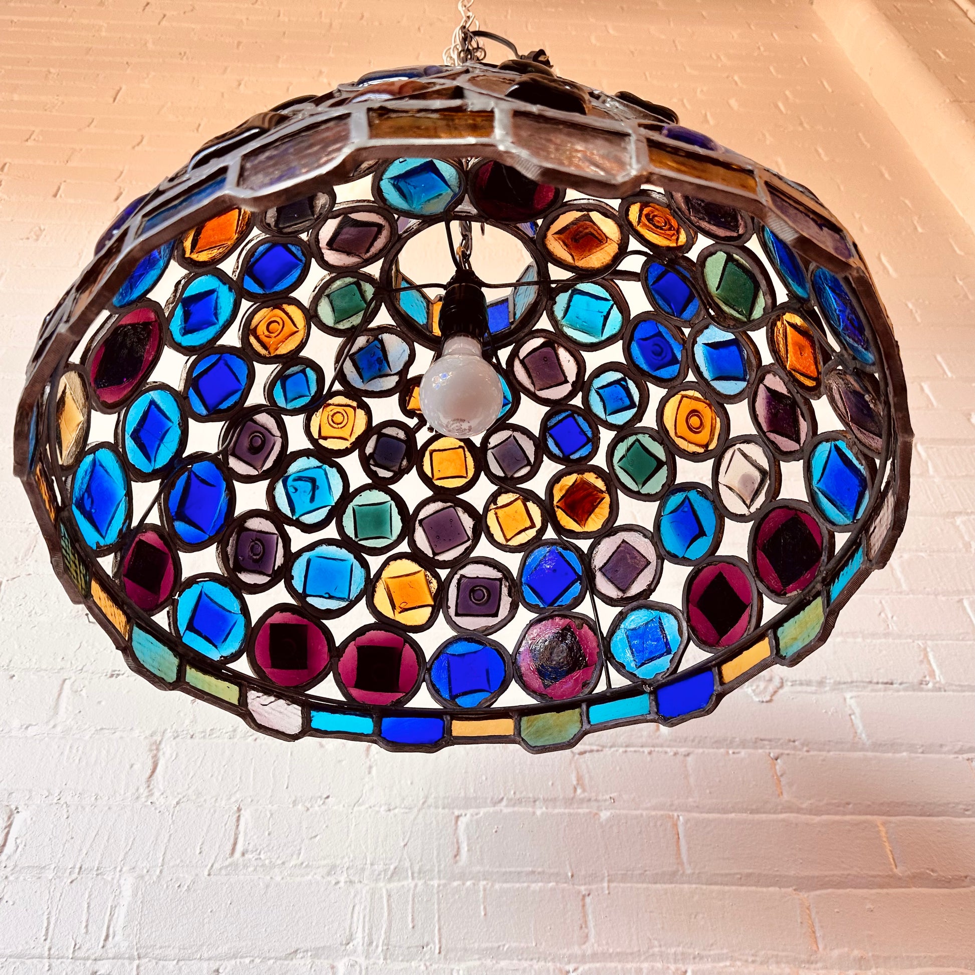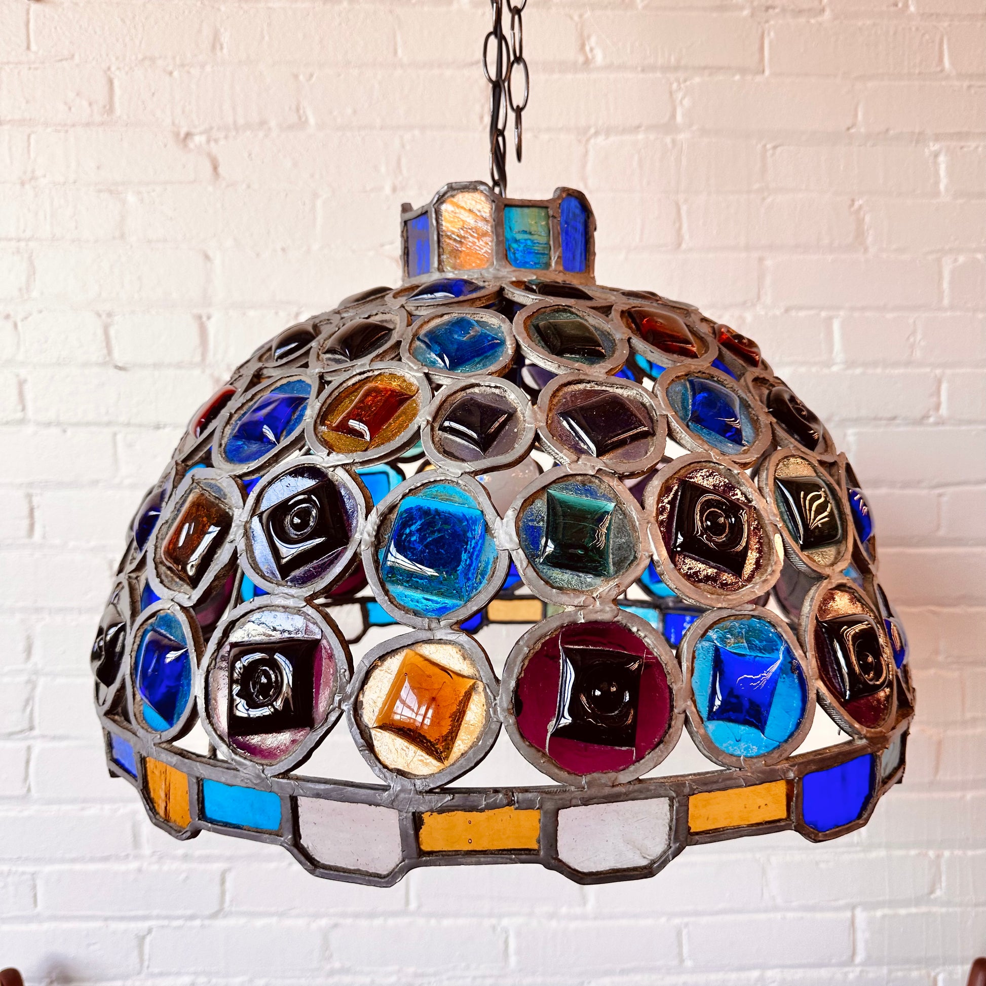 This vintage mid-century lamp was crafted by Mexican artisan Felipe Delfinger, c. 1970s. The single bulb swag style chandelier, measuring 20” diameter by 13” tall with 27” chain, is wired with a two-prong plug, but can be fitted for hardwiring. Remarkable cast of light and color when lit, this colorful piece features a 2.5’ link chain and multi-hued glass, embodying subtle Arts and Crafts, Gothic, and Brutalist influence with a Mexican Modernist execution.
