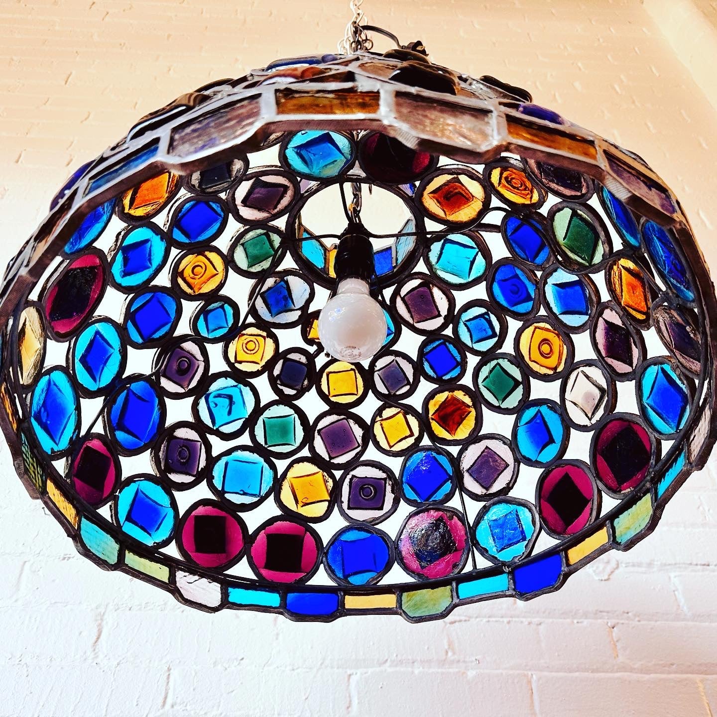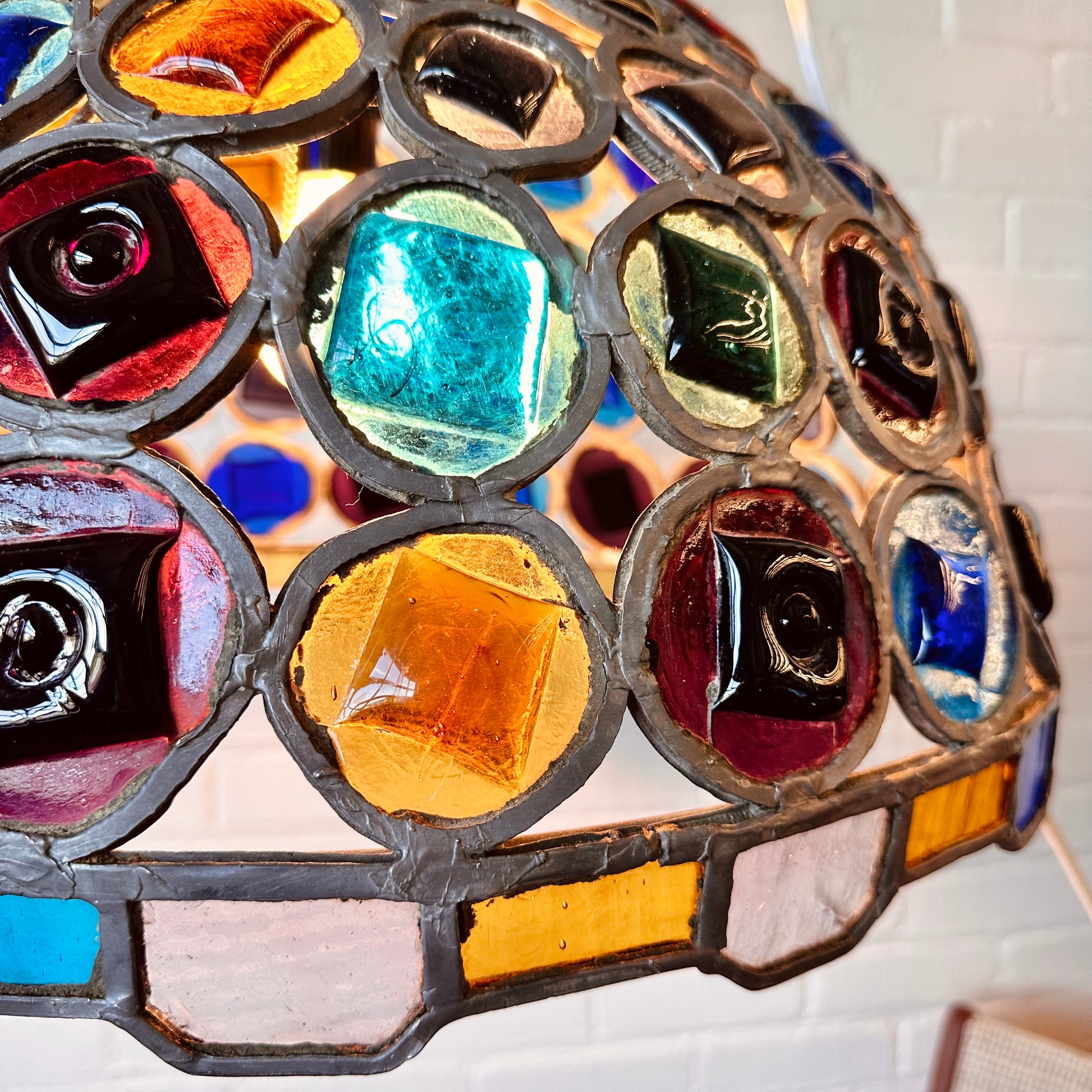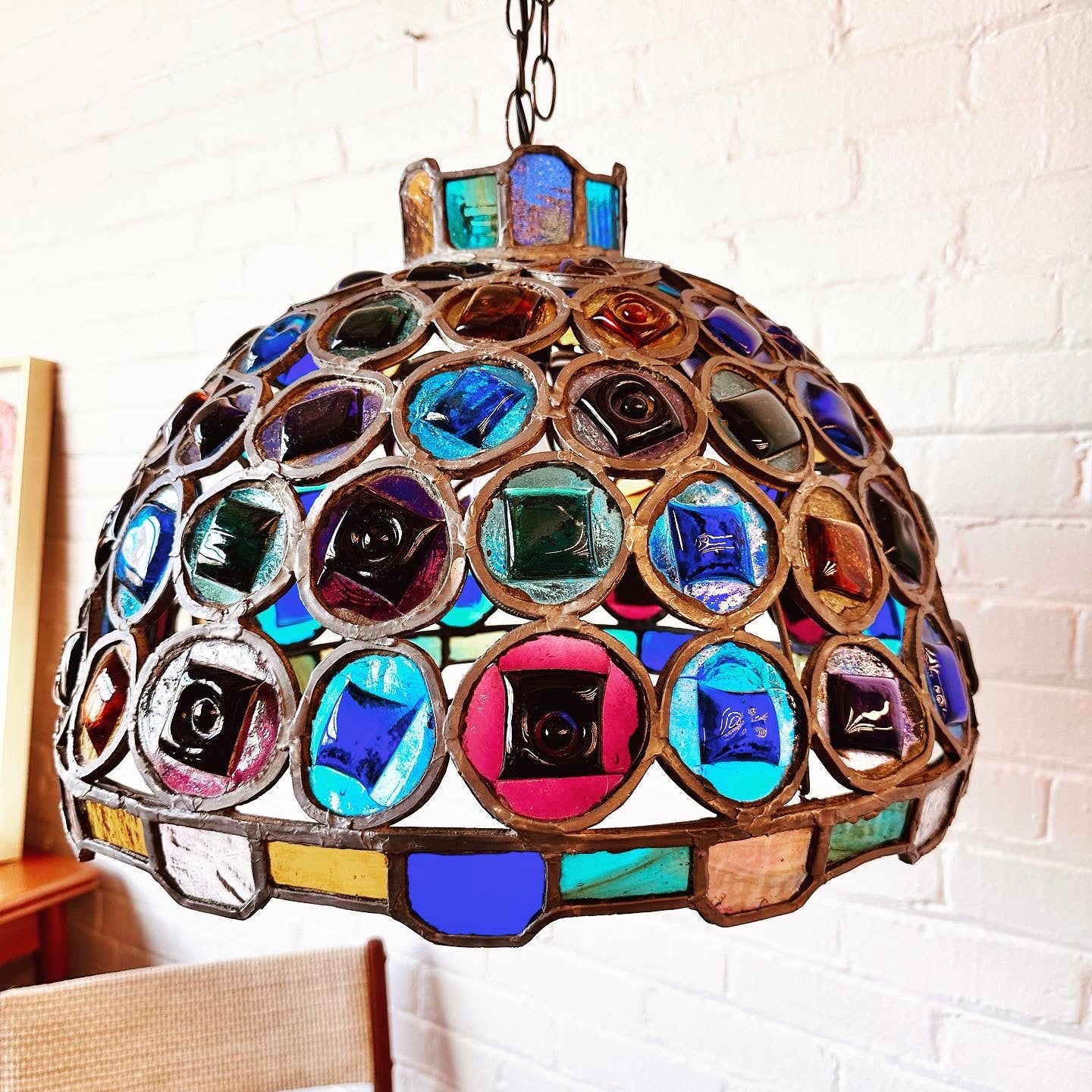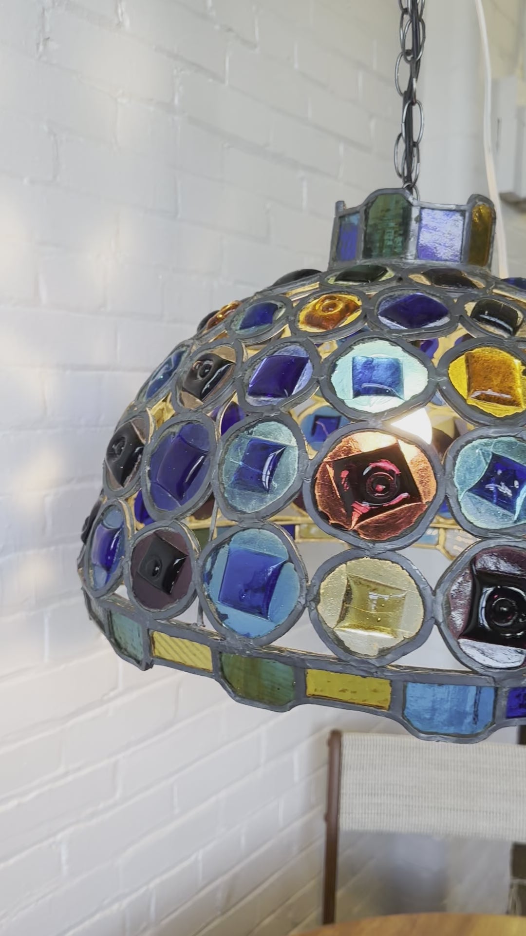 This vintage mid-century lamp was crafted by Mexican artisan Felipe Delfinger, c. 1970s. The single bulb swag style chandelier, measuring 20” diameter by 13” tall with 27” chain, is wired with a two-prong plug, but can be fitted for hardwiring. Remarkable cast of light and color when lit, this colorful piece features a 2.5’ link chain and multi-hued glass, embodying subtle Arts and Crafts, Gothic, and Brutalist influence with a Mexican Modernist execution.
