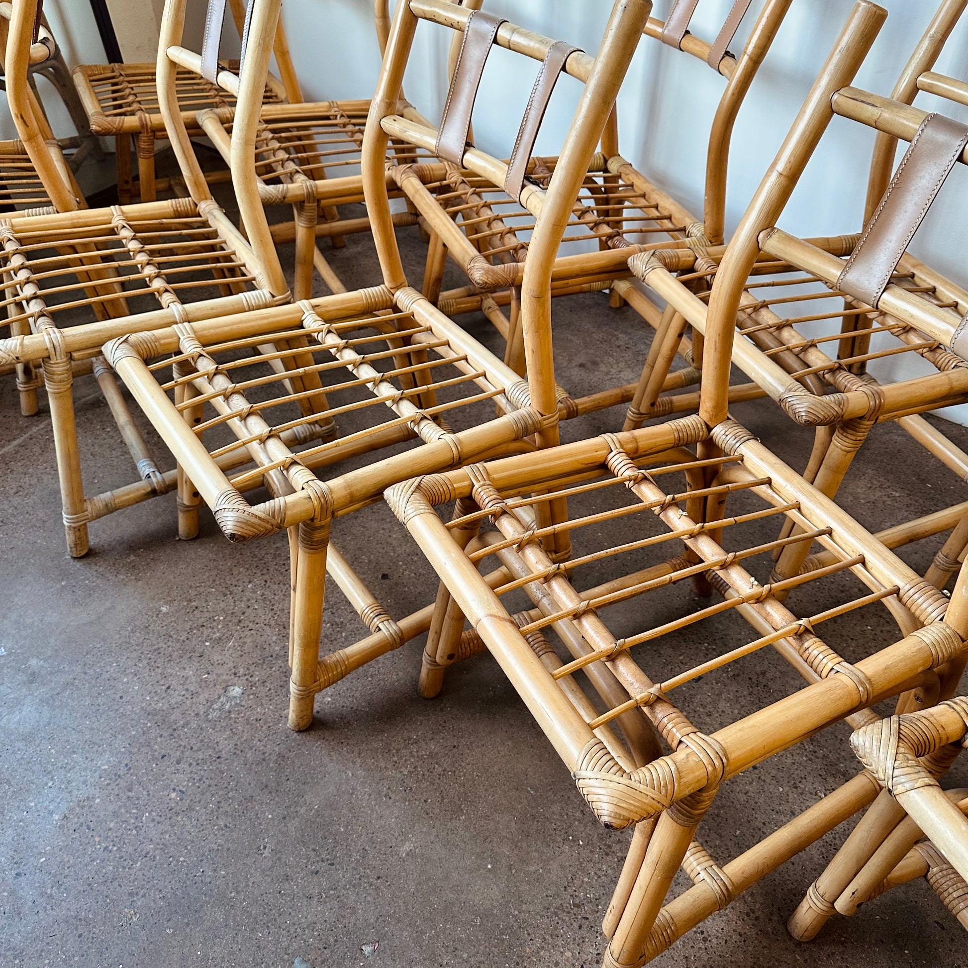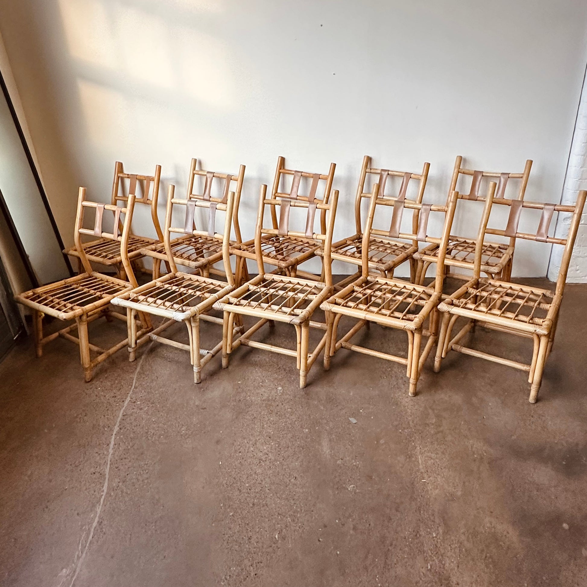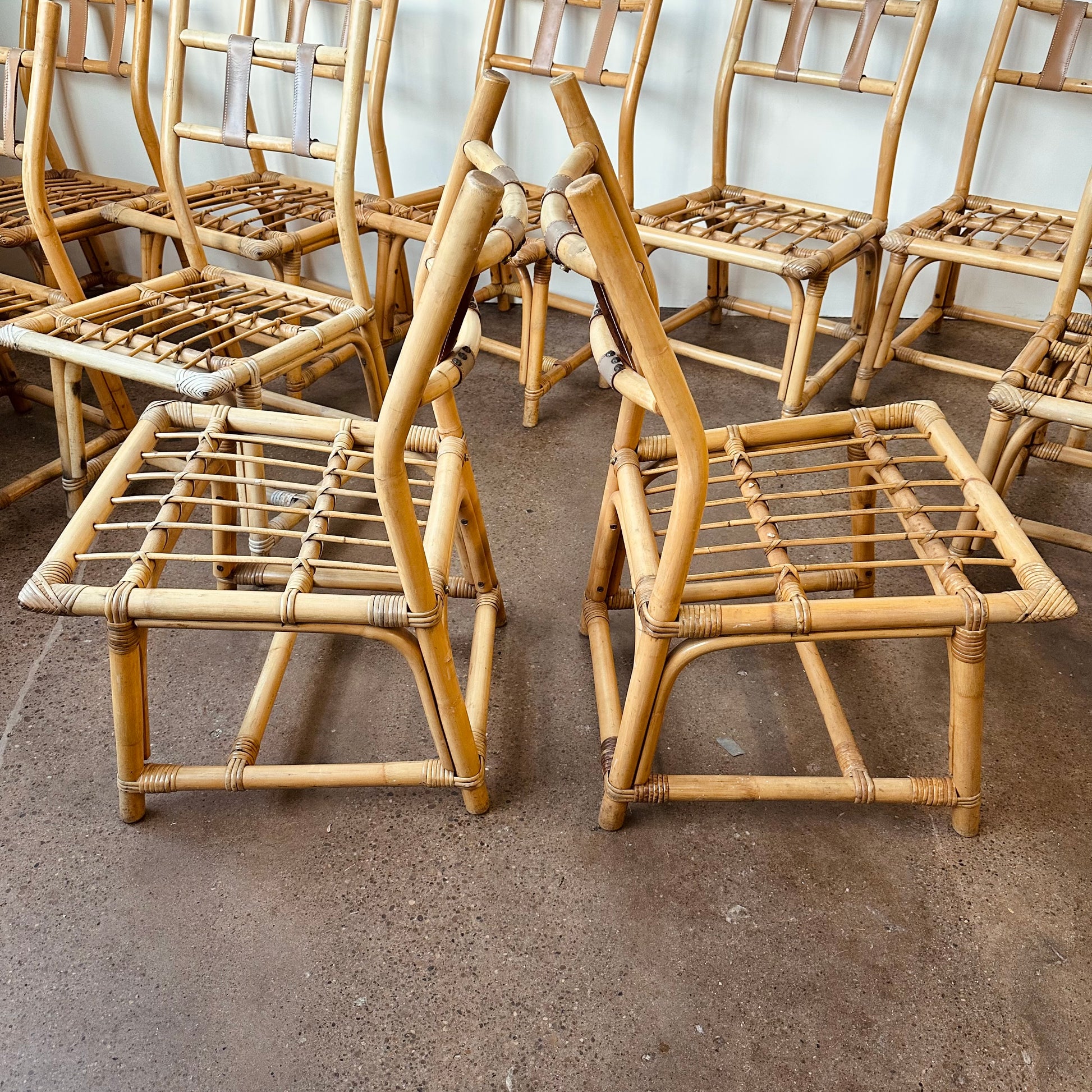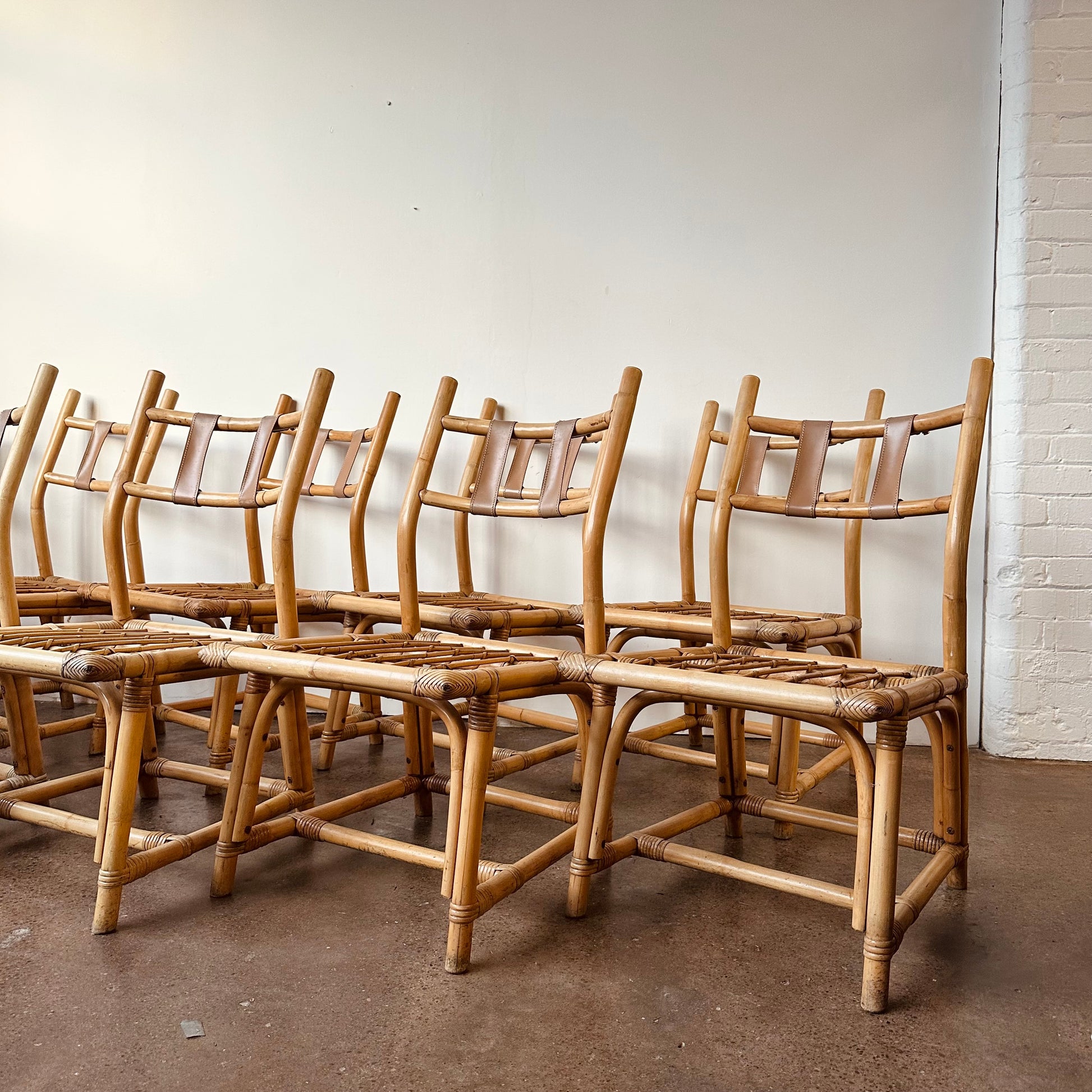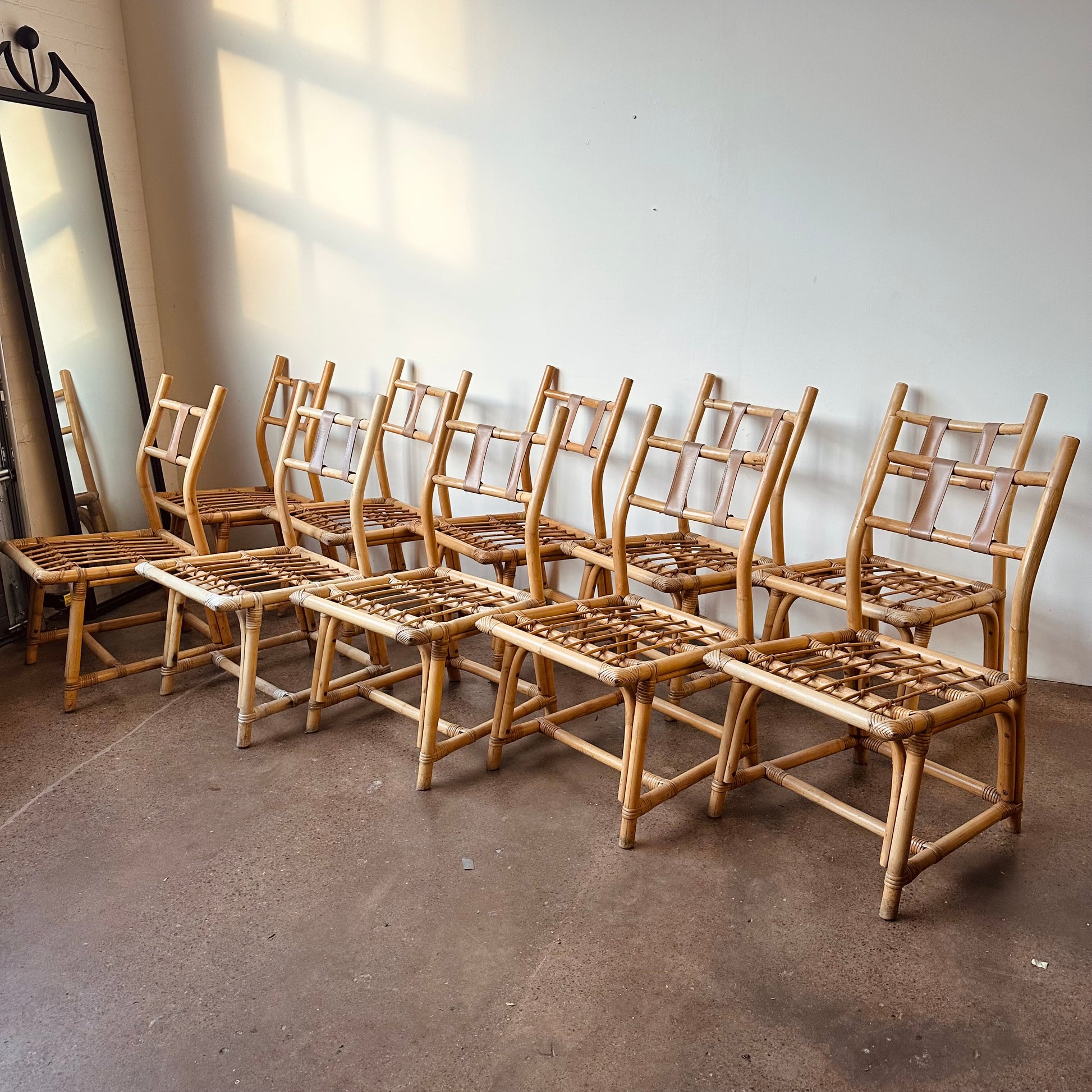 Set of 10 Hollywood regency or Italian style rattan split reed and bamboo indoor or outdoor dining chairs circa 1960s. Leather strapping supports on back and snaps for future seat pads. Will include an old set of seat pads for reference to have new pads made. Great for indoor or outdoor use.