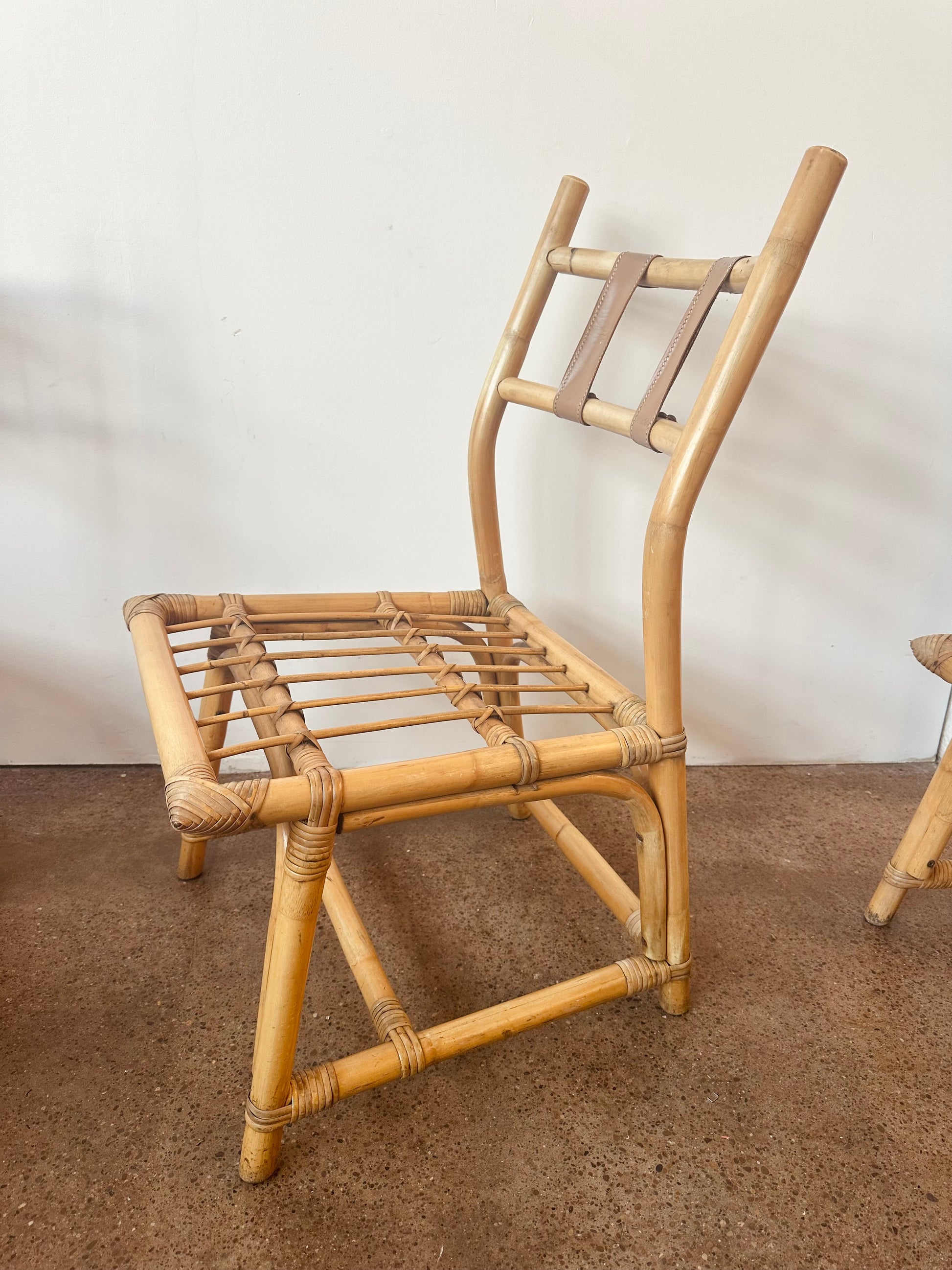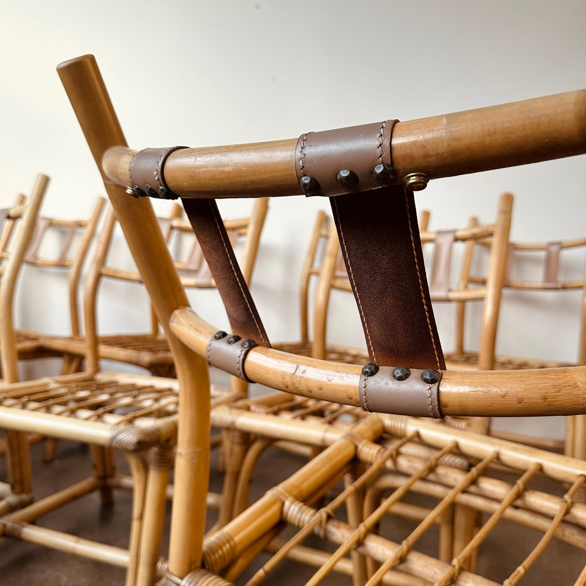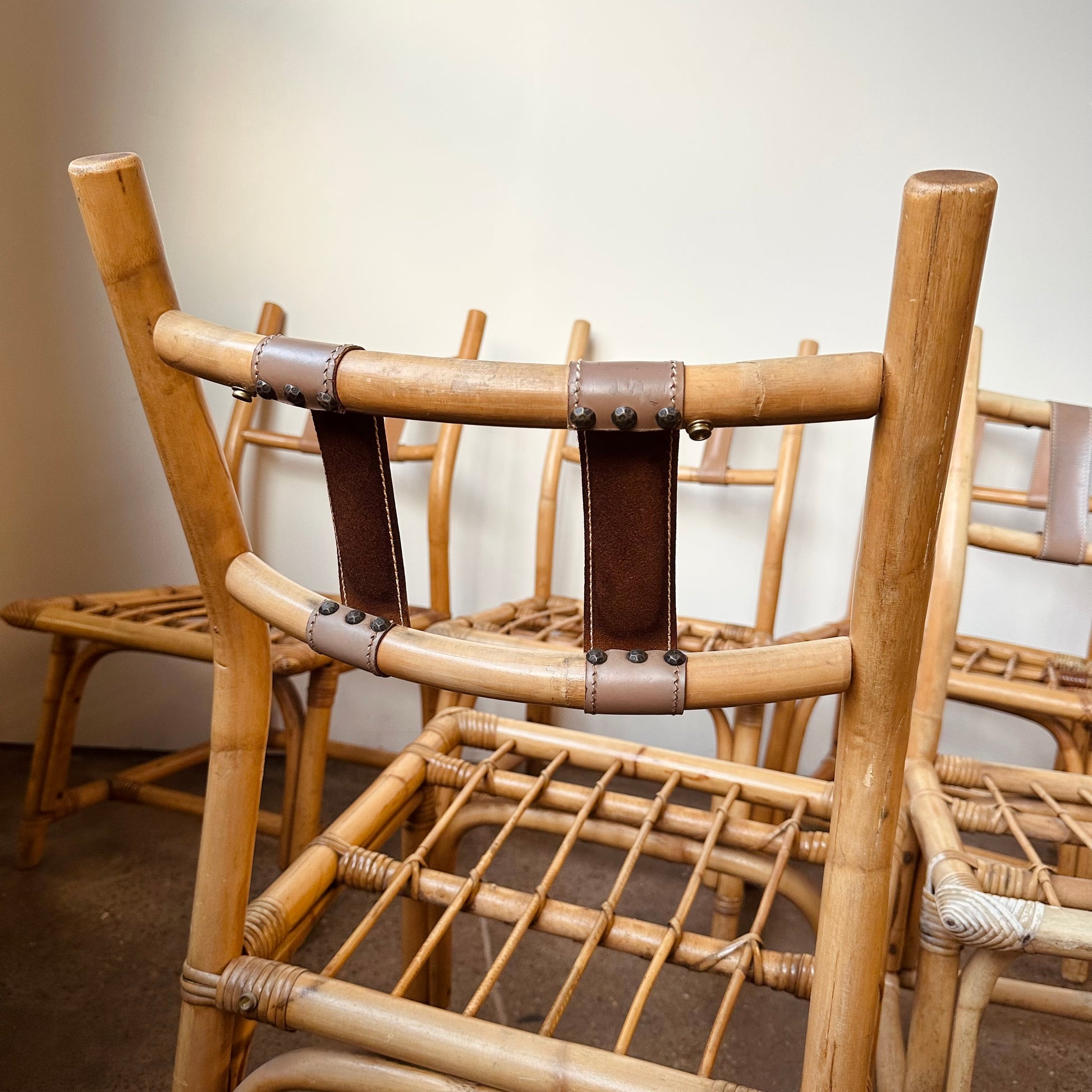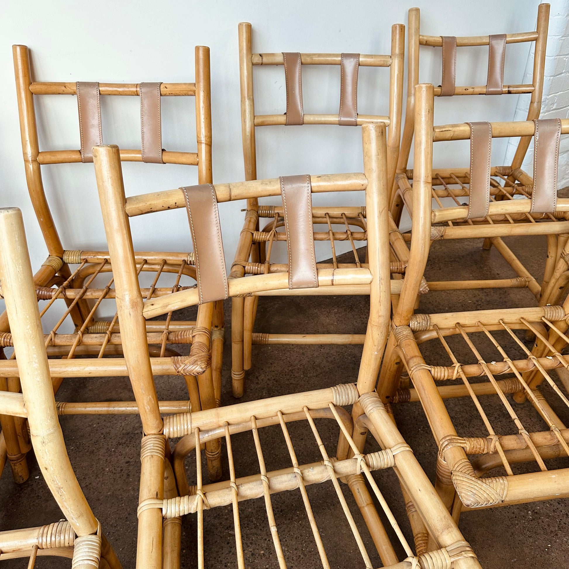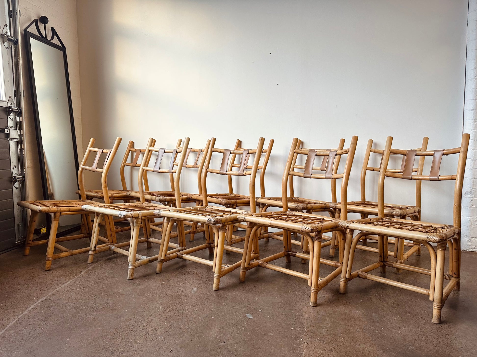 Set of 10 Hollywood regency or Italian style rattan split reed and bamboo indoor or outdoor dining chairs circa 1960s. Leather strapping supports on back and snaps for future seat pads. Will include an old set of seat pads for reference to have new pads made. Great for indoor or outdoor use.