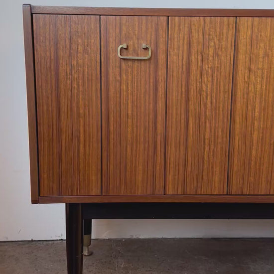 Striking mid-century Danish style walnut "Librenza" credenza designed by E. Gomme for the revered British manufacturer G Plan, dated 1959. This sleek piece has a central bank of three drawers flanked on either side by concertina doors enclosing interior storage with shelf. Features original solid brass hardware, raised on tapered black legs with adjustable feet, and retains the early "G Plan" stamp. All handsomely restored to its original state of 60+ years ago.