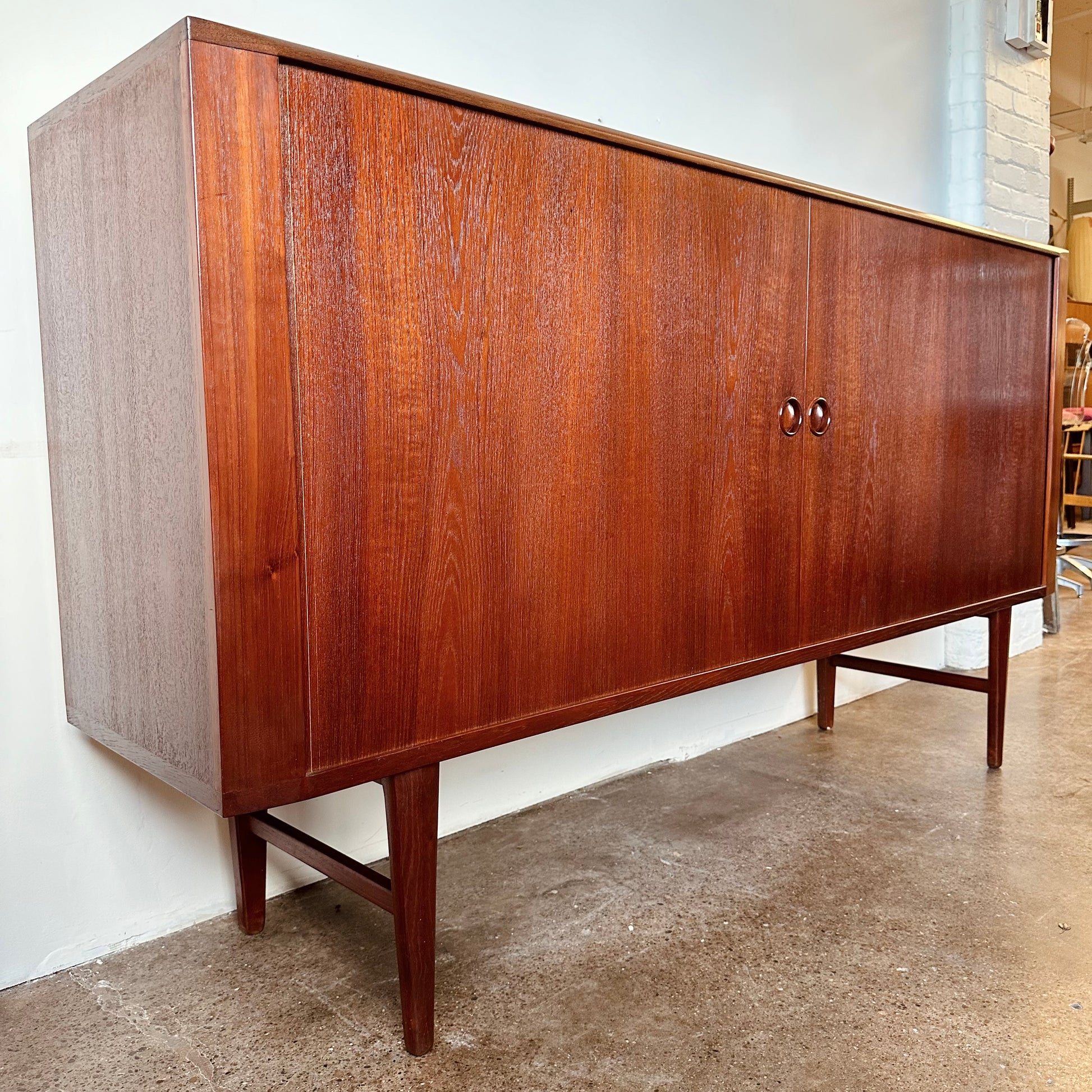 A rare and extremely elegant yet spacious sideboard that epitomizes Danish craftsmanship of the mid-20th century. Features solid teak legs and stretcher below, remarkably large tambour gliding doors in a deep reddish tone characteristic of old growth teak and from the old mounting screws. This piece is considered a “highboard” because it is just like a sideboard server (credenza) but sits much taller than the standard 28-30”. The tambour doors also make for easy access without any swinging doors to contend with. Use this showstopper for dining or living room storage and would also make for a fabulous bar piece! 🍸