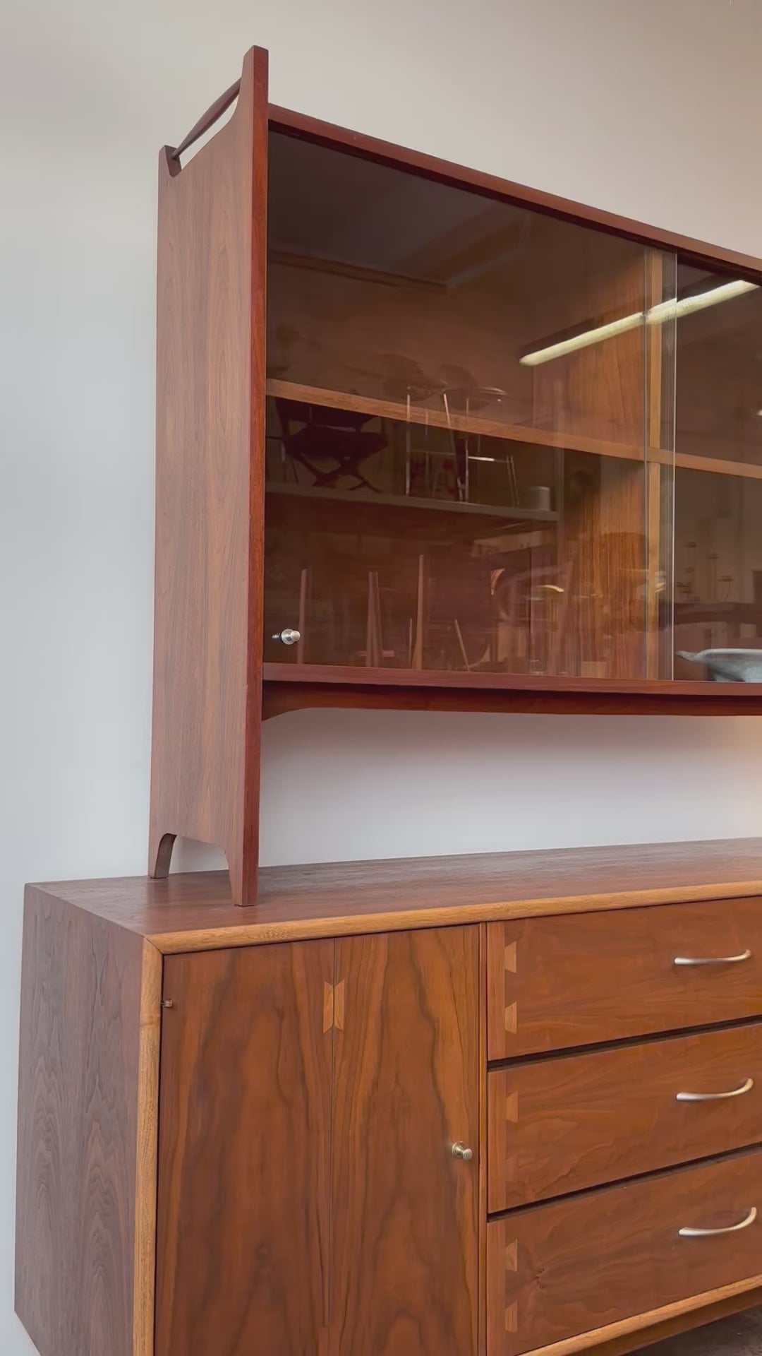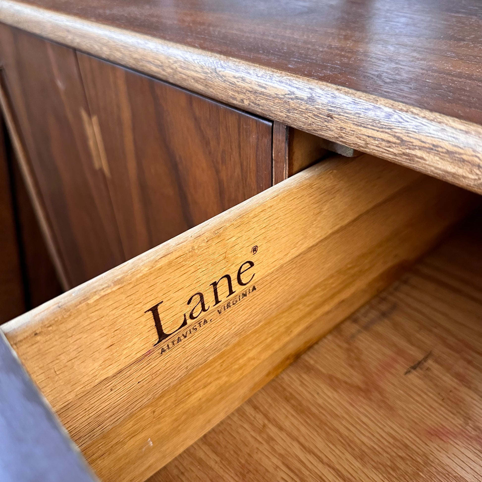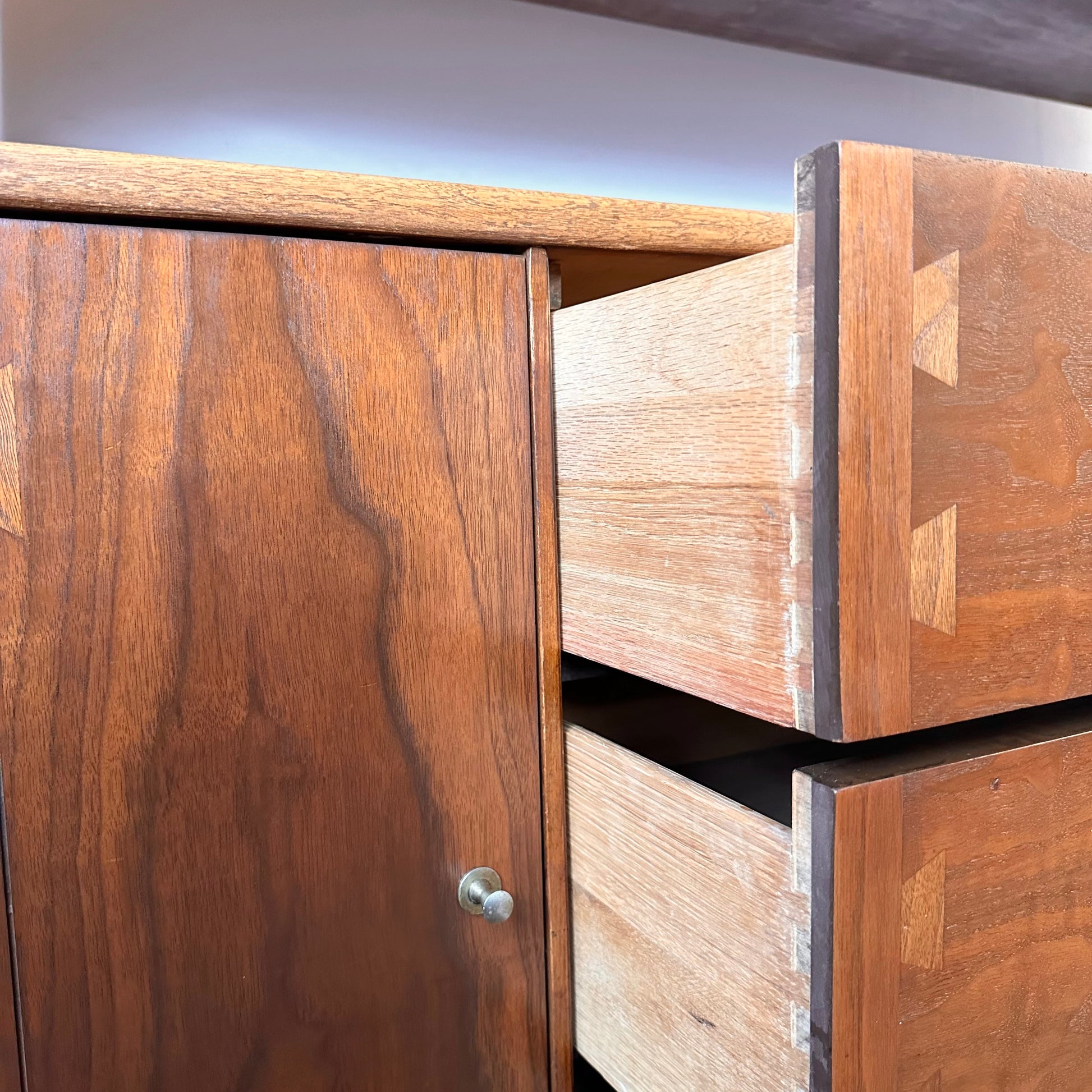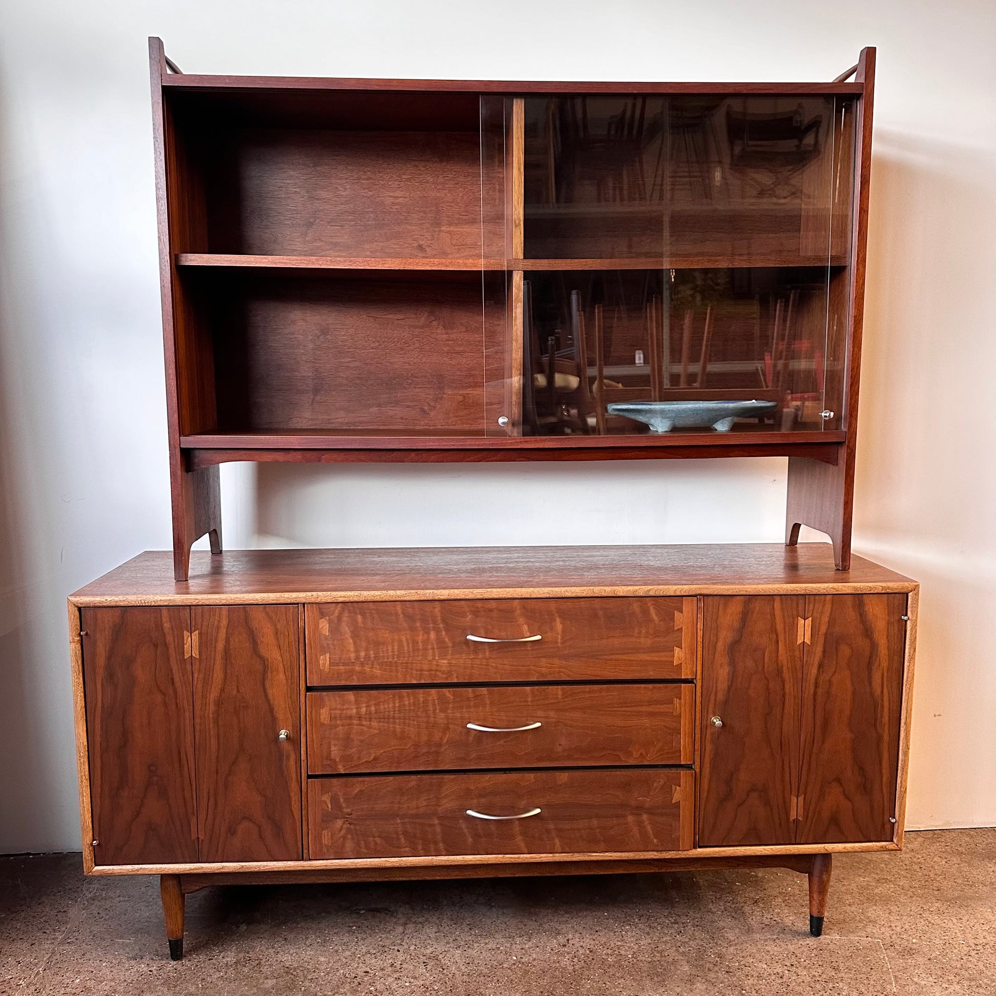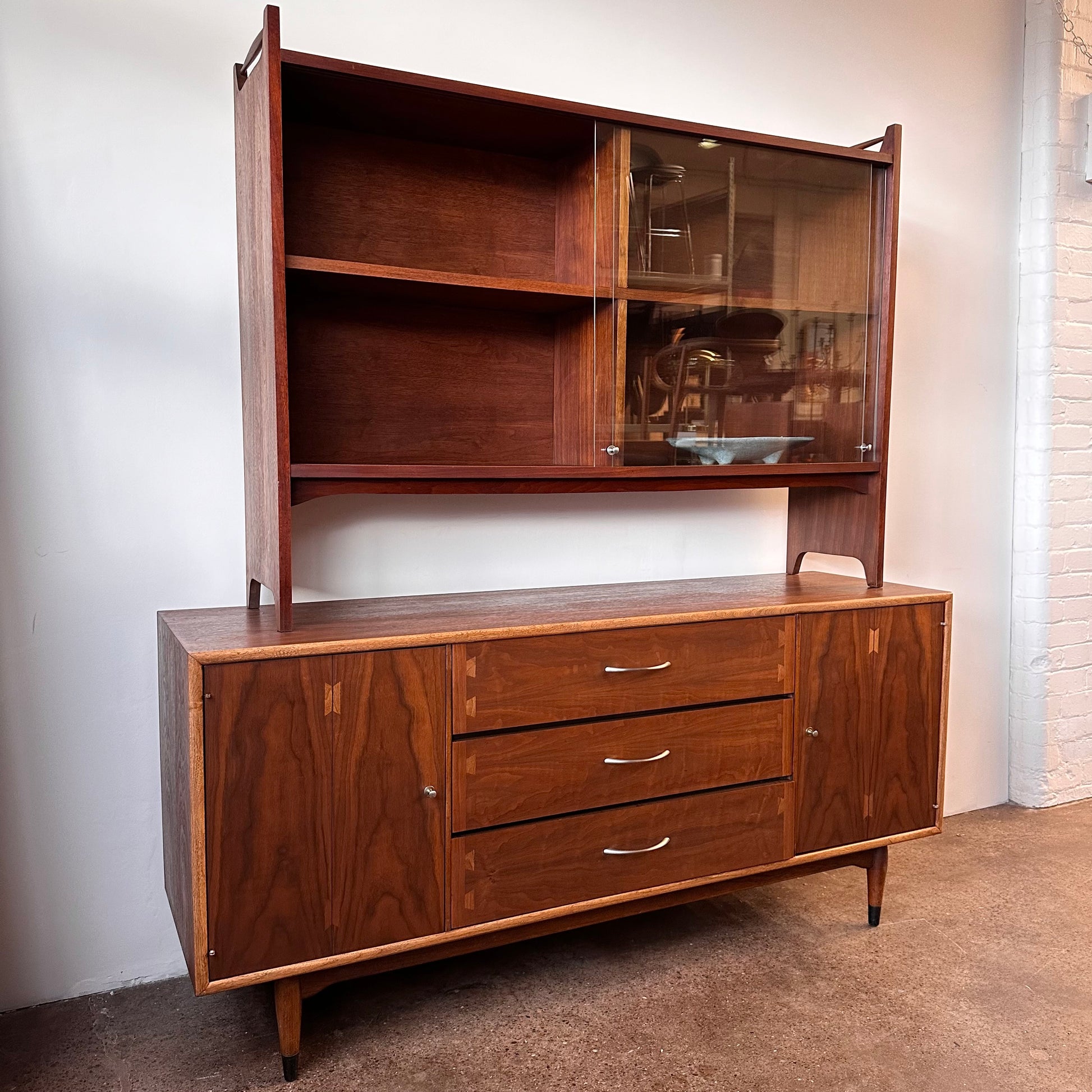 A rarely seen Lane Acclaim two-piece china cabinet / hutch. This is the largest of sideboards available in the 1960s Lane Acclaim collection designed by Andre Bus. Like all the Acclaim pieces, this piece features oak solid framing with walnut and oak veneers and the oversized dovetail detail. The bottom sideboard has three drawers with dovetailed joints flanked by doors that open to storage with a half shelf inside. The doors feature a bowtie inlay in oak.