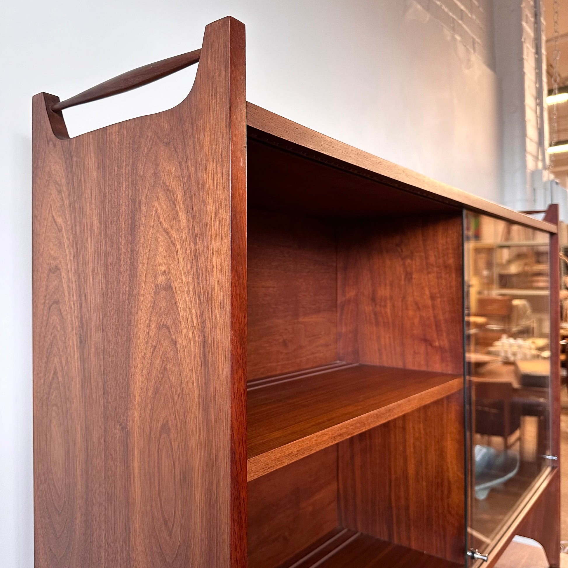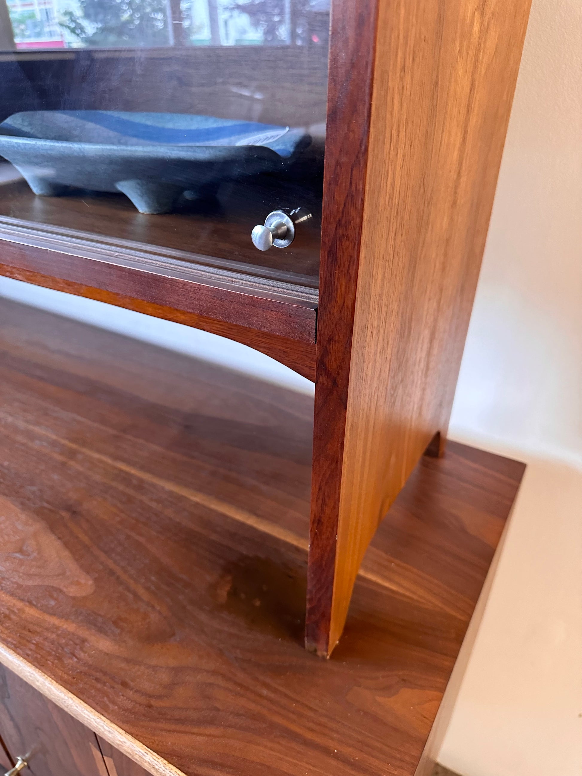 The top piece is a very simple design much more shallow than the bottom so as not to tower and encroach on a space, and rests on side panels allowing for ample serving space on the top of the sideboard. It is a divided shelf unit with the original sliding bypass glass doors. The shelves are permanently planted. The piece sits on four tapered round legs with quintessential Lane Acclaim ebonized black tips.