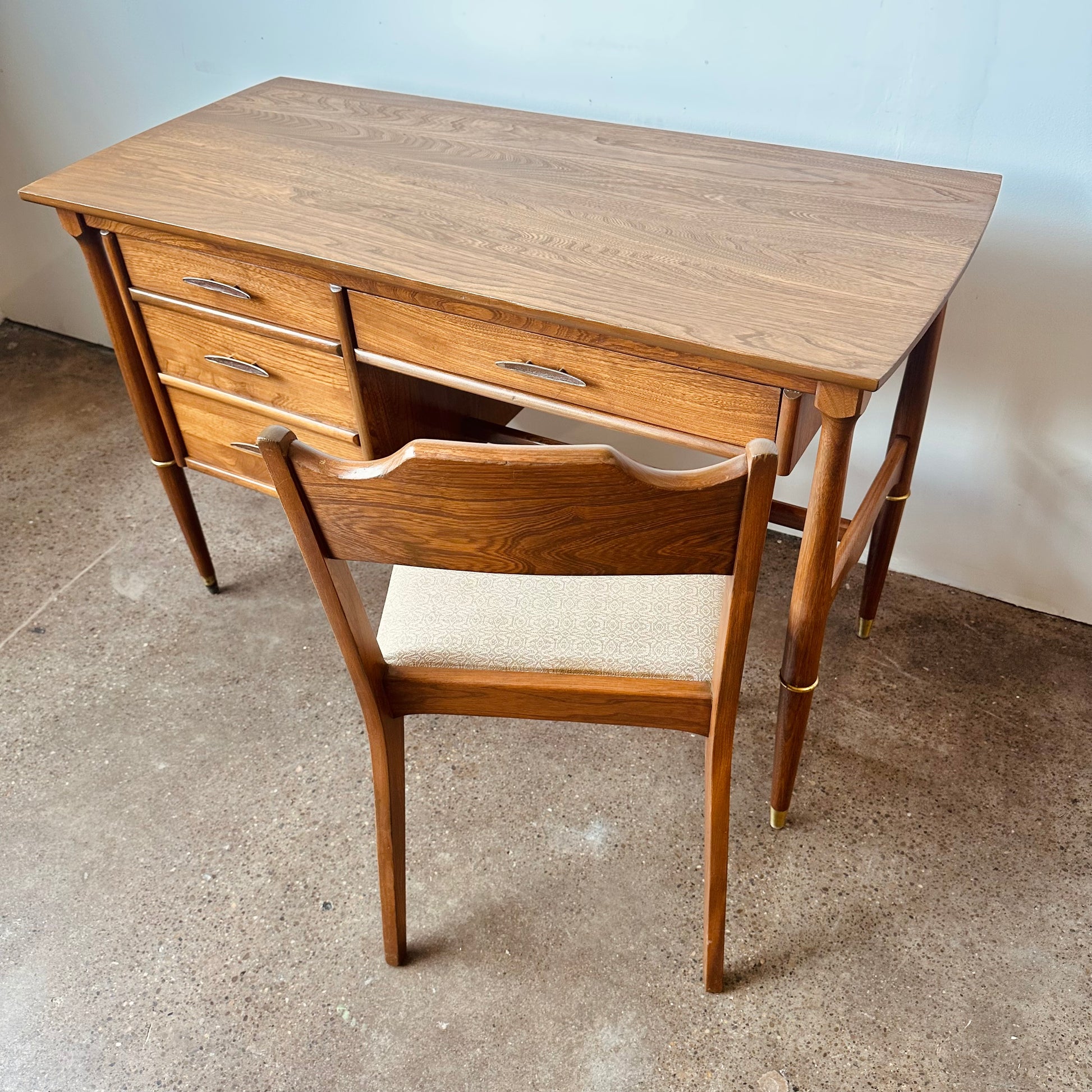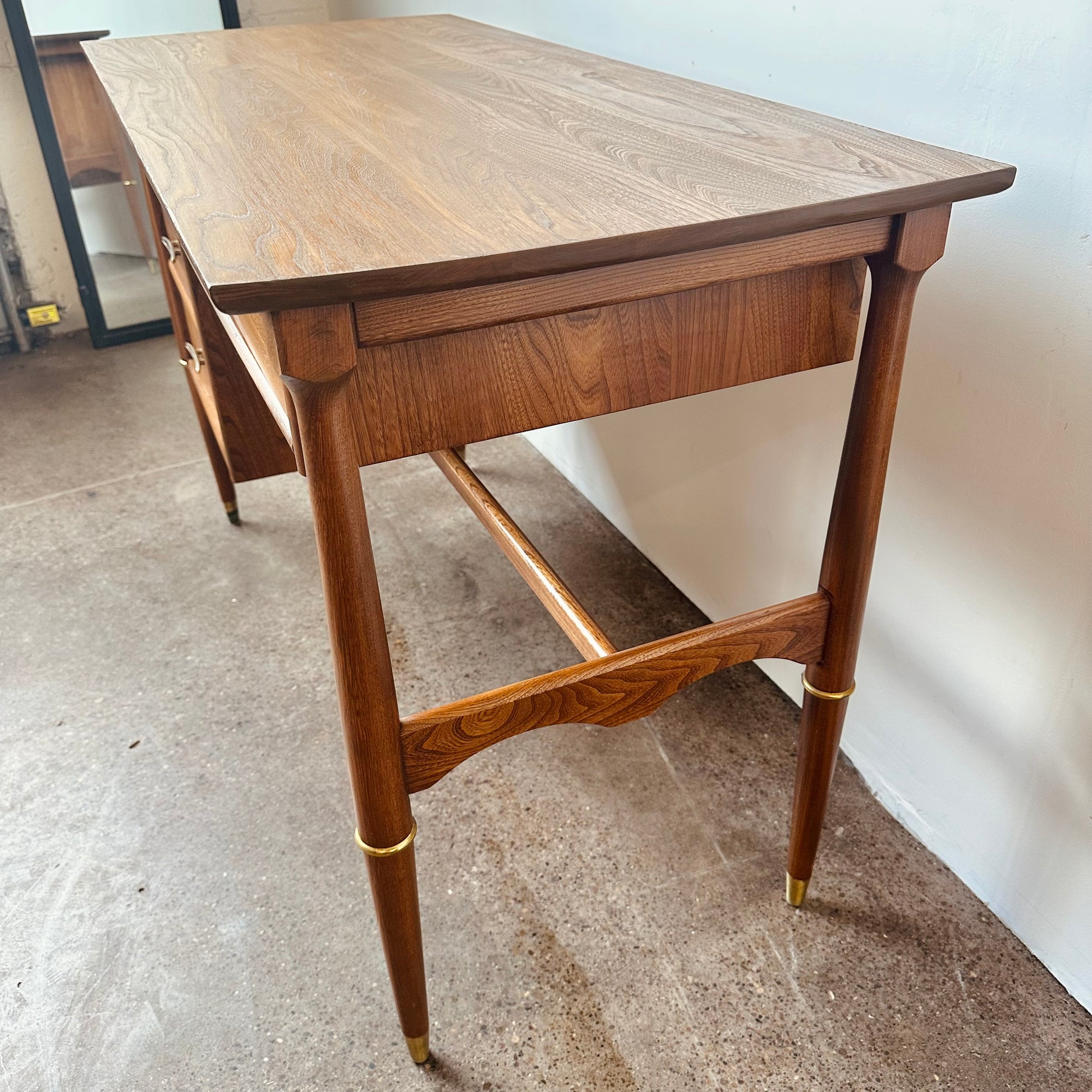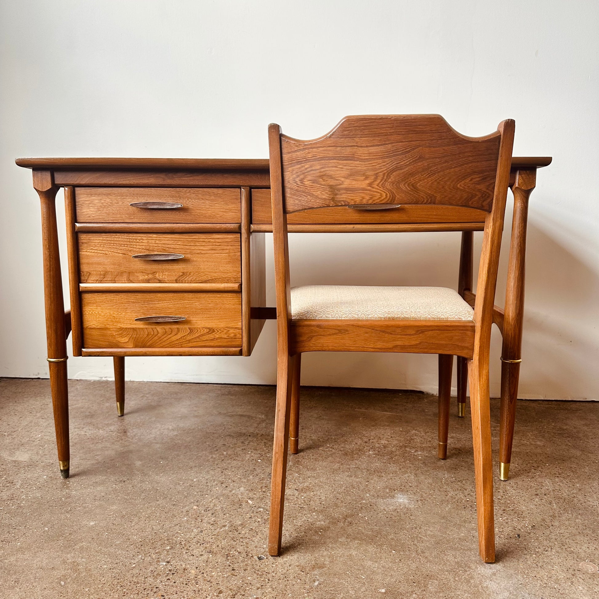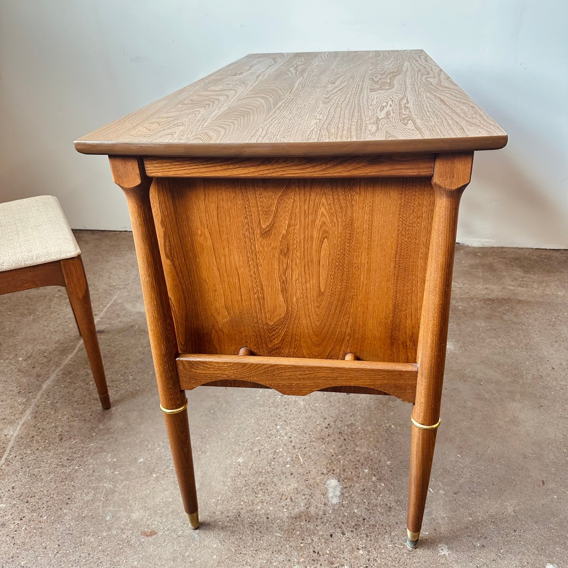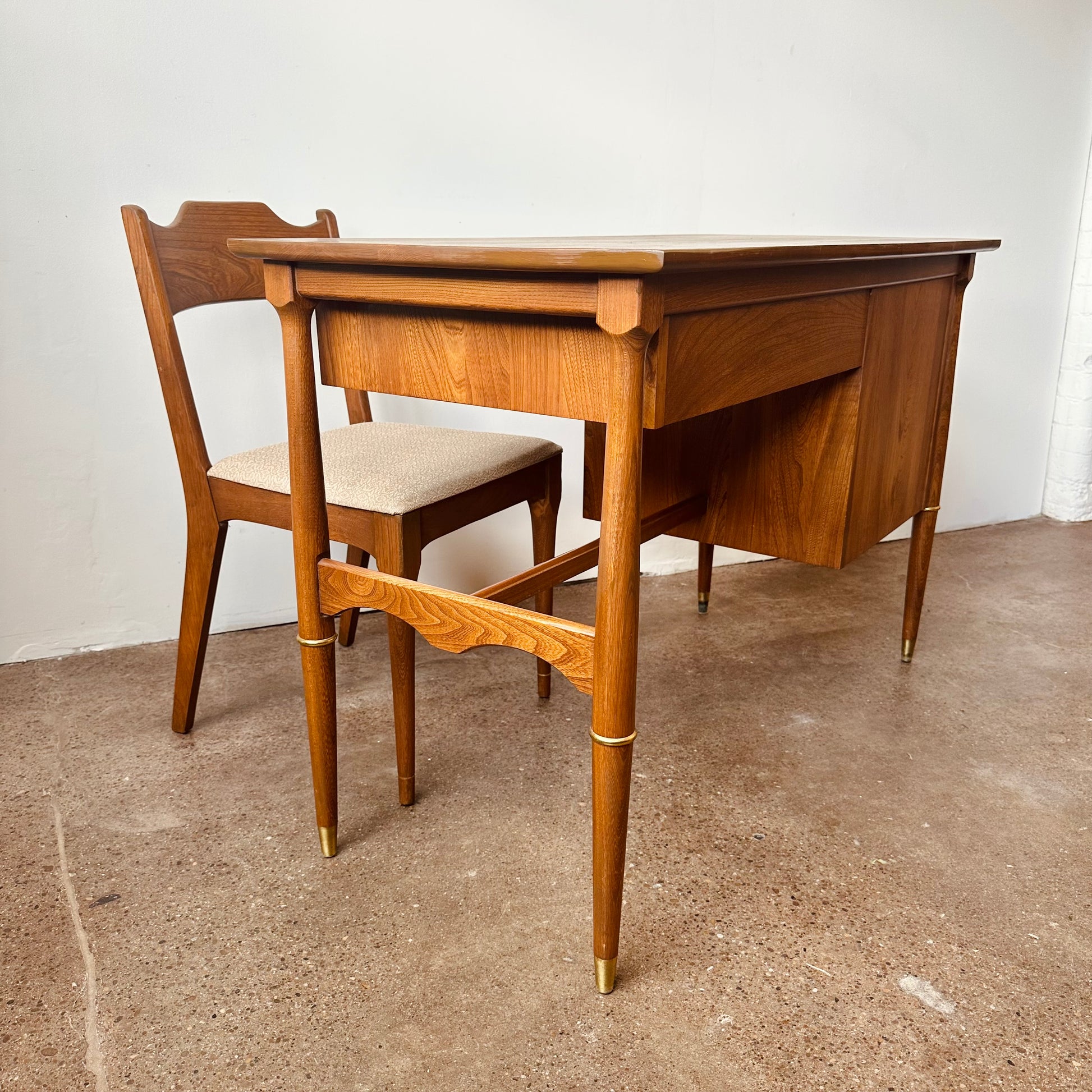 Restored mid-century walnut writing desk with finished backside and matching chair. Features two pencil drawers and a larger file drawer, brass accents, and solid sculptural wood legs in a honey walnut finish. Coordinating desk chair included.