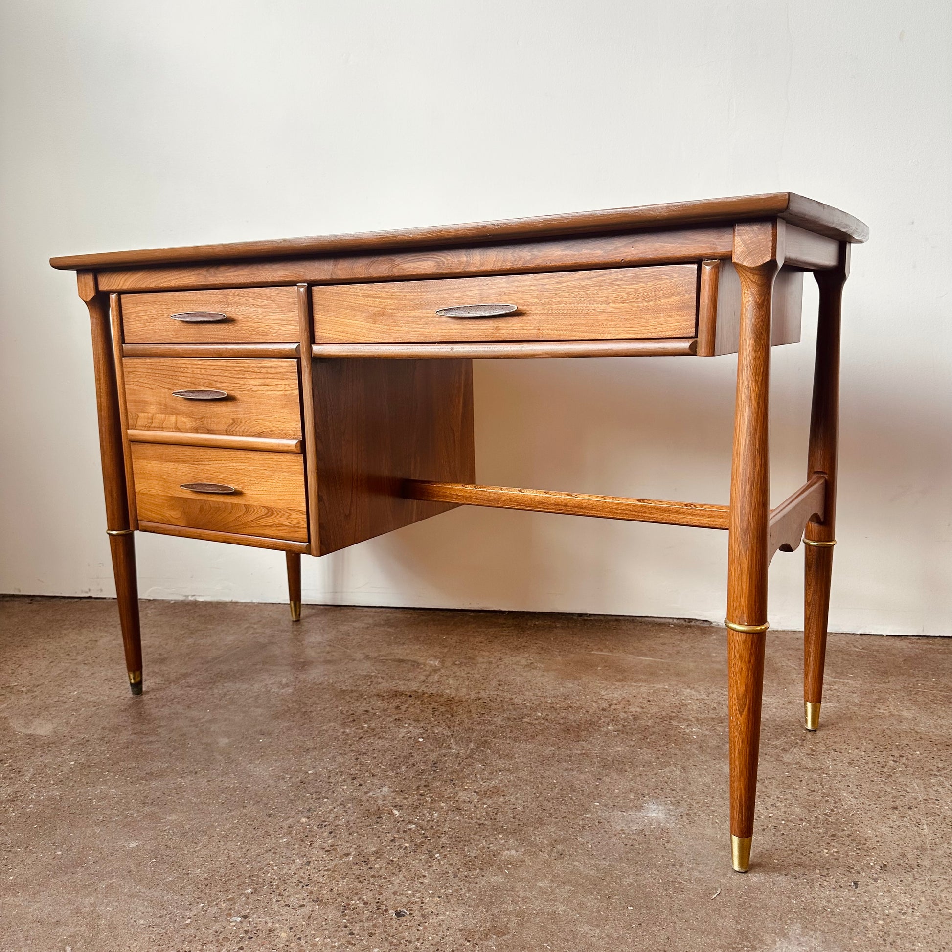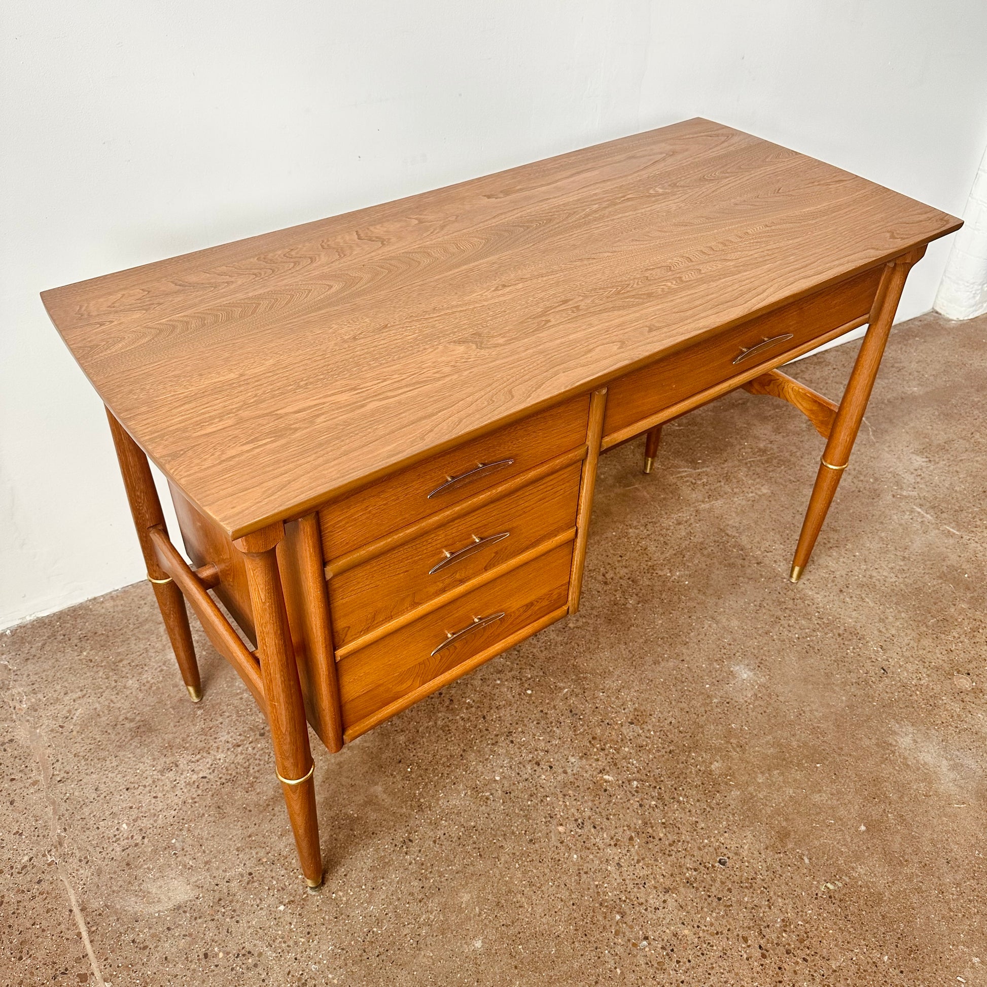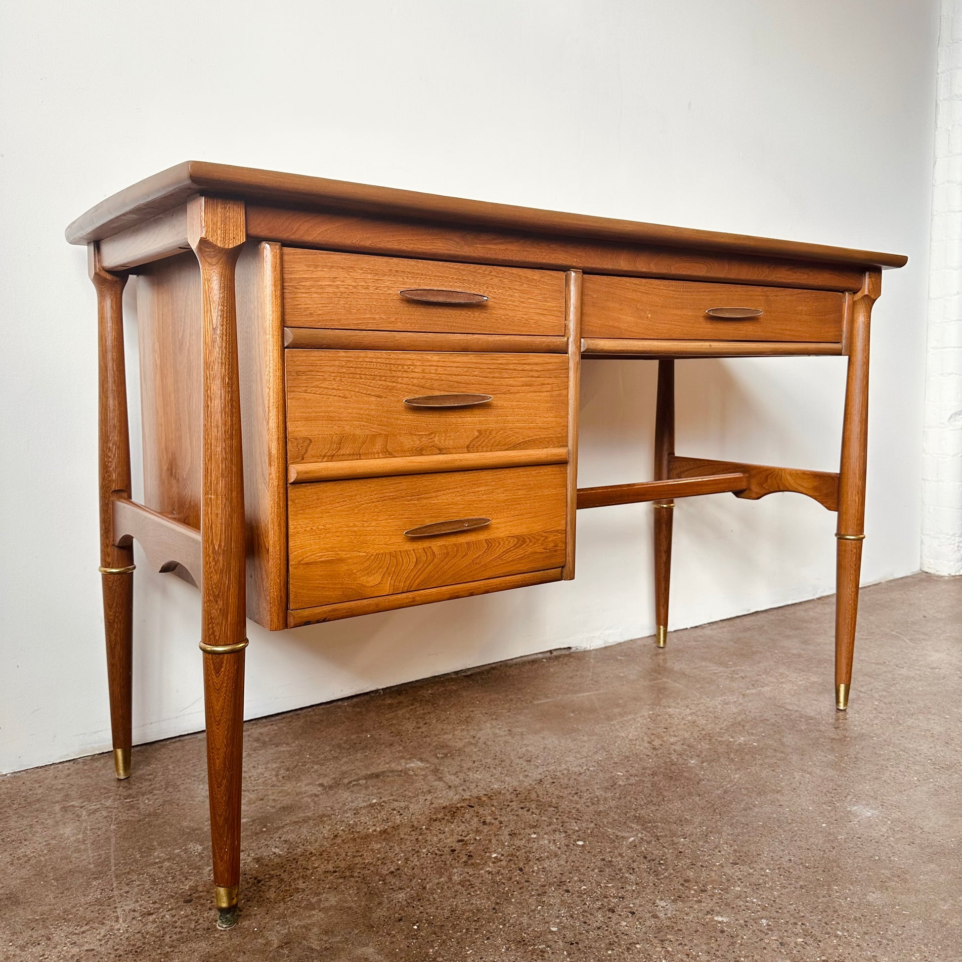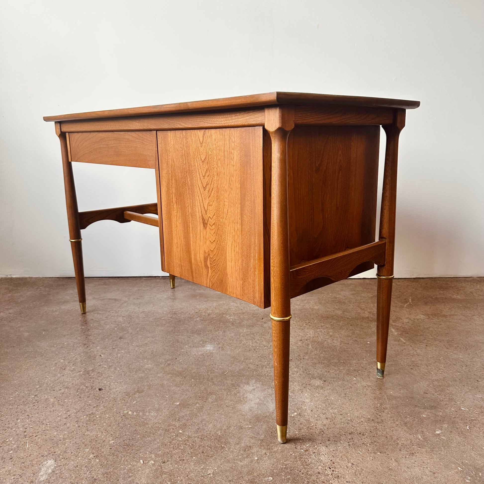 Restored mid-century walnut writing desk with finished backside and matching chair. Features two pencil drawers and a larger file drawer, brass accents, and solid sculptural wood legs in a honey walnut finish. Coordinating desk chair included.