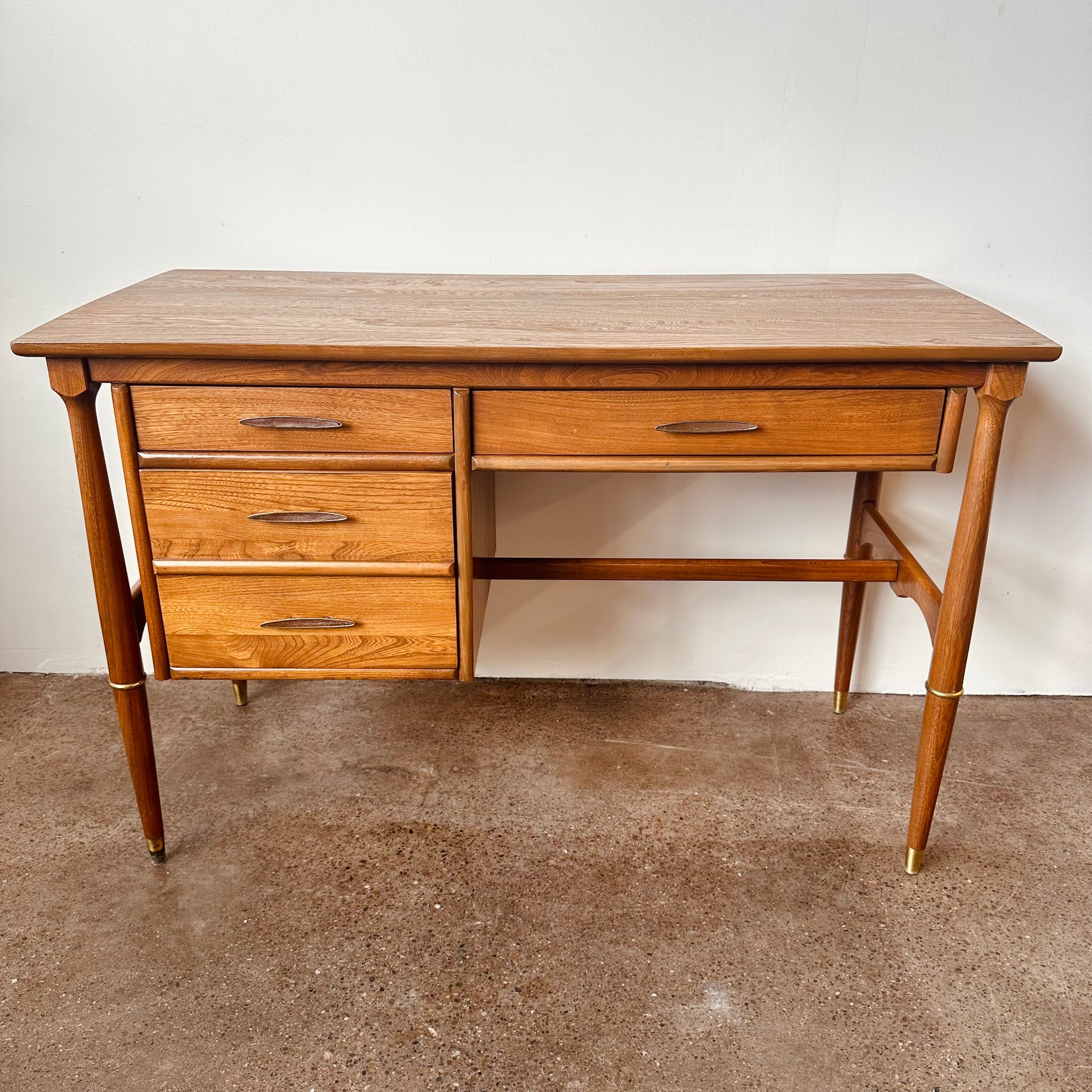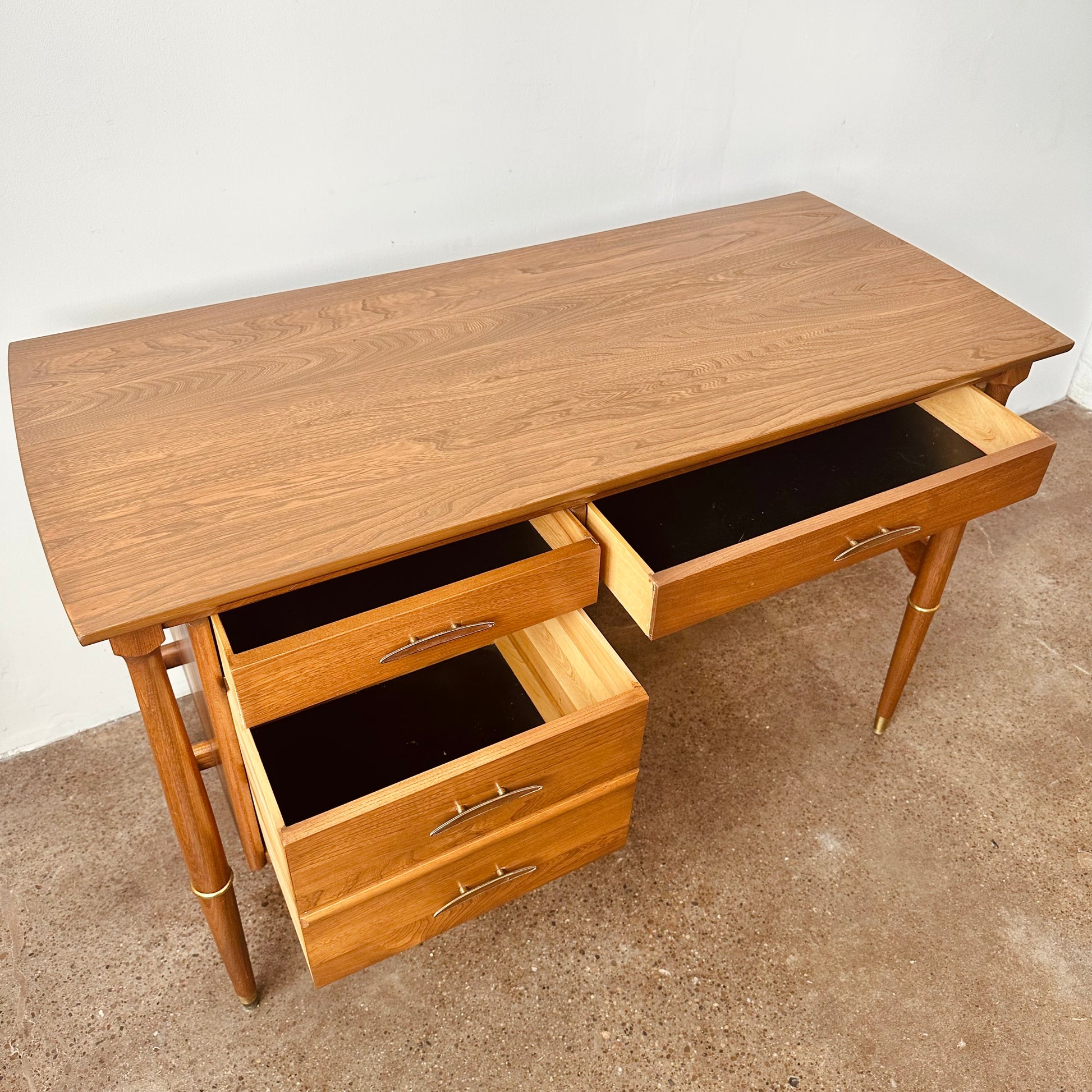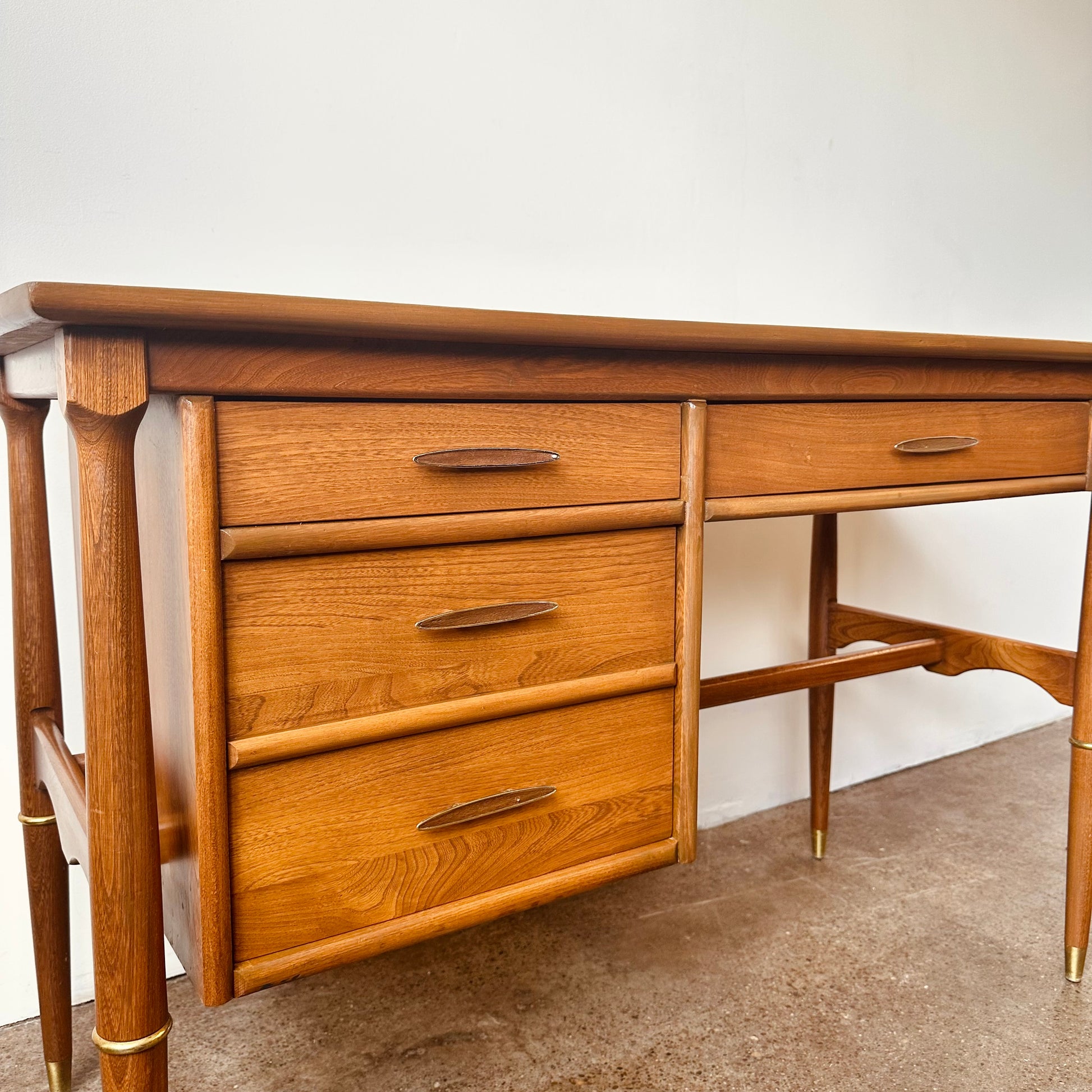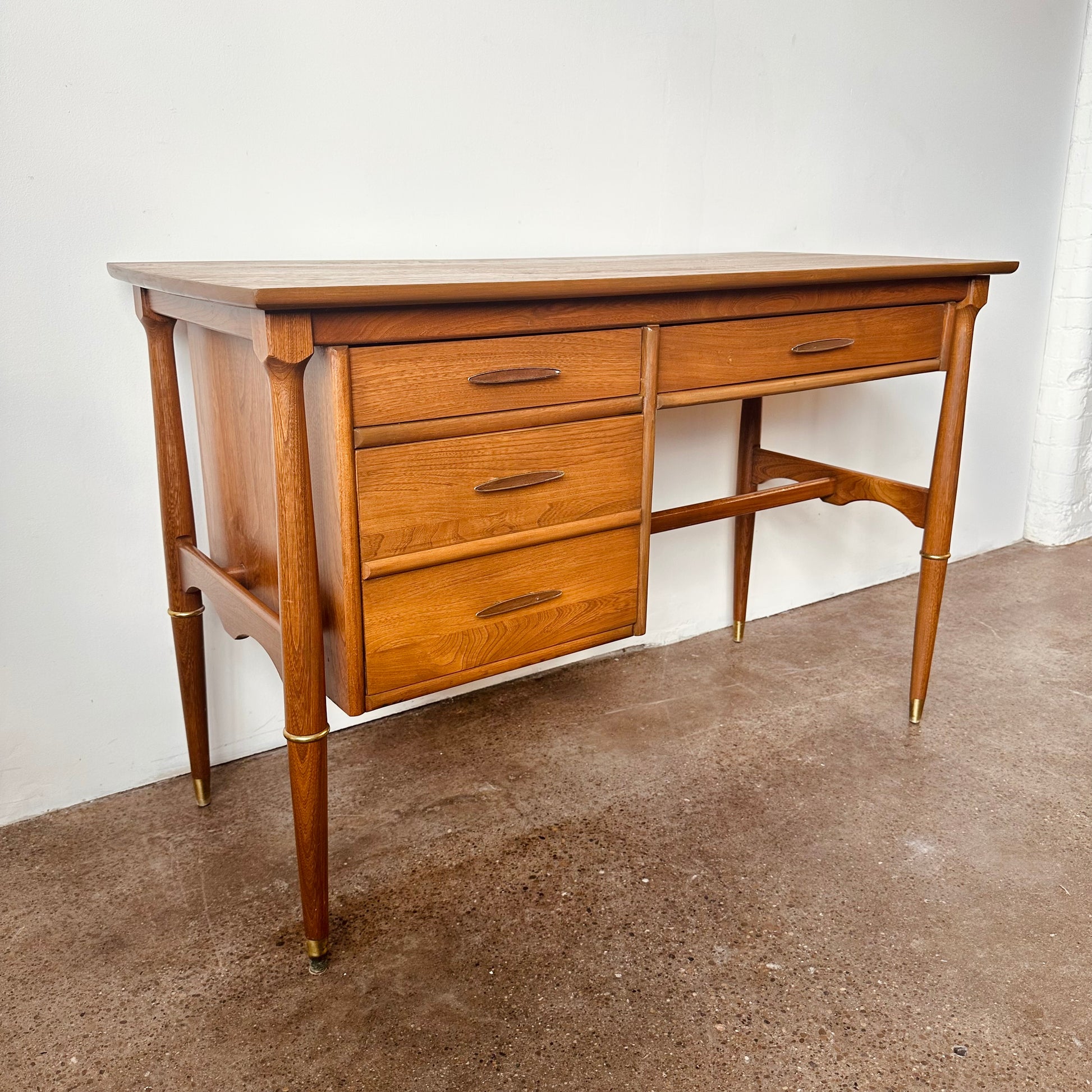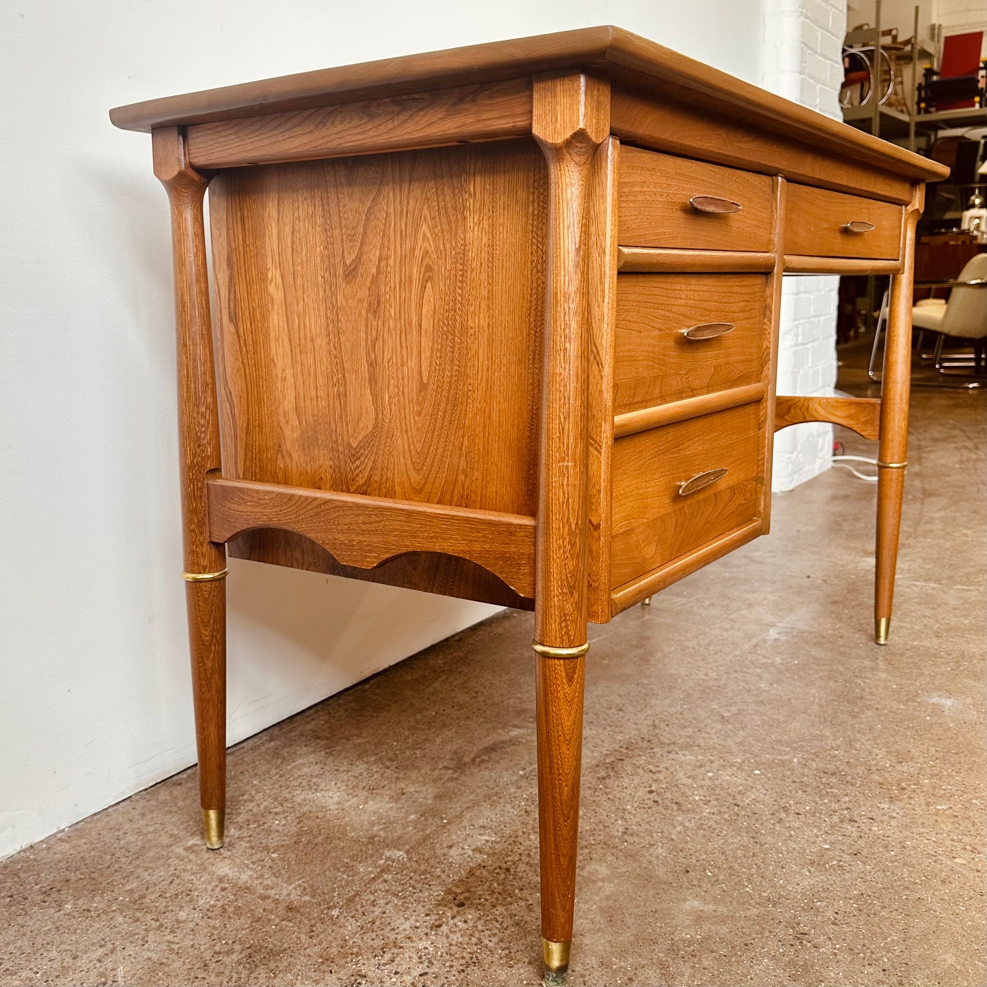Restored mid-century walnut writing desk with finished backside and matching chair. Features two pencil drawers and a larger file drawer, brass accents, and solid sculptural wood legs in a honey walnut finish. Coordinating desk chair included.