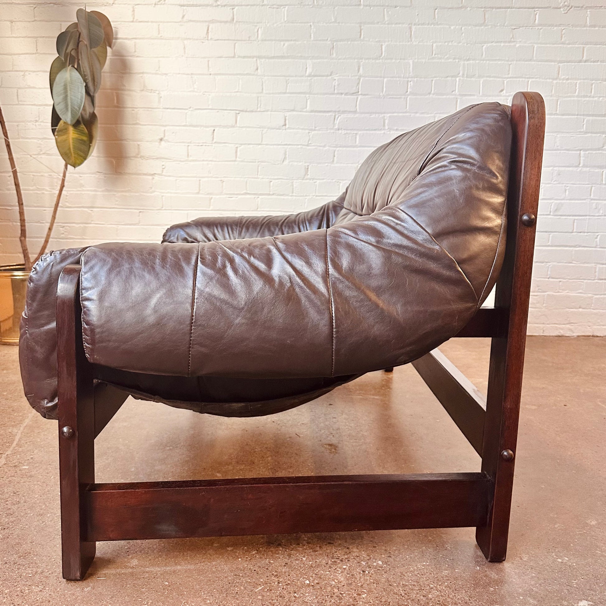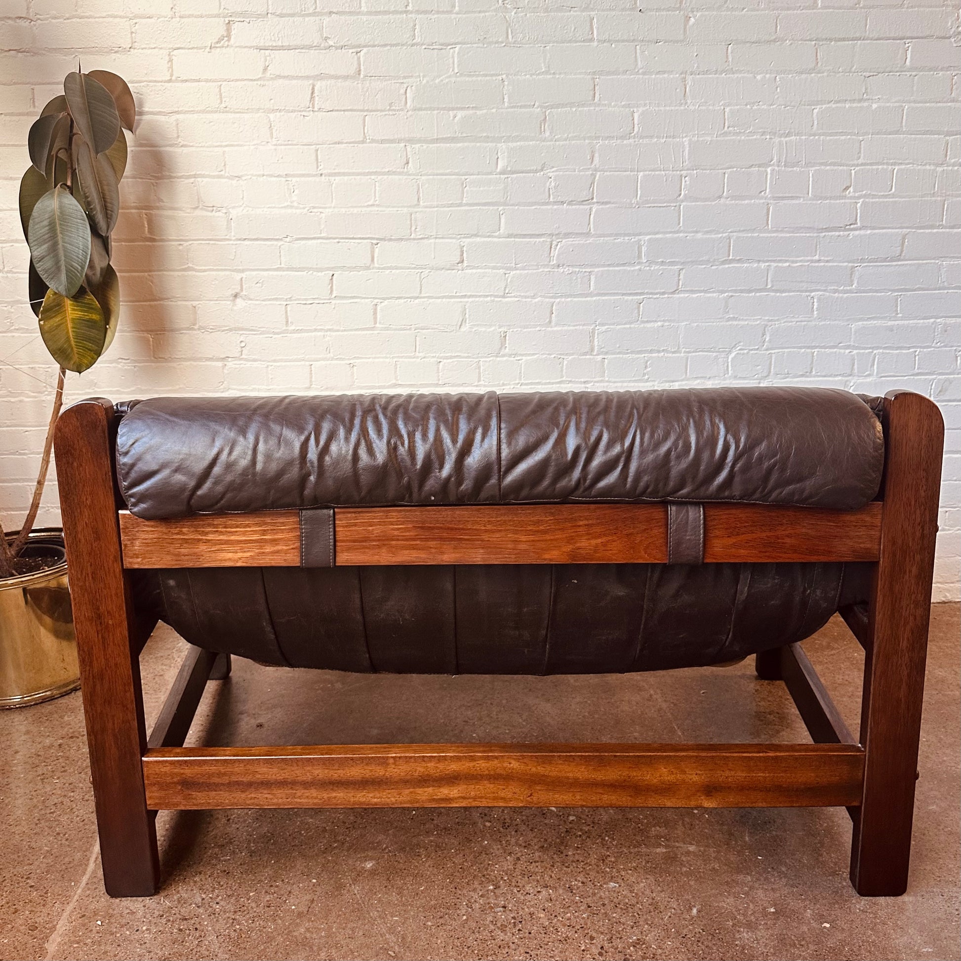 Vintage chocolate brown leather loveseat with solid Brazilian rosewood frame circa 1960s. Made in Sao Paolo. Seating for two with deep, plush bucket seat. The leather seating is held by a canvas sling and wrapped around the arms and backside of the sofa with 2 back straps for extra support, and easily removable.