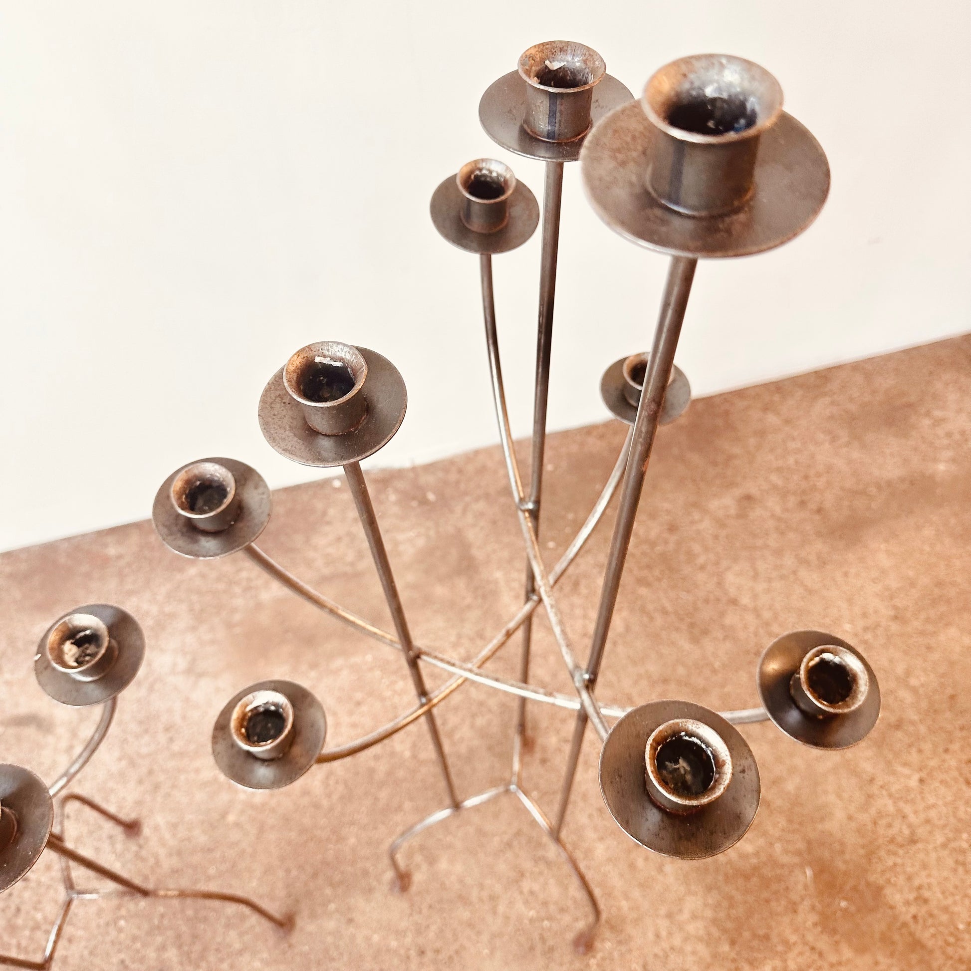 Set of two vintage steel or metal floor candelabras or candle holders. Brutalist meets post modernism French design. Each allows for 8 regular size candles. Sold as a pair.