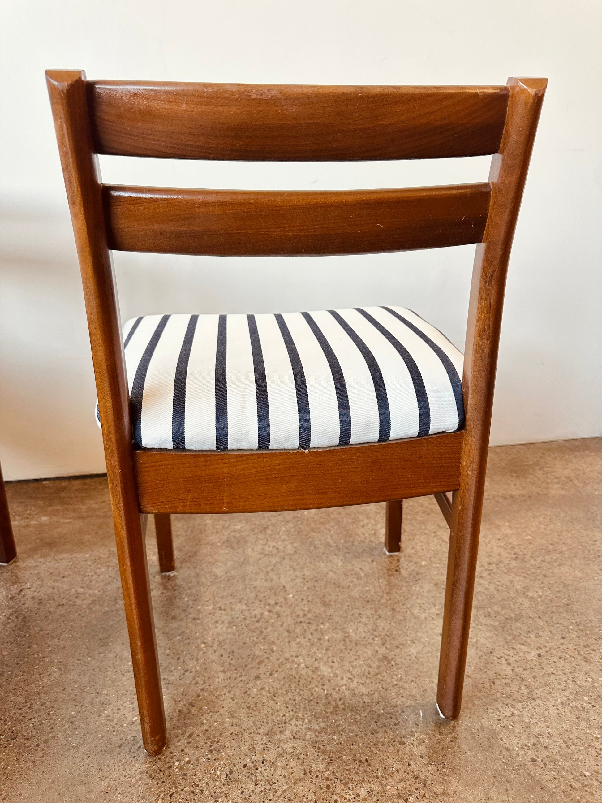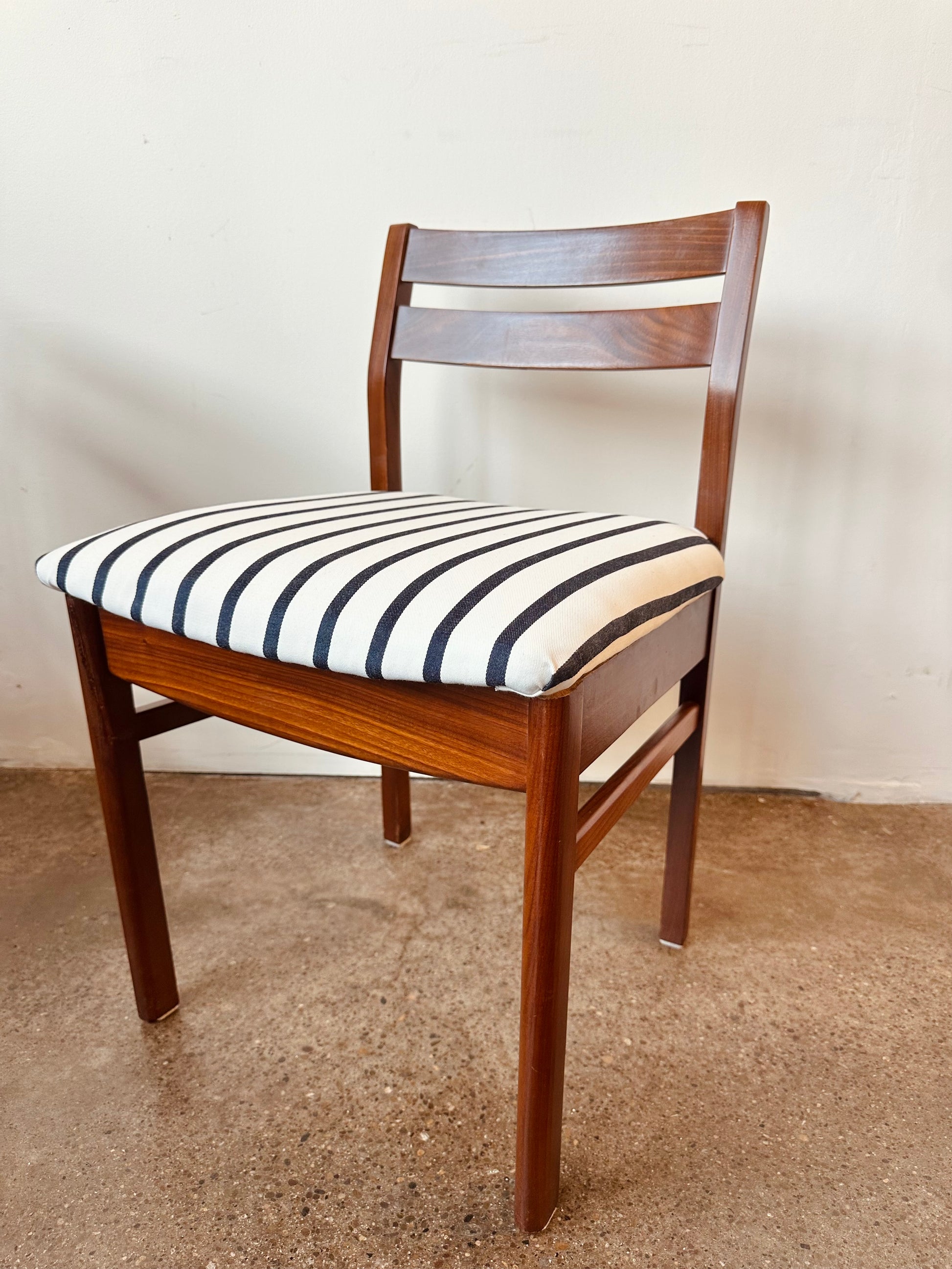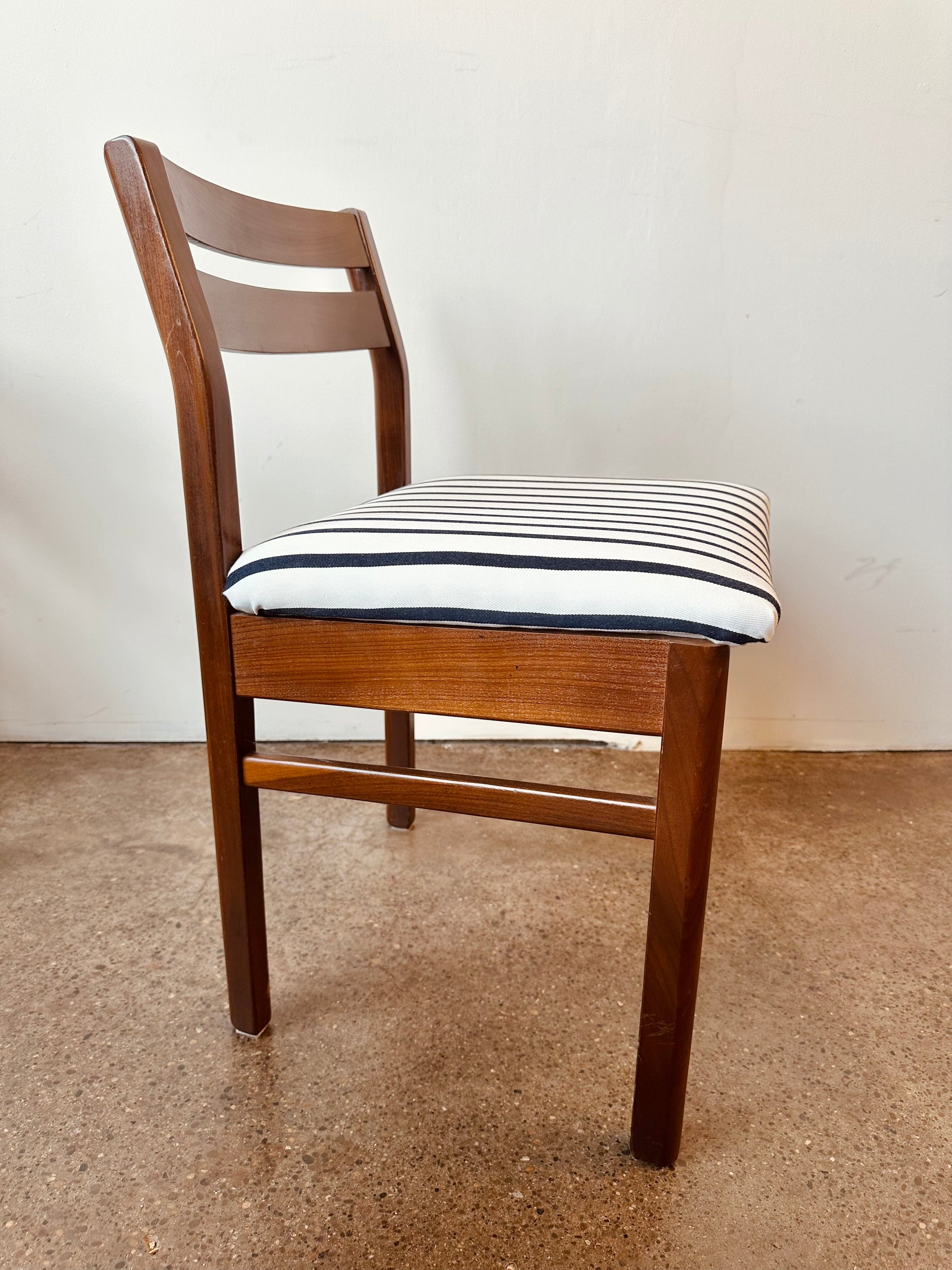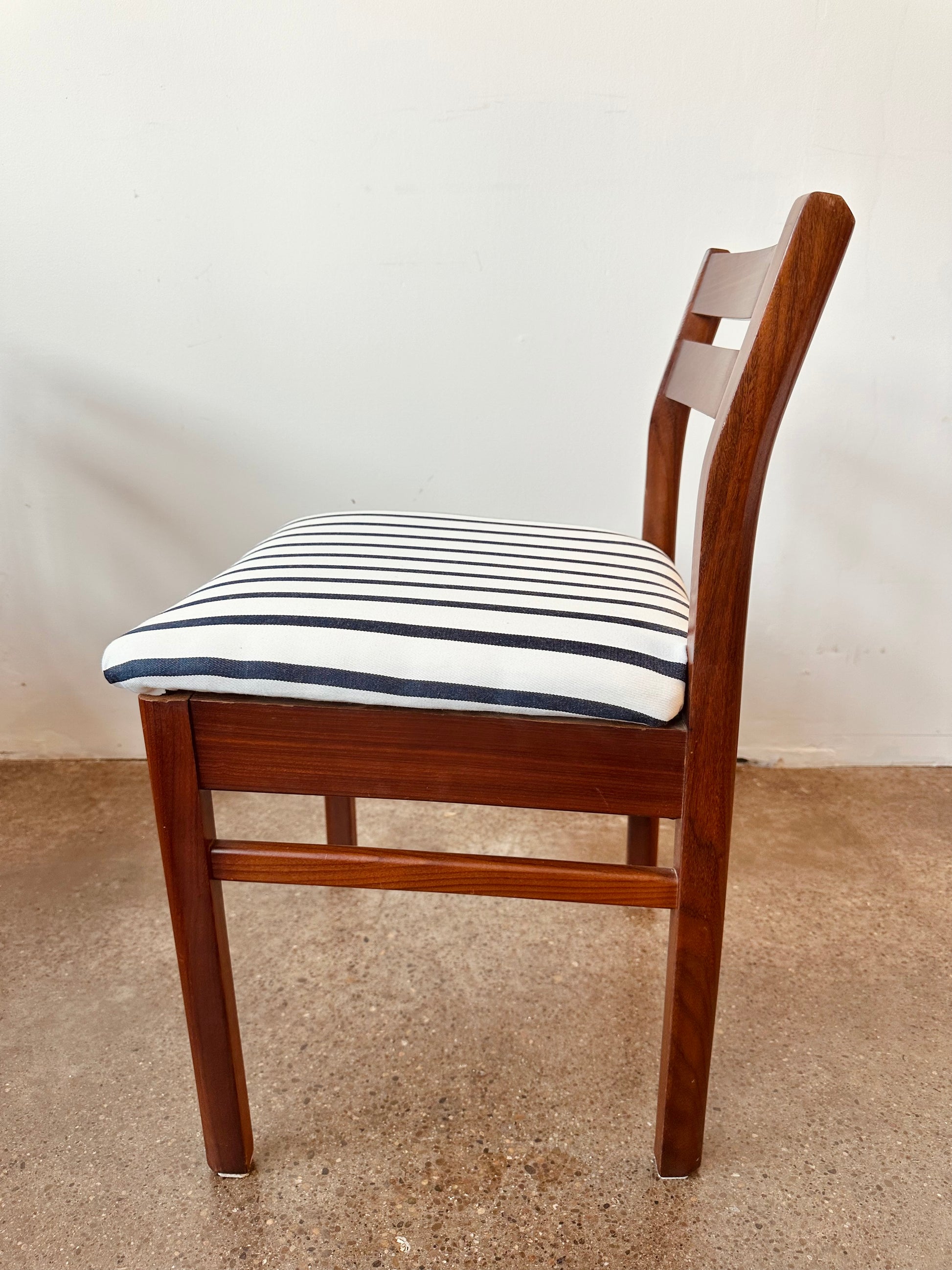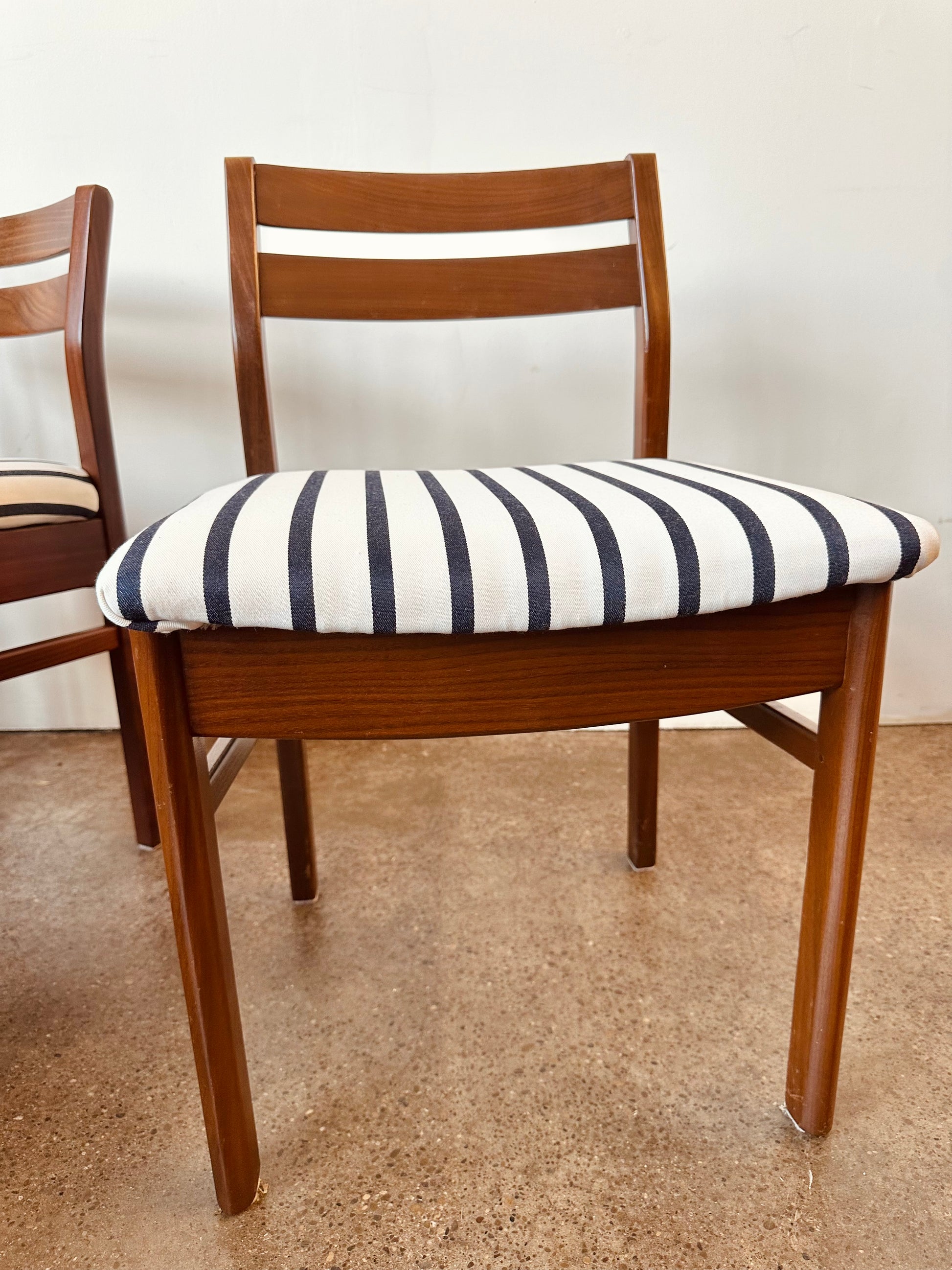 Vintage 1960s teak low back dining chairs with nautical blue and white stripe upholstery, designed by Philip Hussey for Newton and White of England.