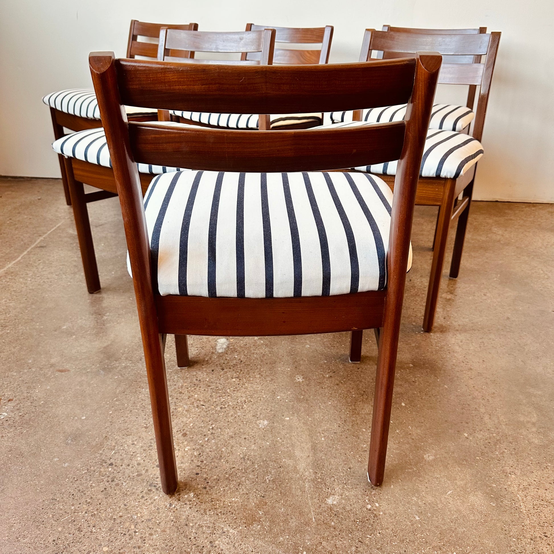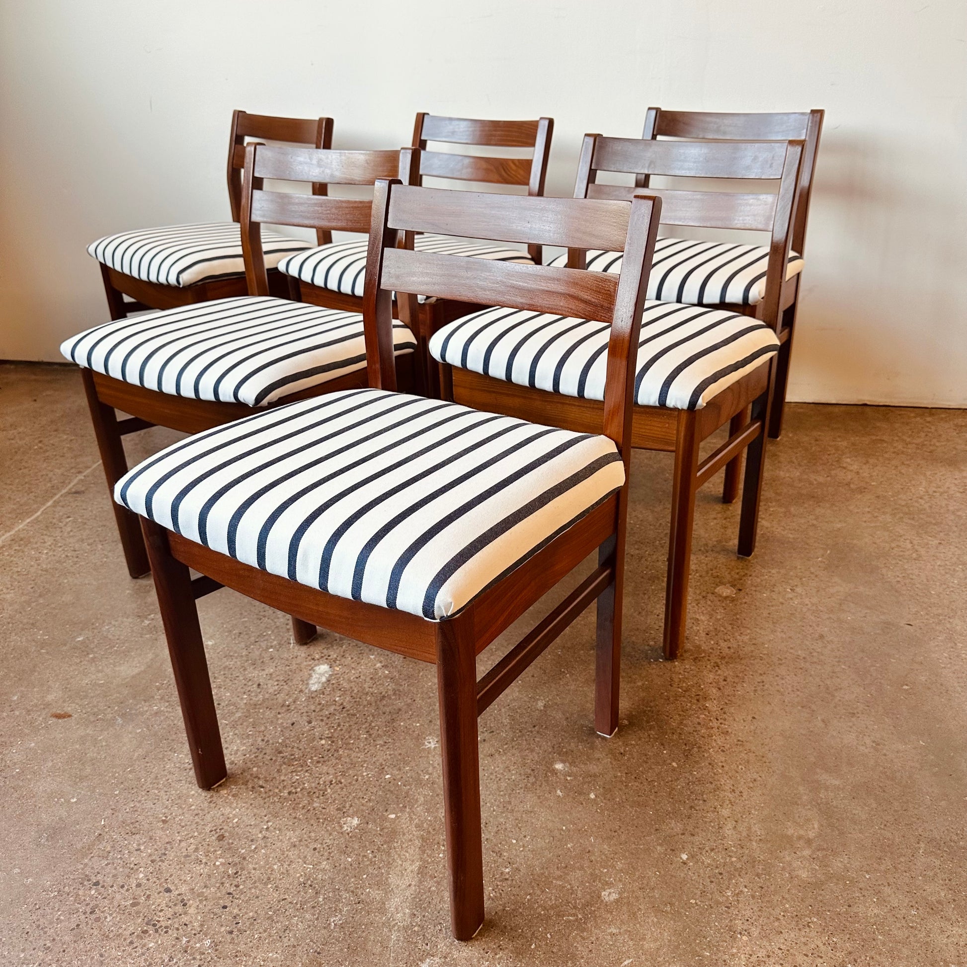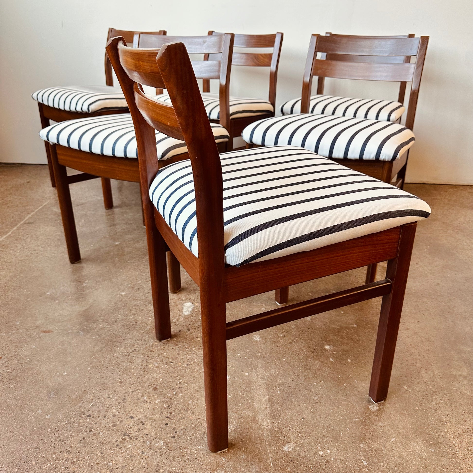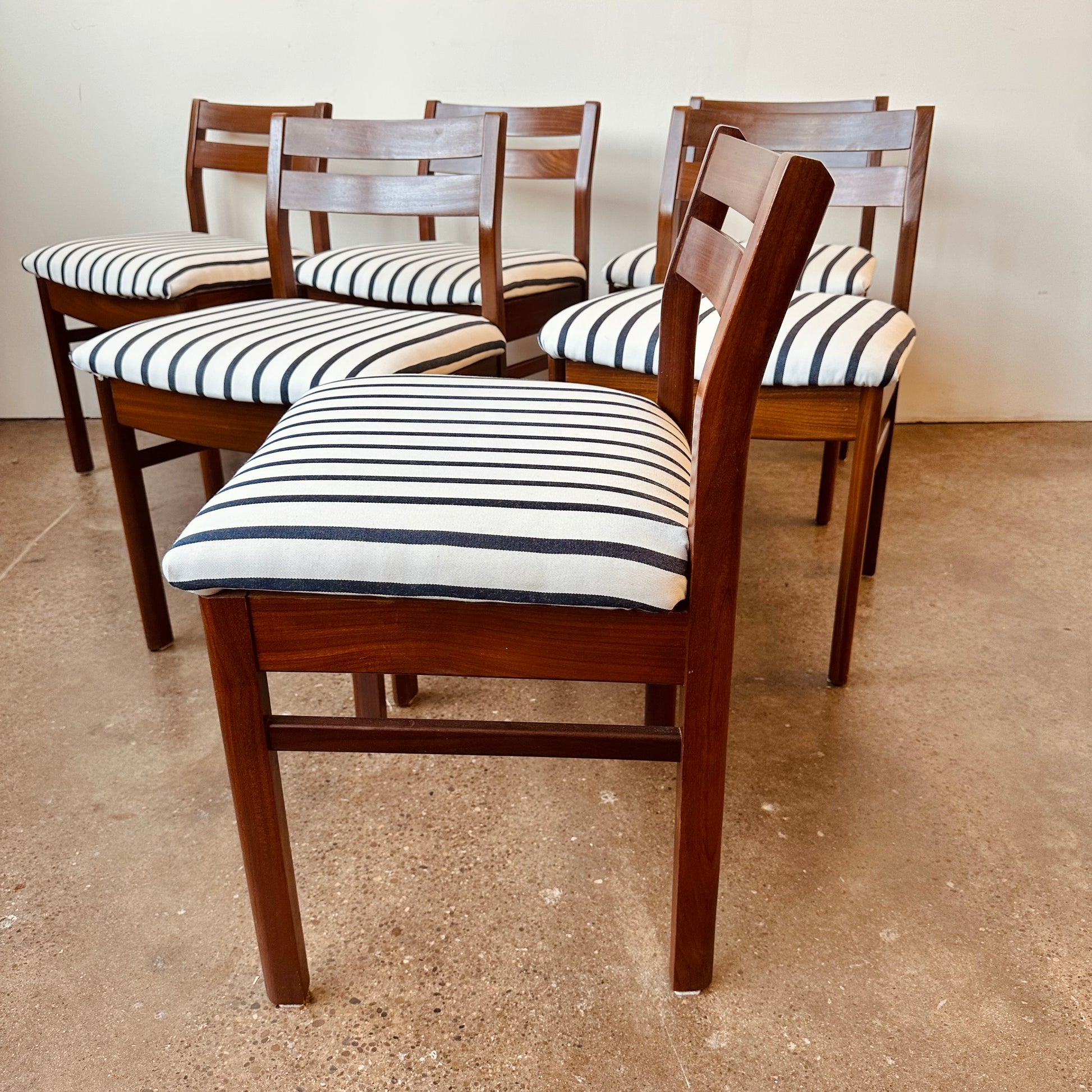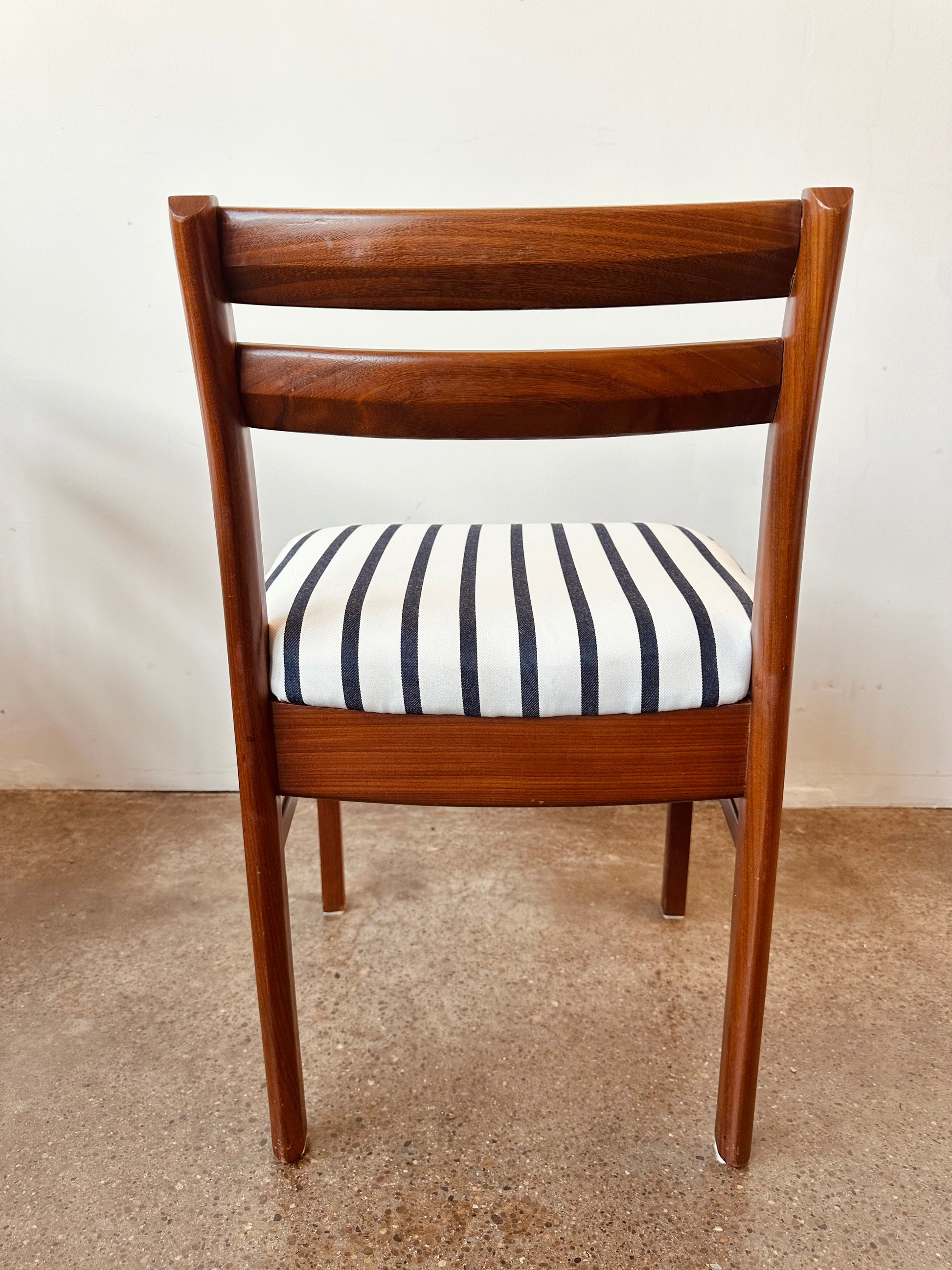 Vintage 1960s teak low back dining chairs with nautical blue and white stripe upholstery, designed by Philip Hussey for Newton and White of England.