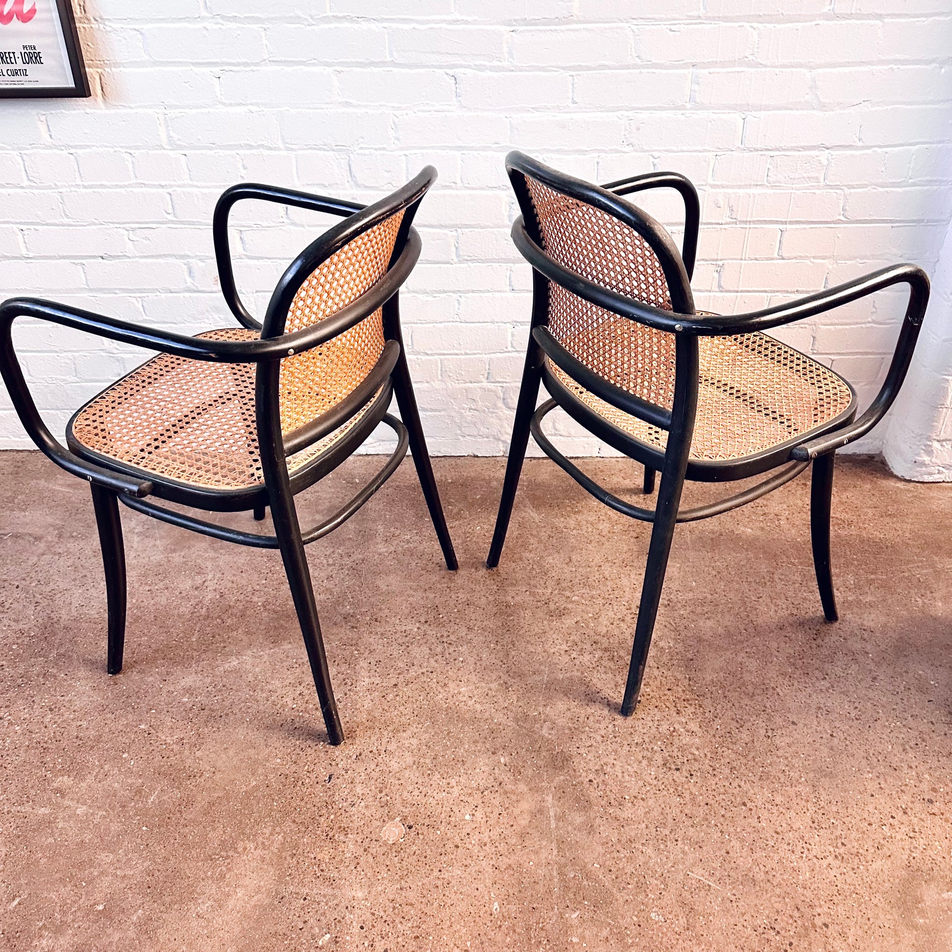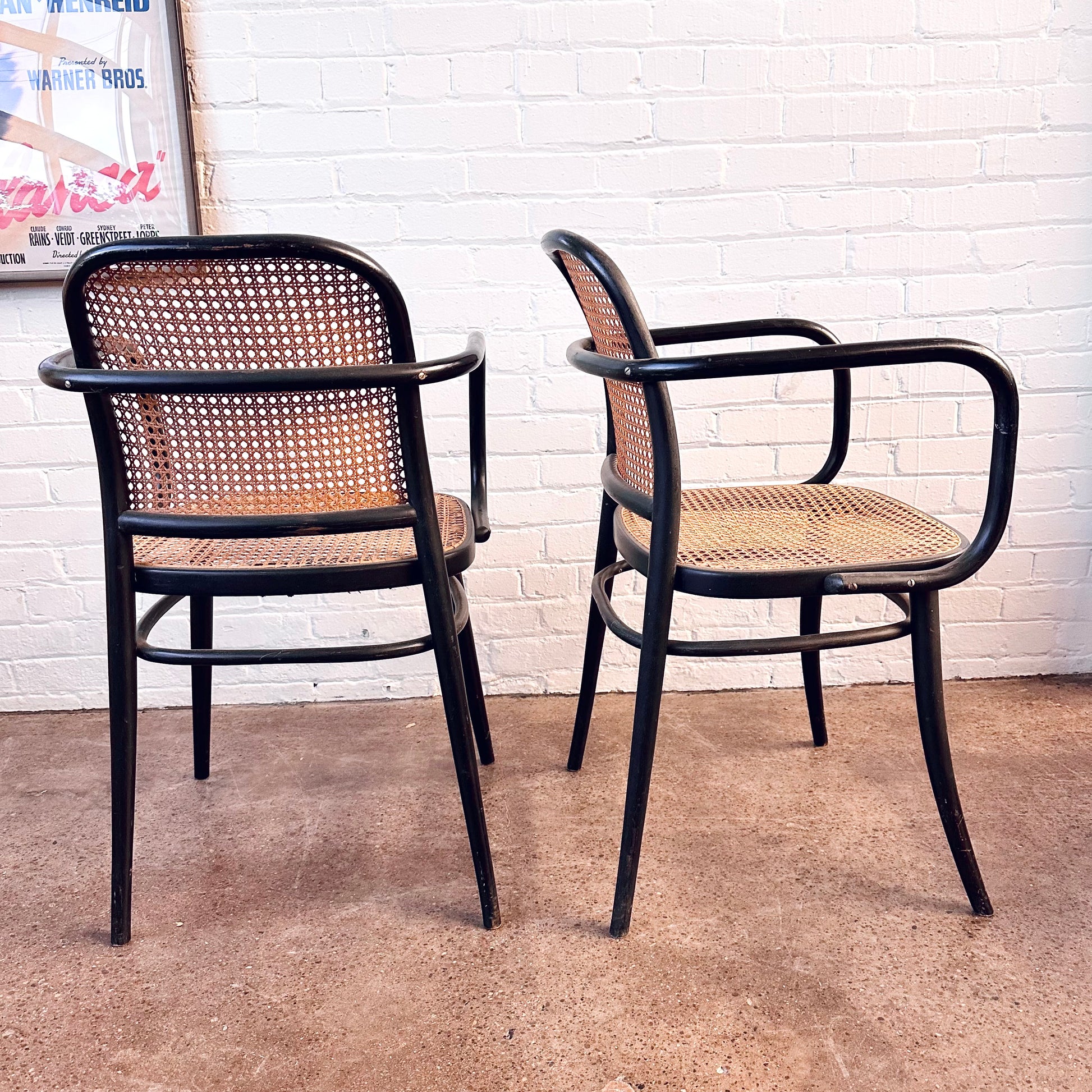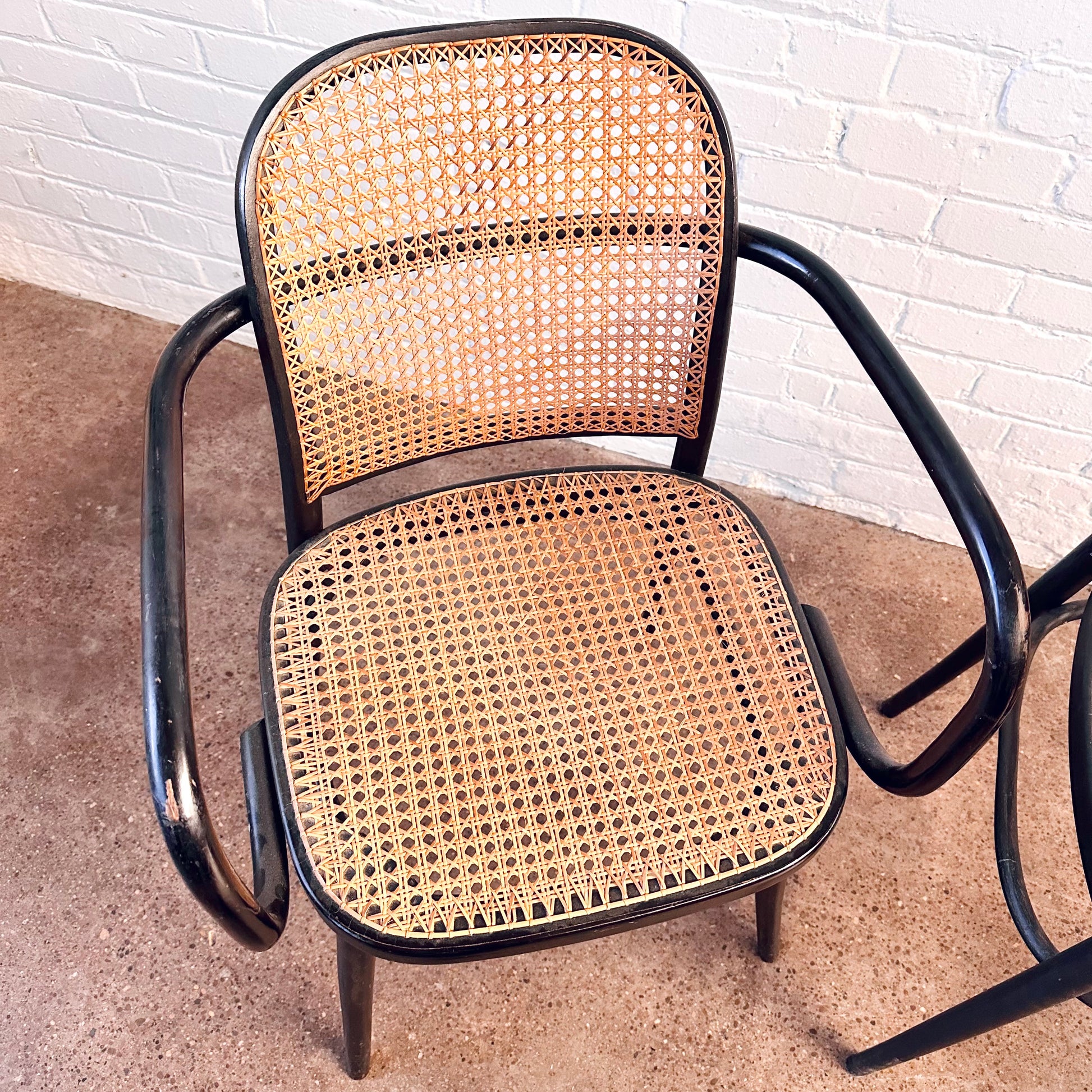 Josef Hoffman black bentwood and cane arm chairs, designed for Thonet. This pair of model No.811 chairs is attributed to the Austrian architects Josef Hoffman and Josef Frank. Marked made in Czechoslovakia circa 1960s.