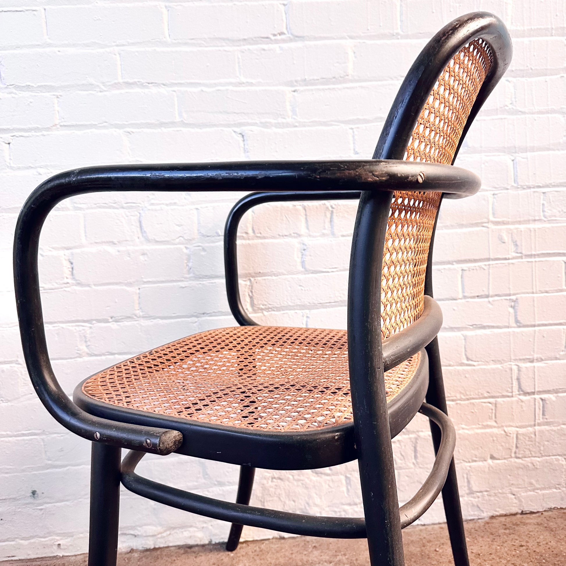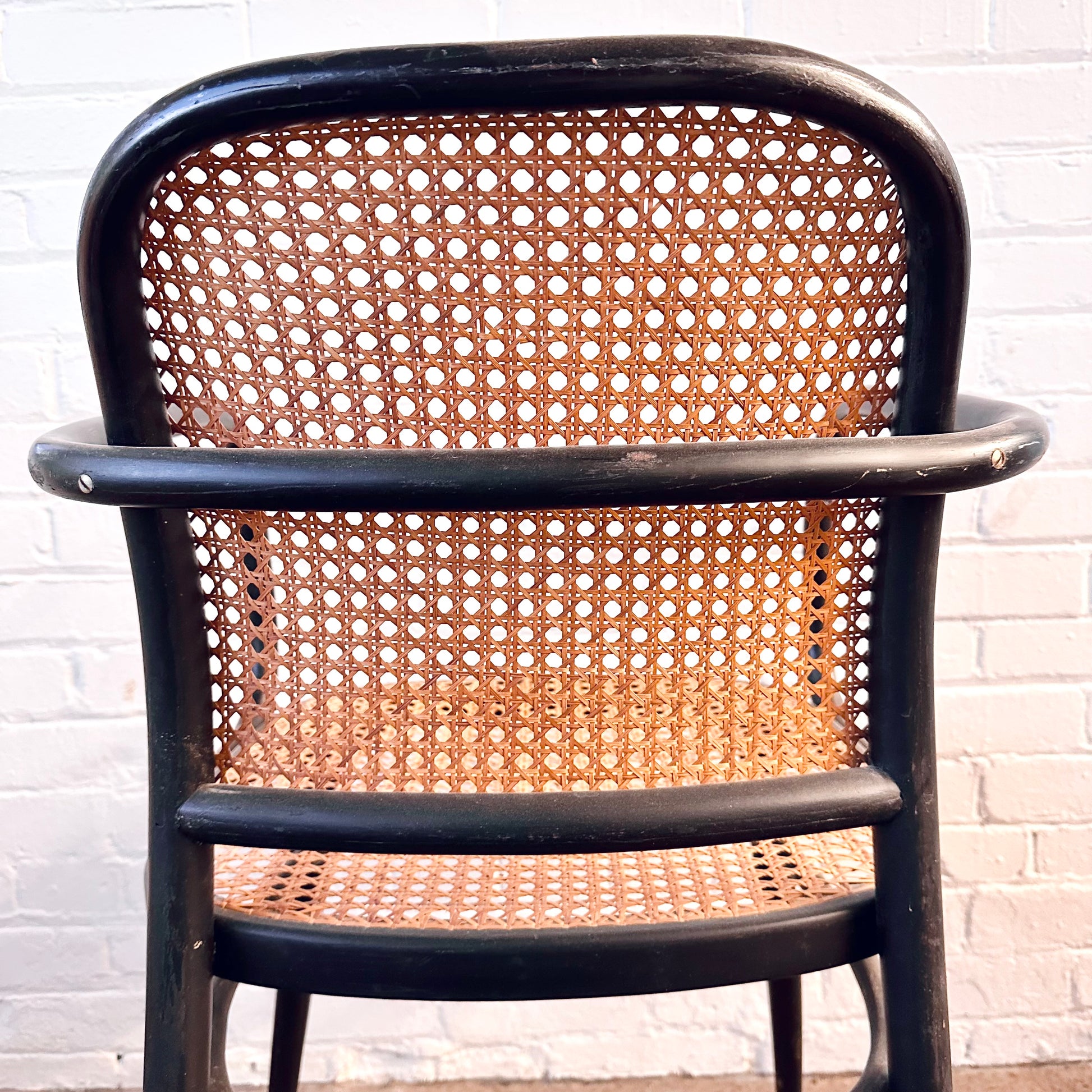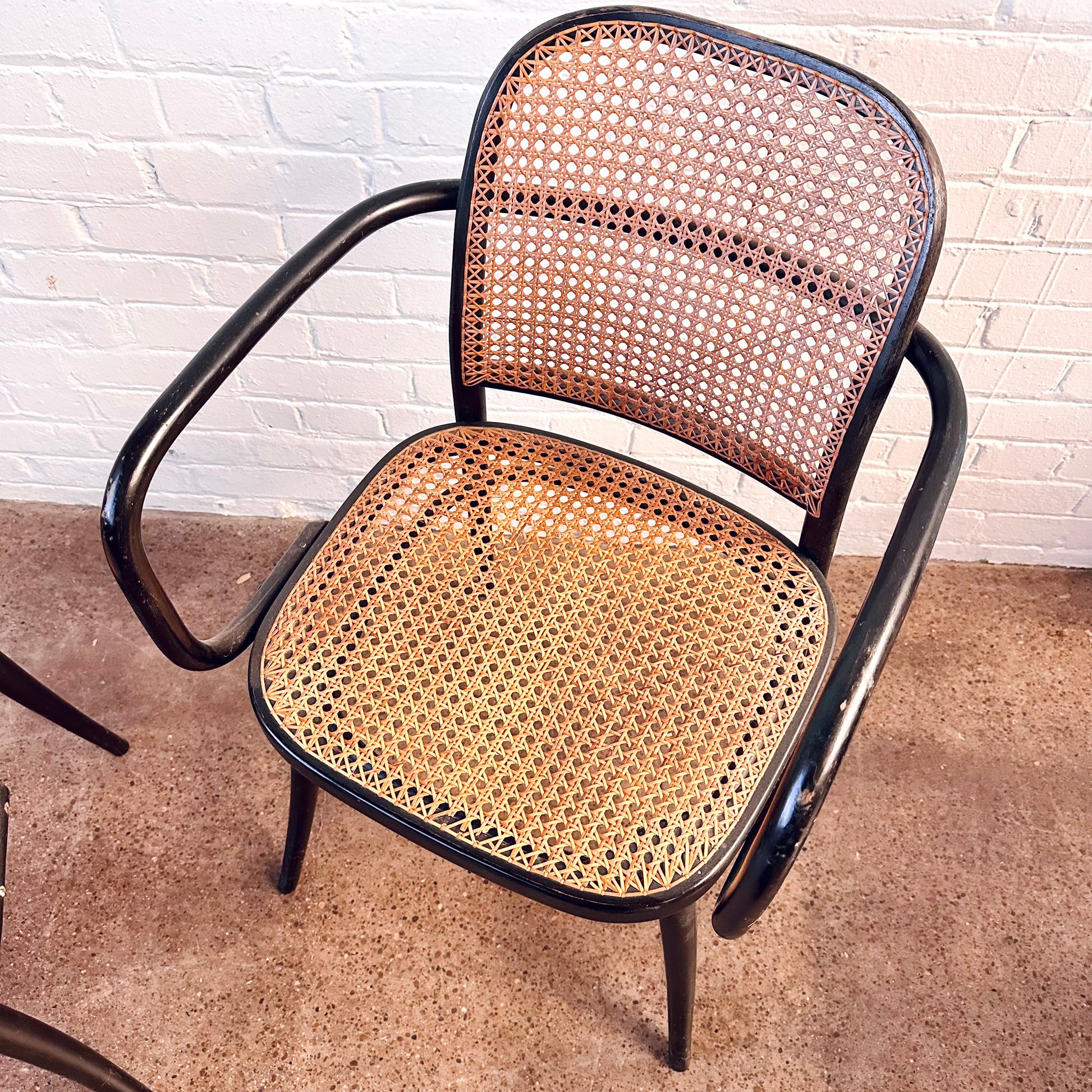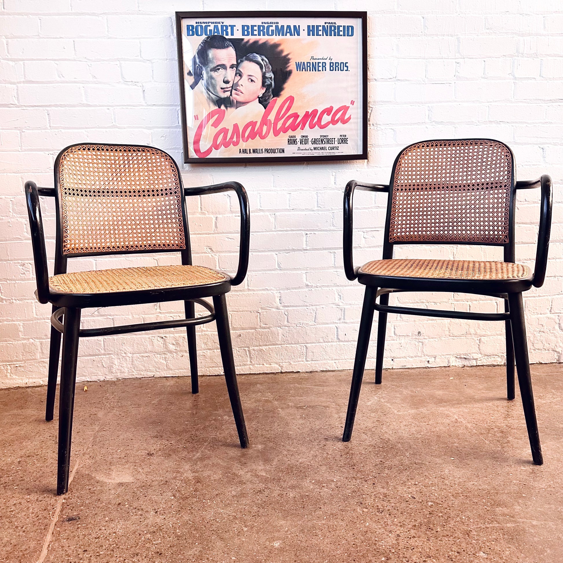 Josef Hoffman black bentwood and cane arm chairs, designed for Thonet. This pair of model No.811 chairs is attributed to the Austrian architects Josef Hoffman and Josef Frank. Marked made in Czechoslovakia circa 1960s.
