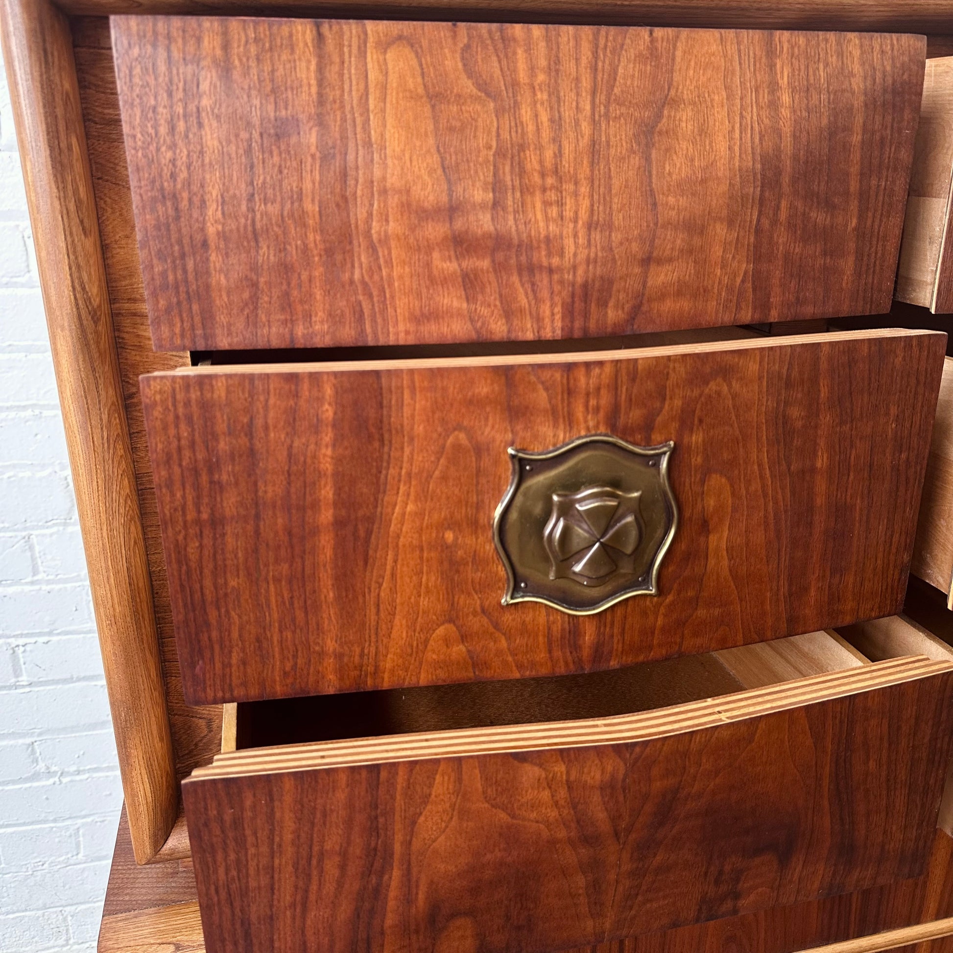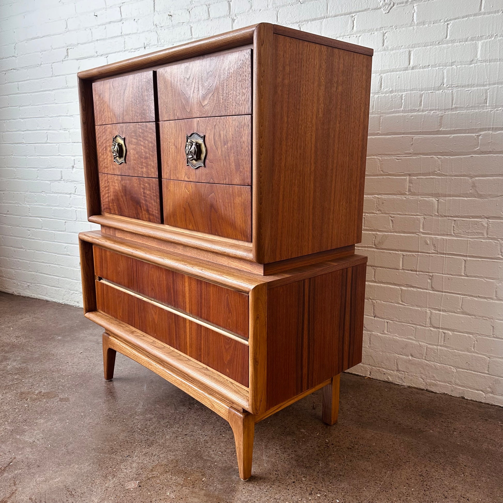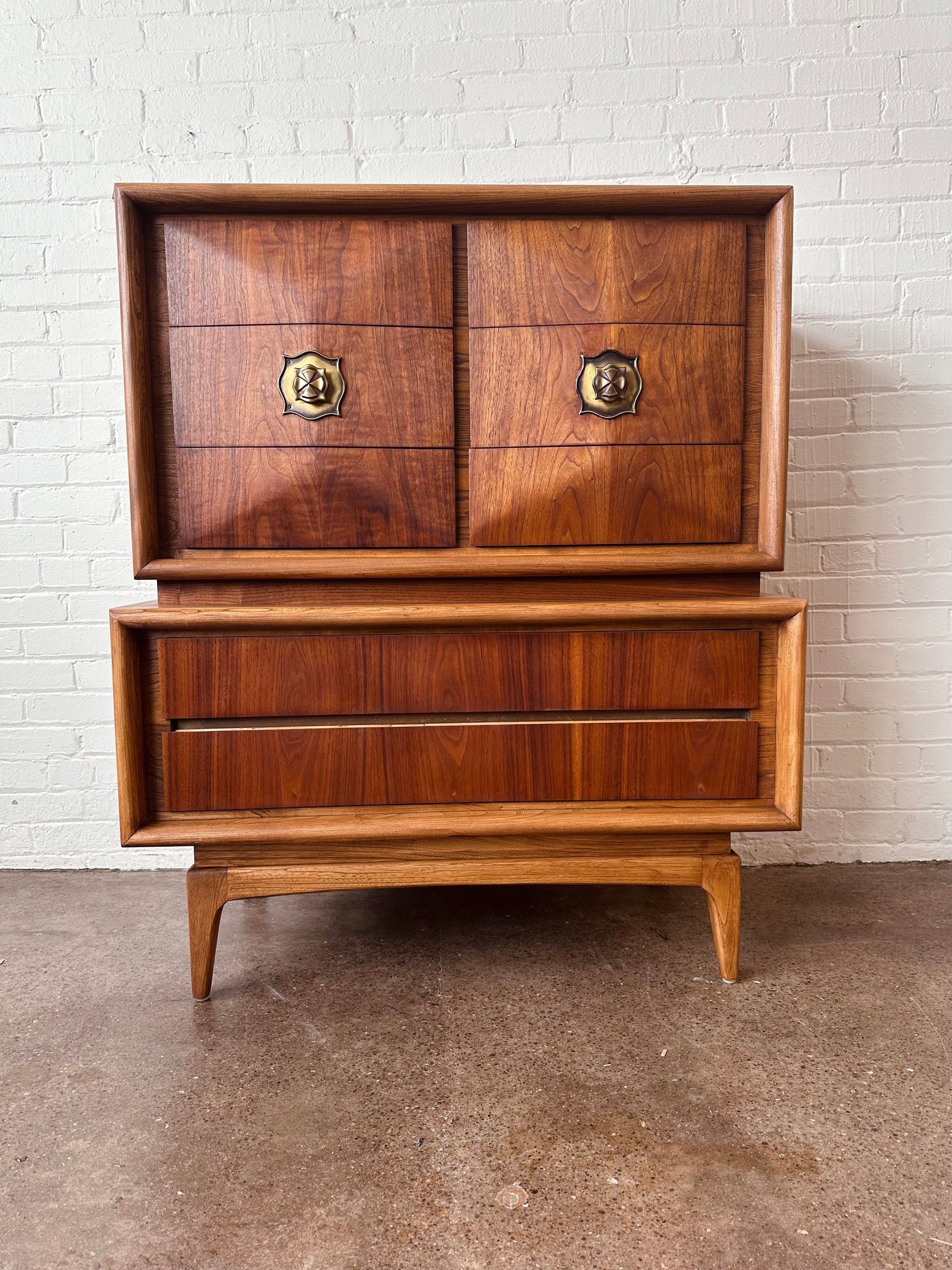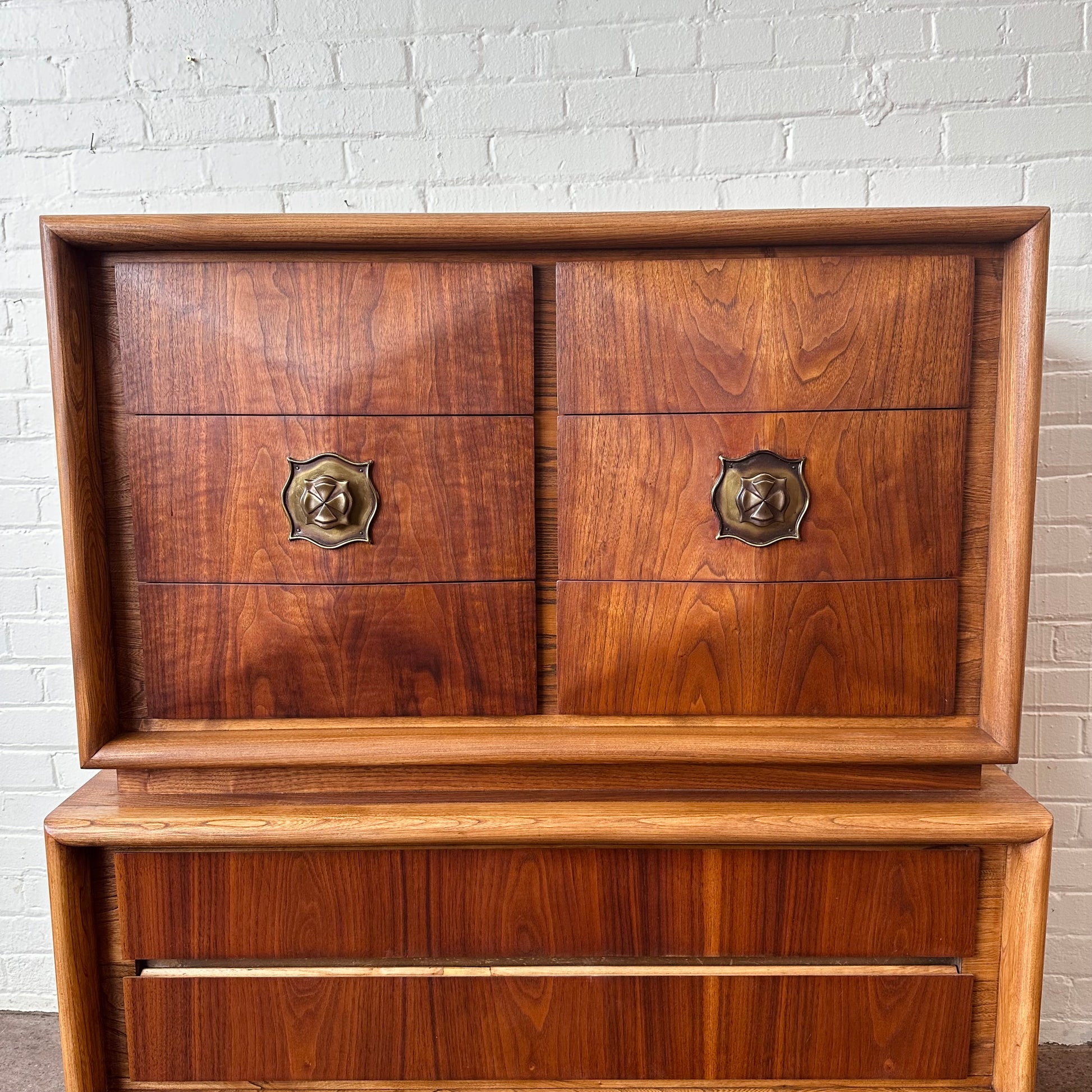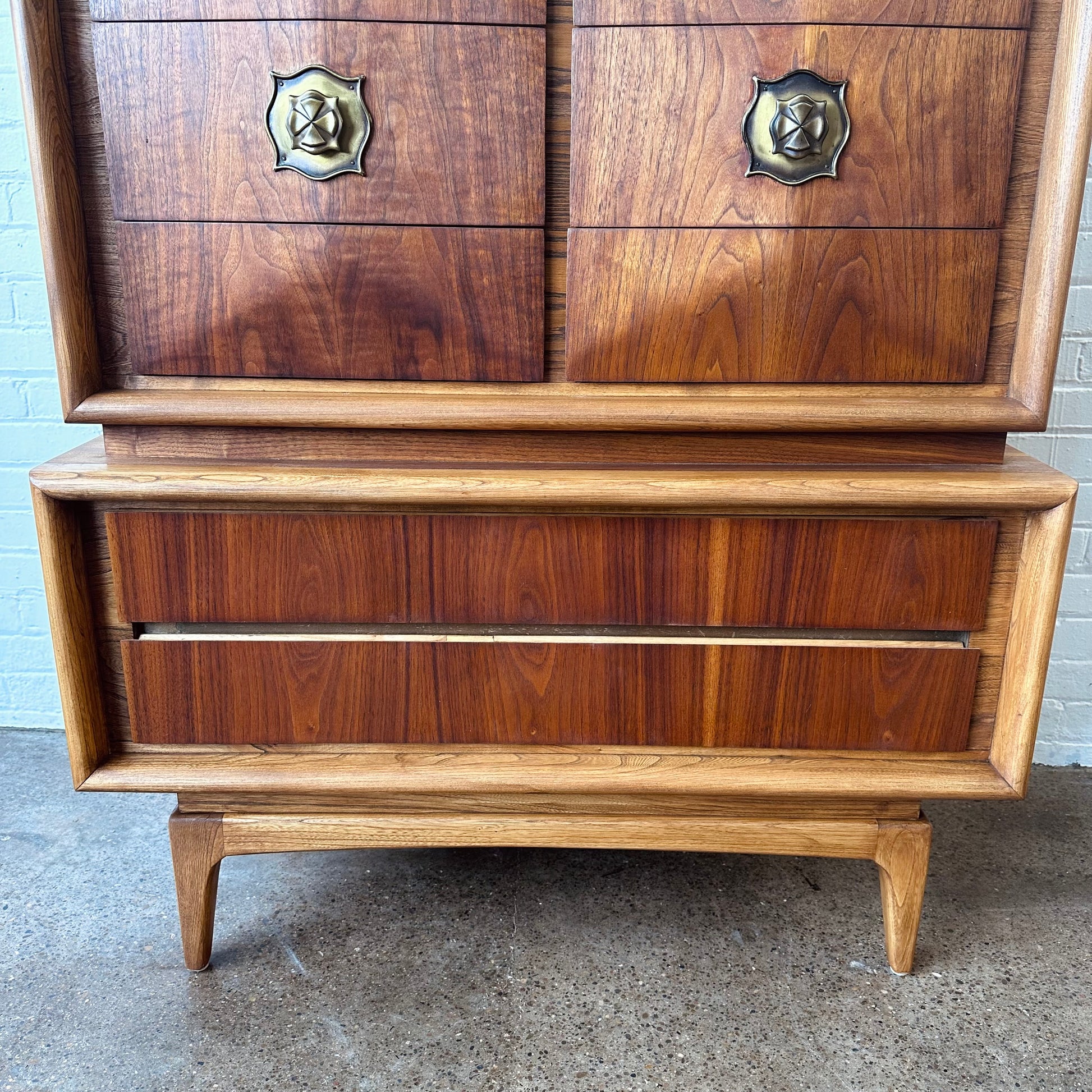 Mid-century walnut highboy chest of drawers with brass hardware by United. This dresser was recently professionally restored to reveal stunning high-quality walnut woodgrain, with a subtle two-tone with solid ash wood trim work, stretcher, and tapered legs. Features 6 top drawers with sculptural diamond shaped angled reliefs and original brass drawer pulls on two center drawers. Two long drawers in lower portion. This is one full piece and the top portion does not come off.