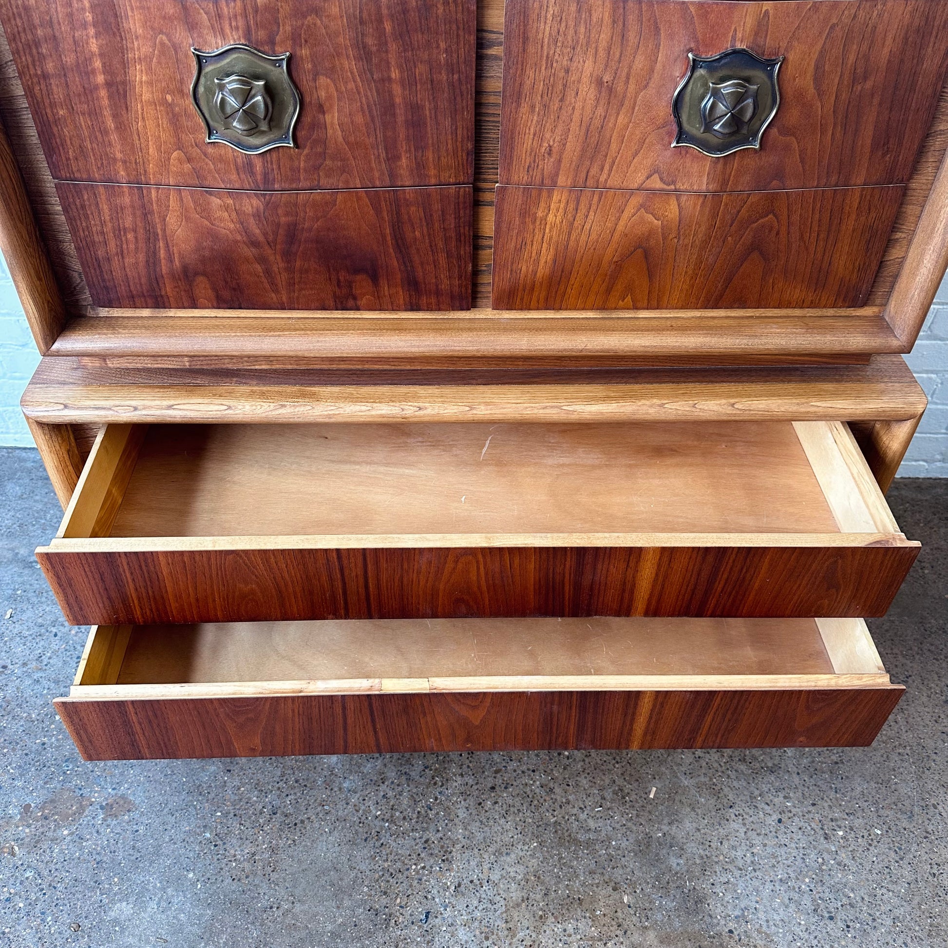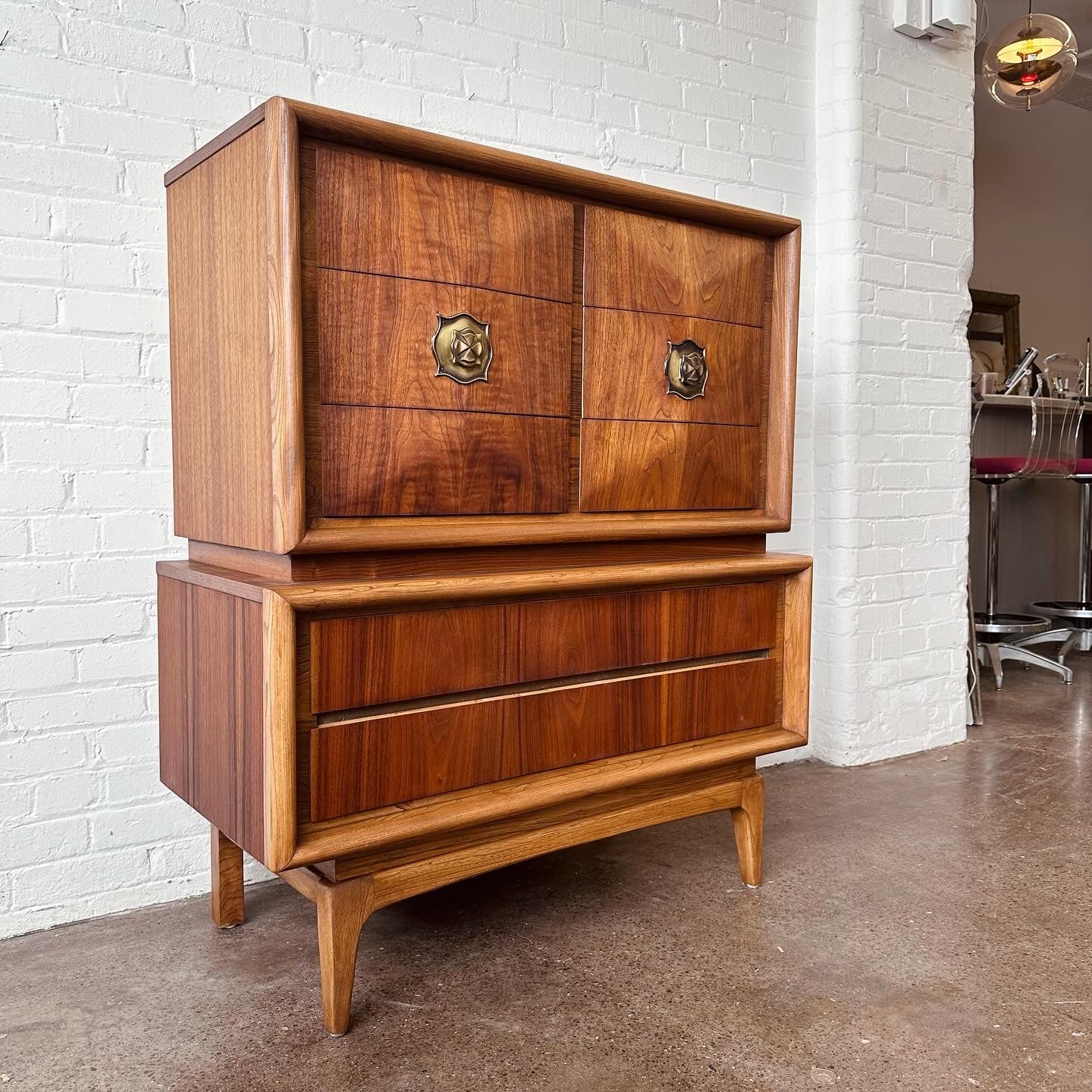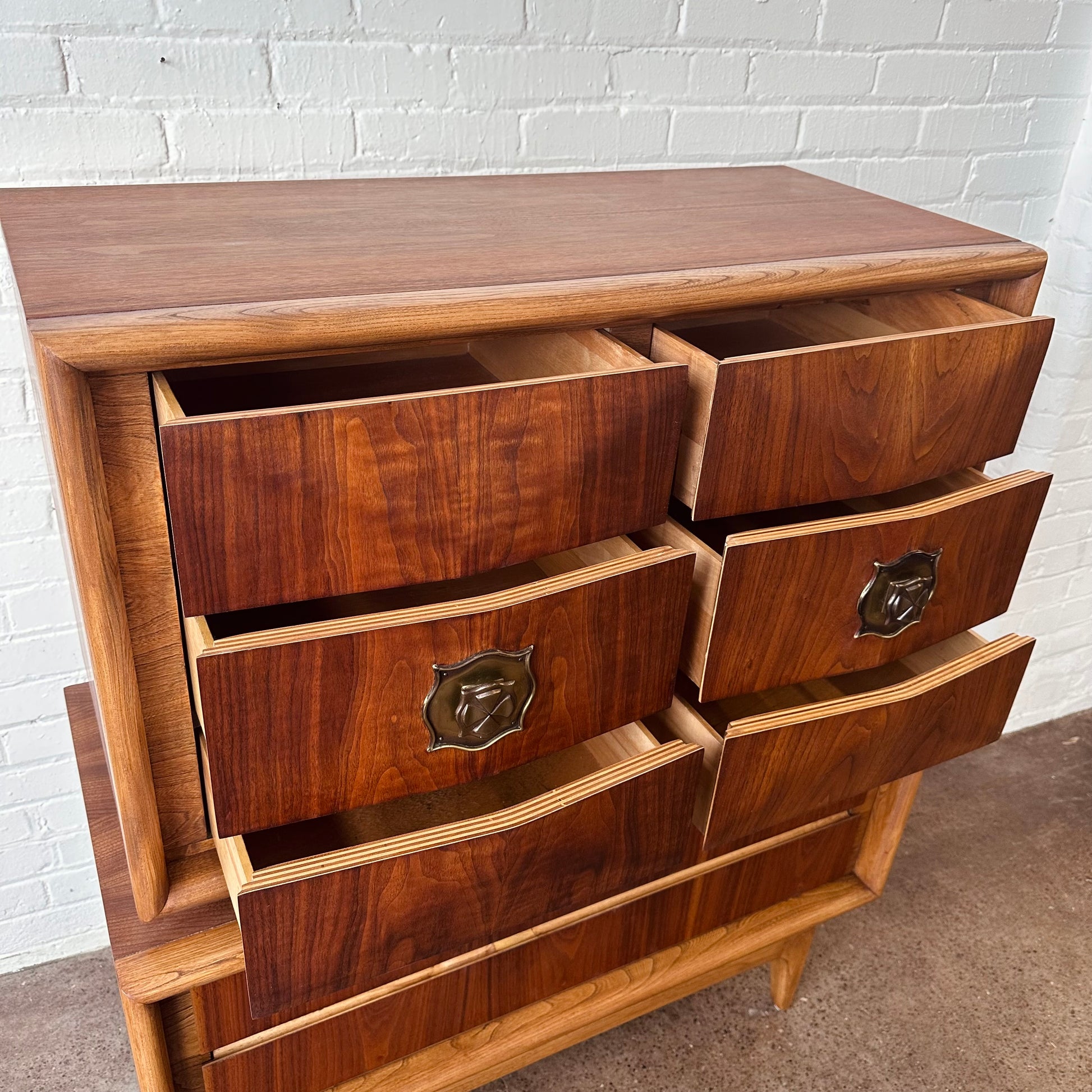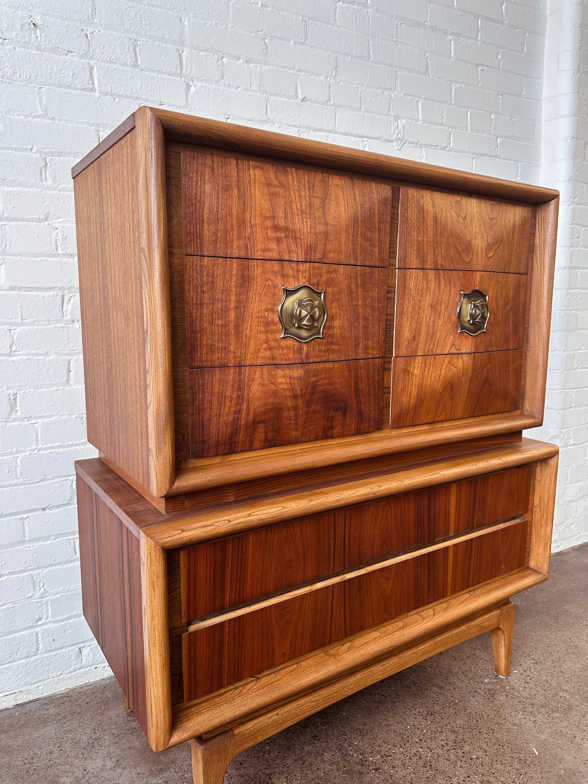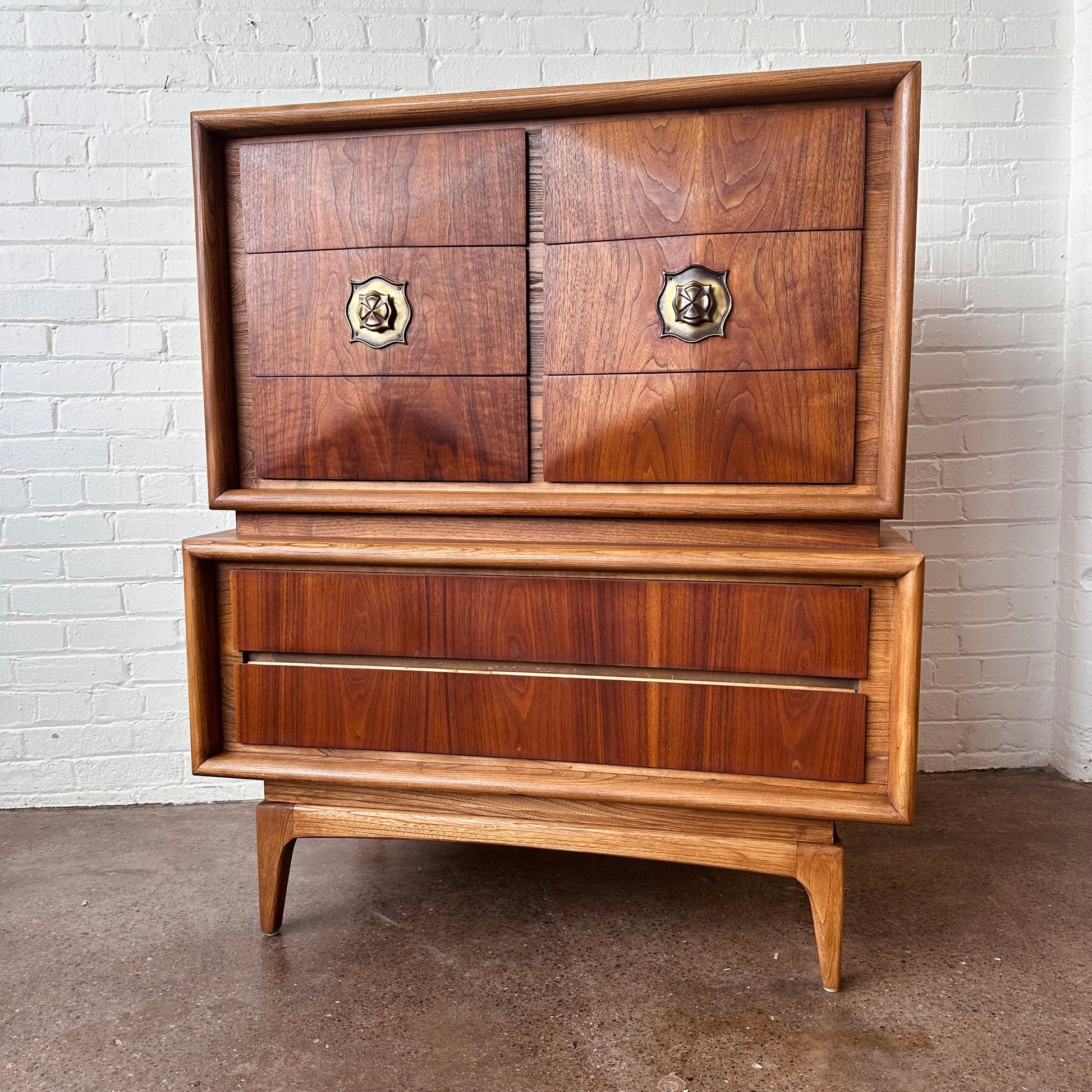 Mid-century walnut highboy chest of drawers with brass hardware by United. This dresser was recently professionally restored to reveal stunning high-quality walnut woodgrain, with a subtle two-tone with solid ash wood trim work, stretcher, and tapered legs. Features 6 top drawers with sculptural diamond shaped angled reliefs and original brass drawer pulls on two center drawers. Two long drawers in lower portion. This is one full piece and the top portion does not come off.