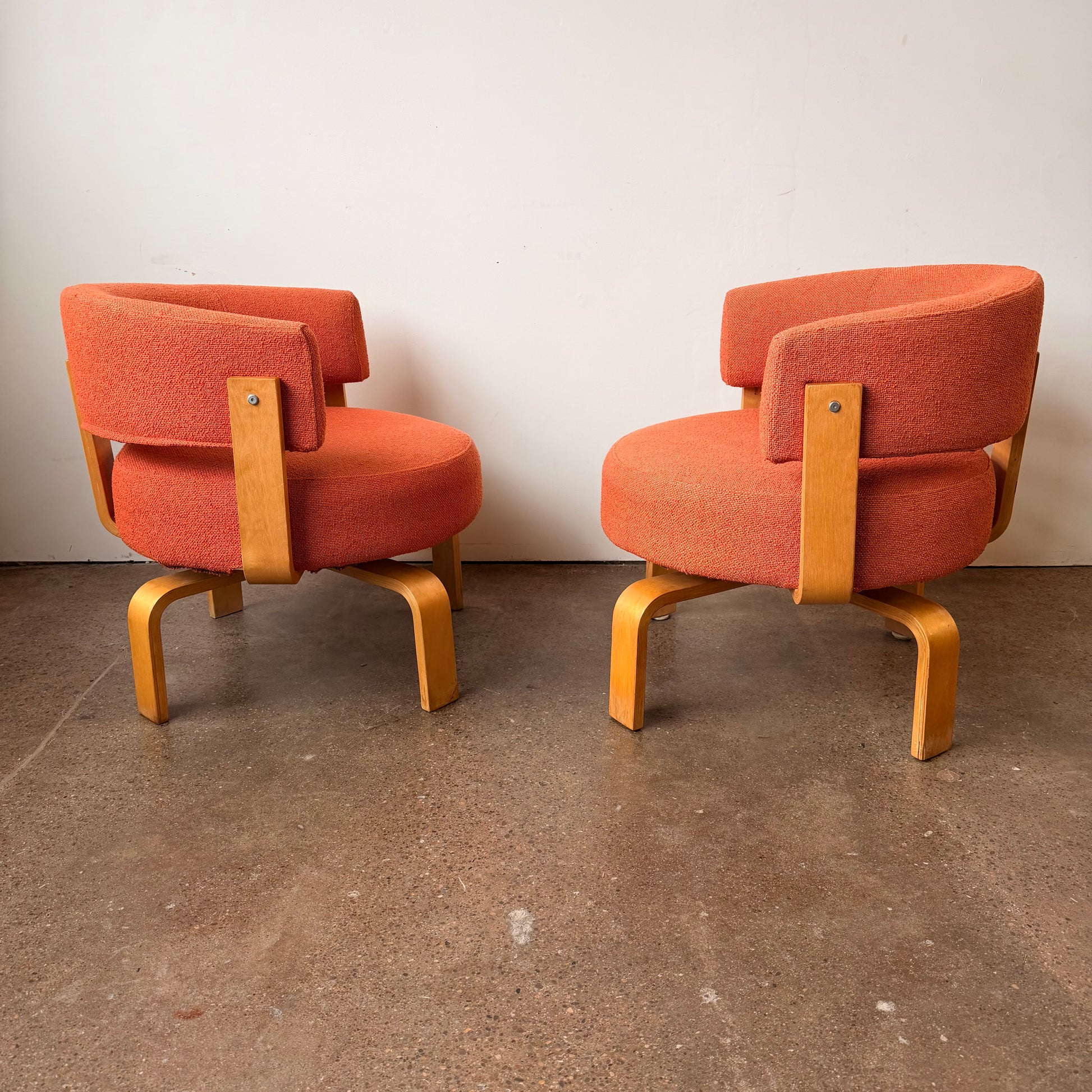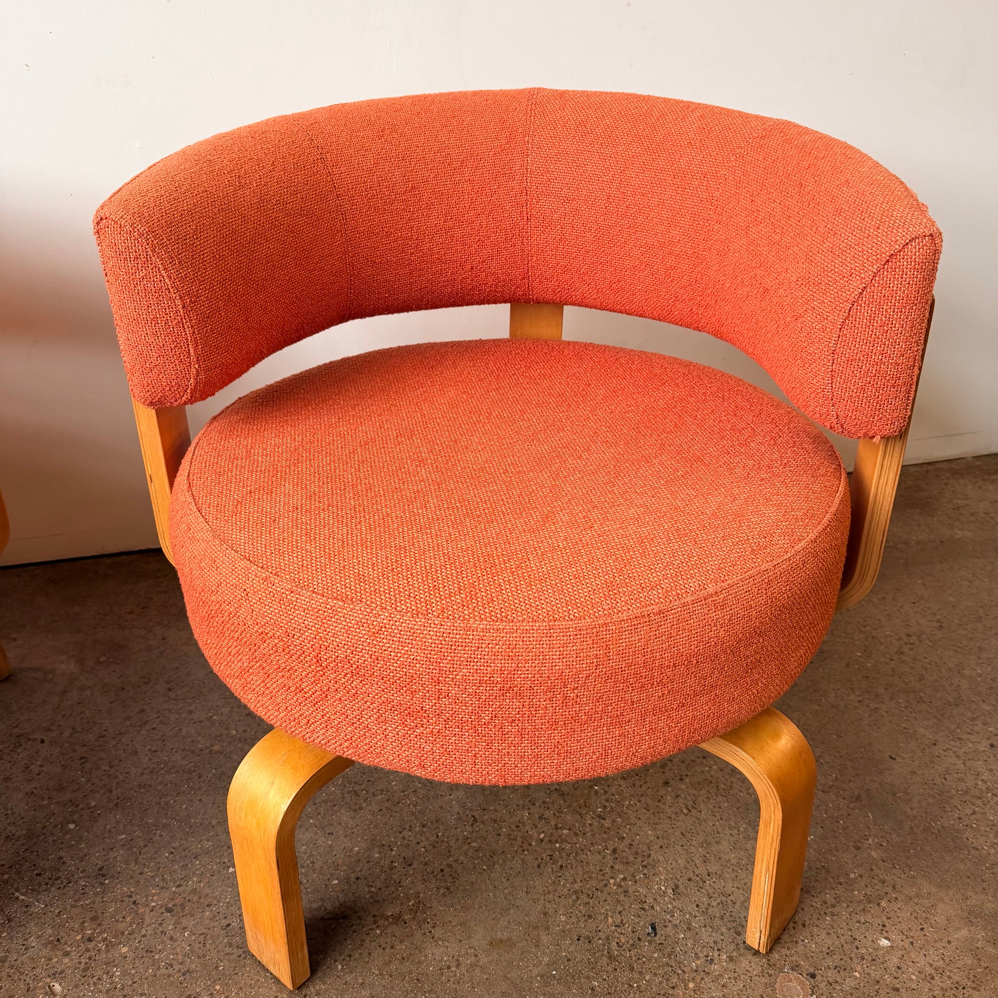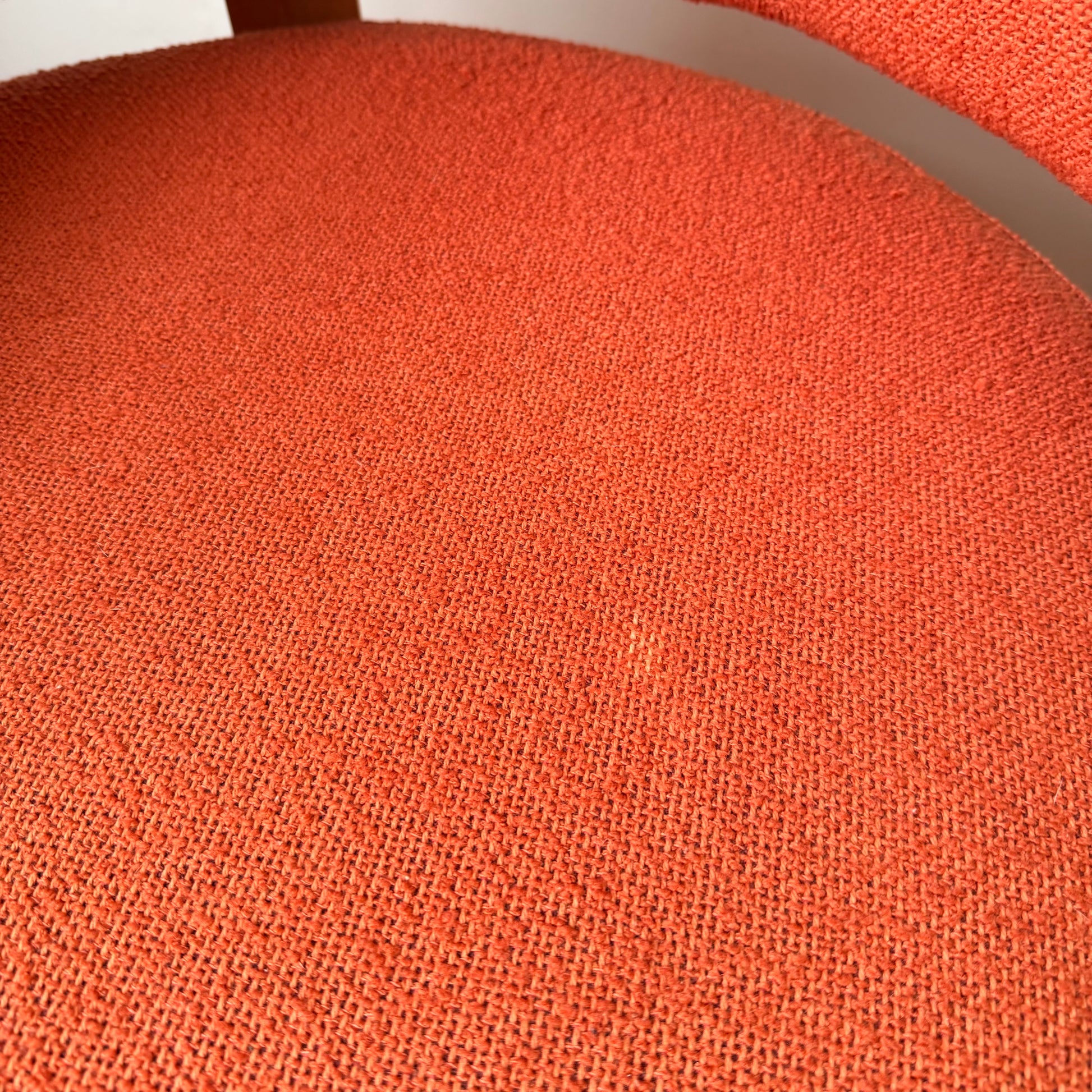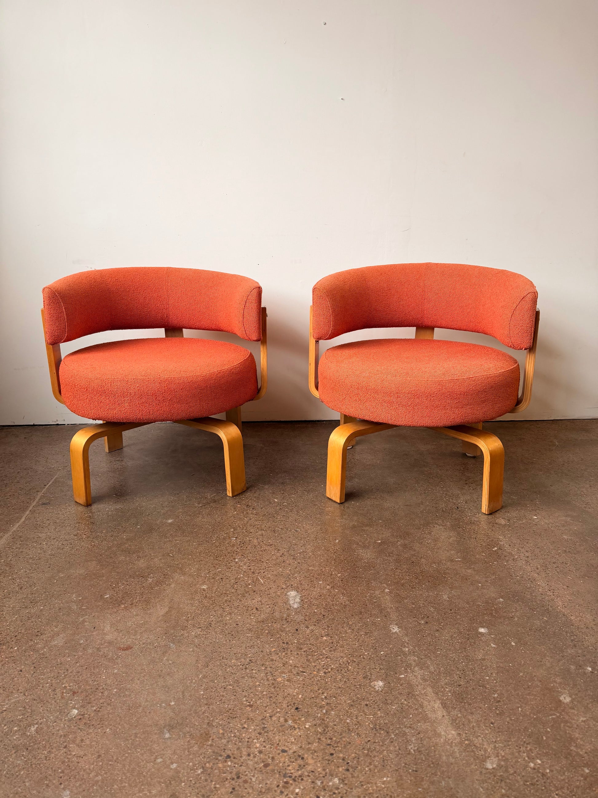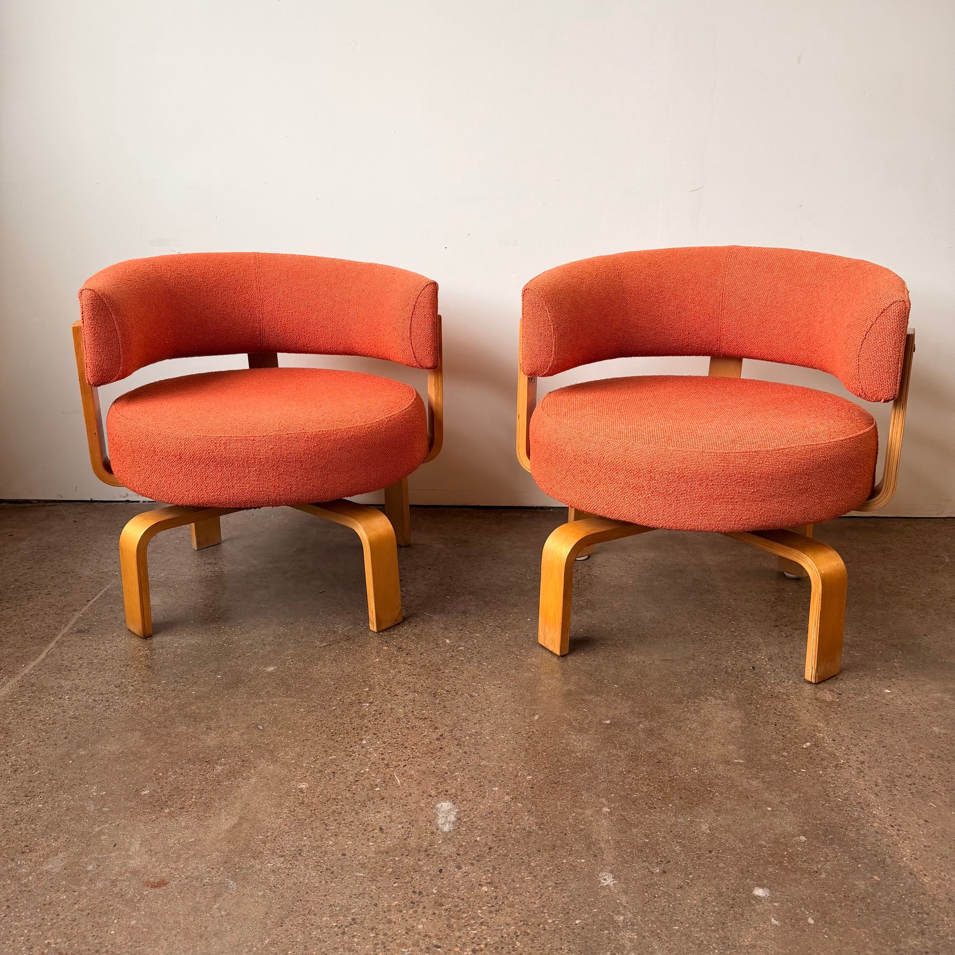 Set Fridene swivel armchairs , a modernist style and comfortable set of chairs, designed by Finnish designer Carina Bengs, and manufactured by IKEA in the early 2000s. The chairs have a beautiful warm orange tweed original fabric and bentwood frames.