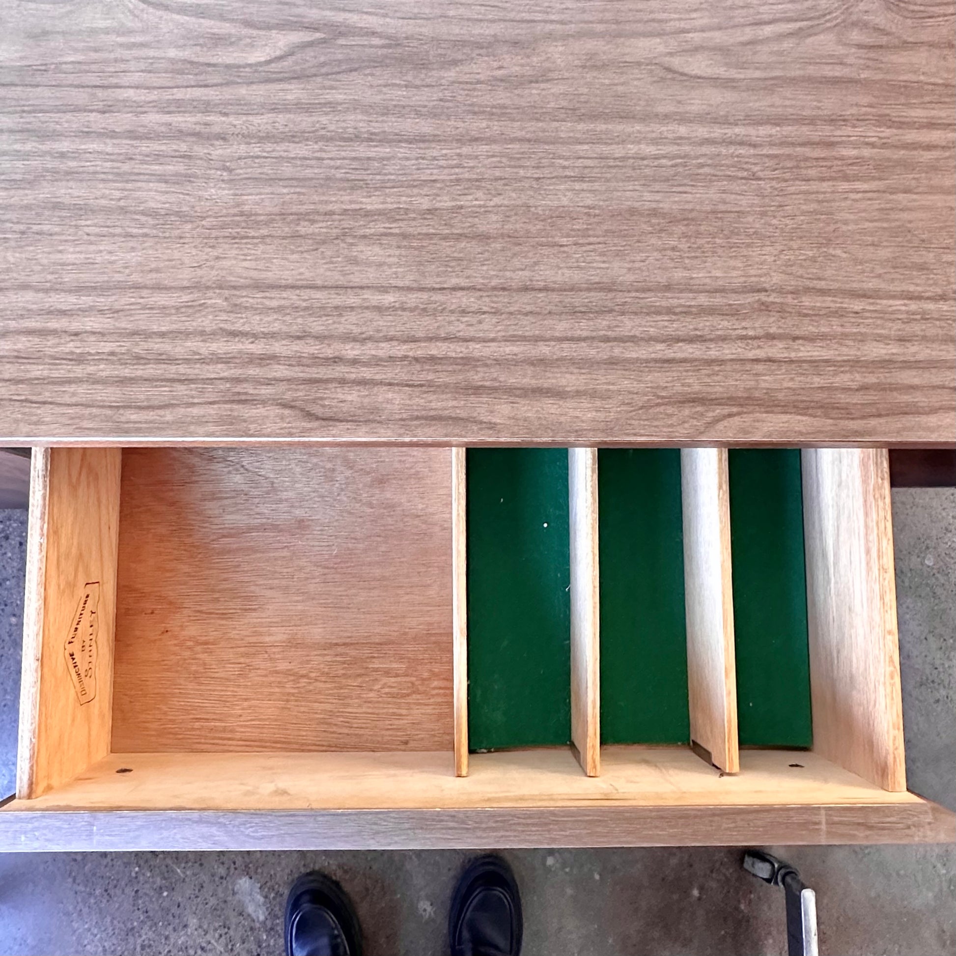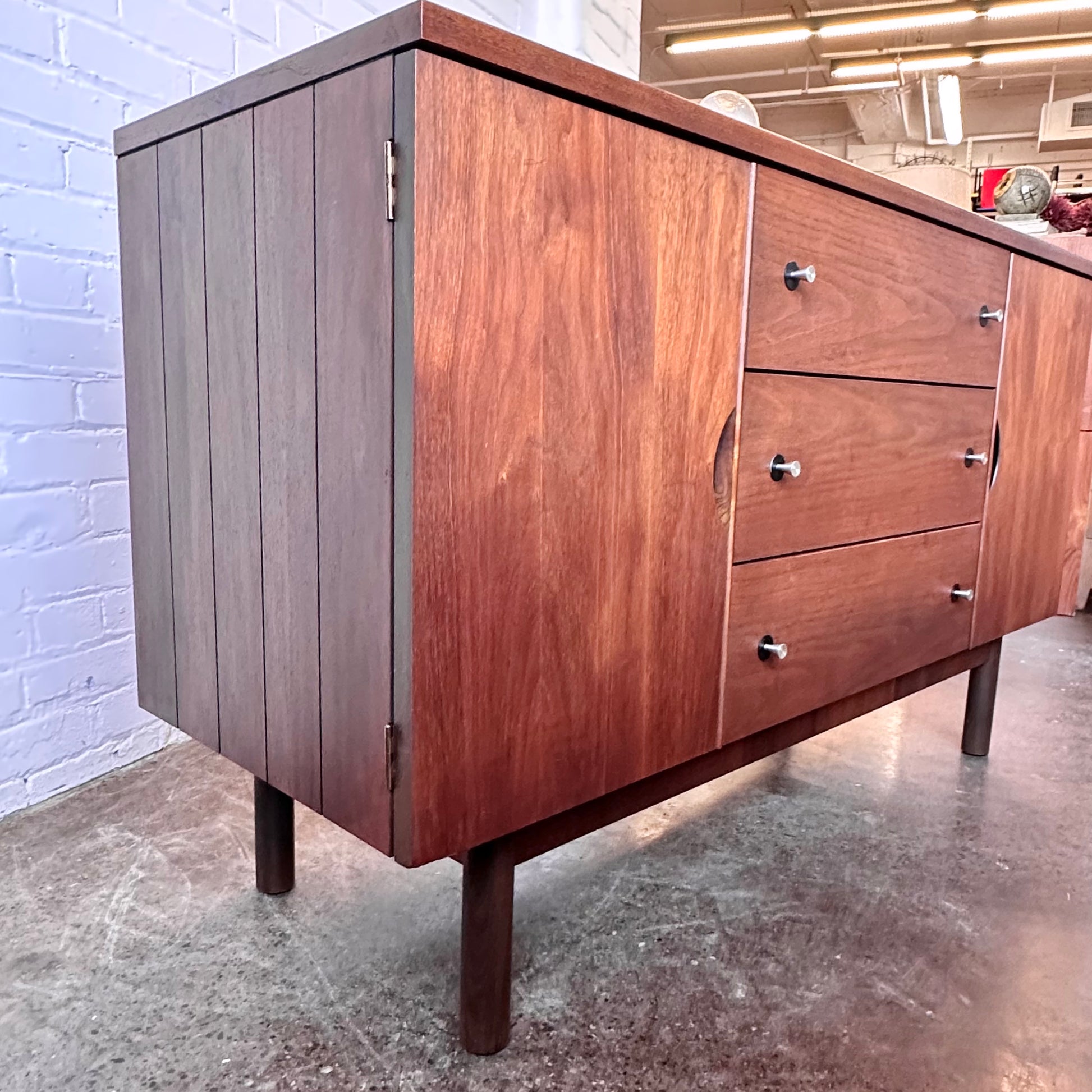 Petite mid-Century walnut credenza produced by Stanley Distinctive Furniture circa 1960s. Features two cabinets flanking a bank of three drawers with felt-lined flatware compartments in top drawer. Resting on solid walnut cylinder shaped legs and topped with a faux wood grained Formica laminate.